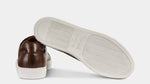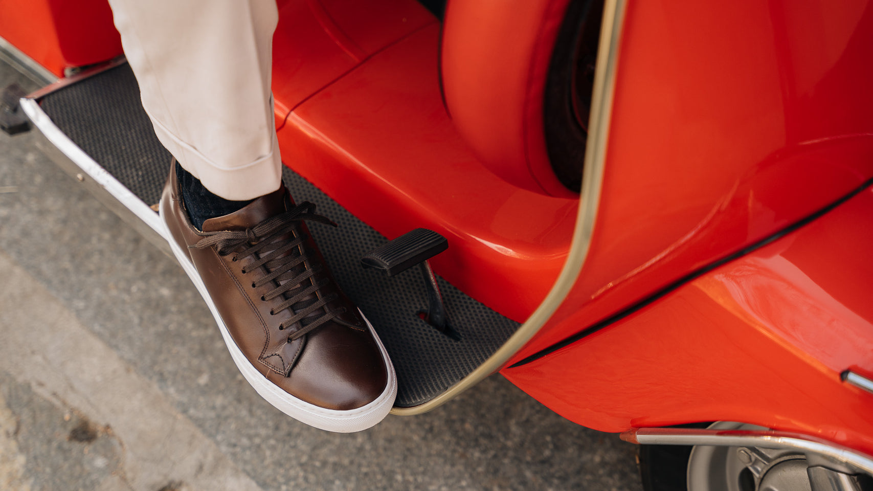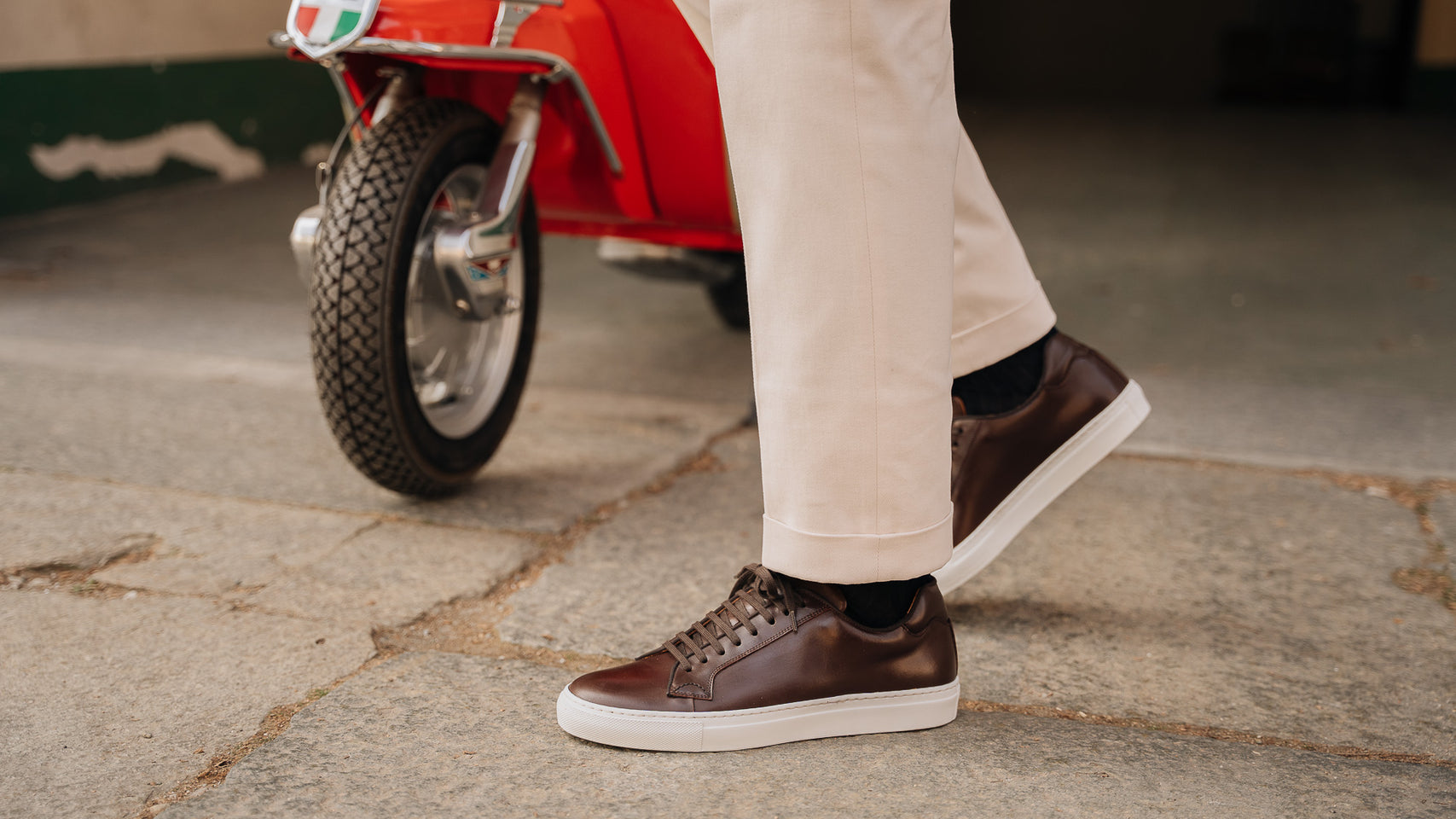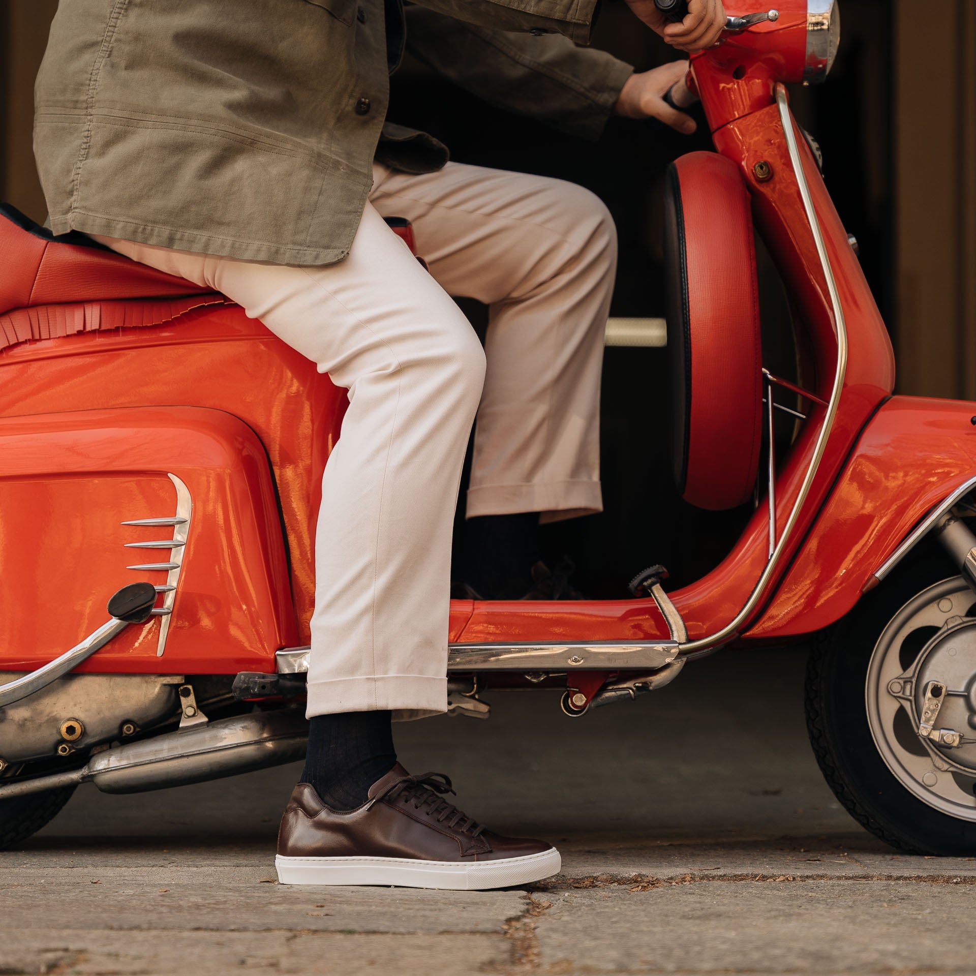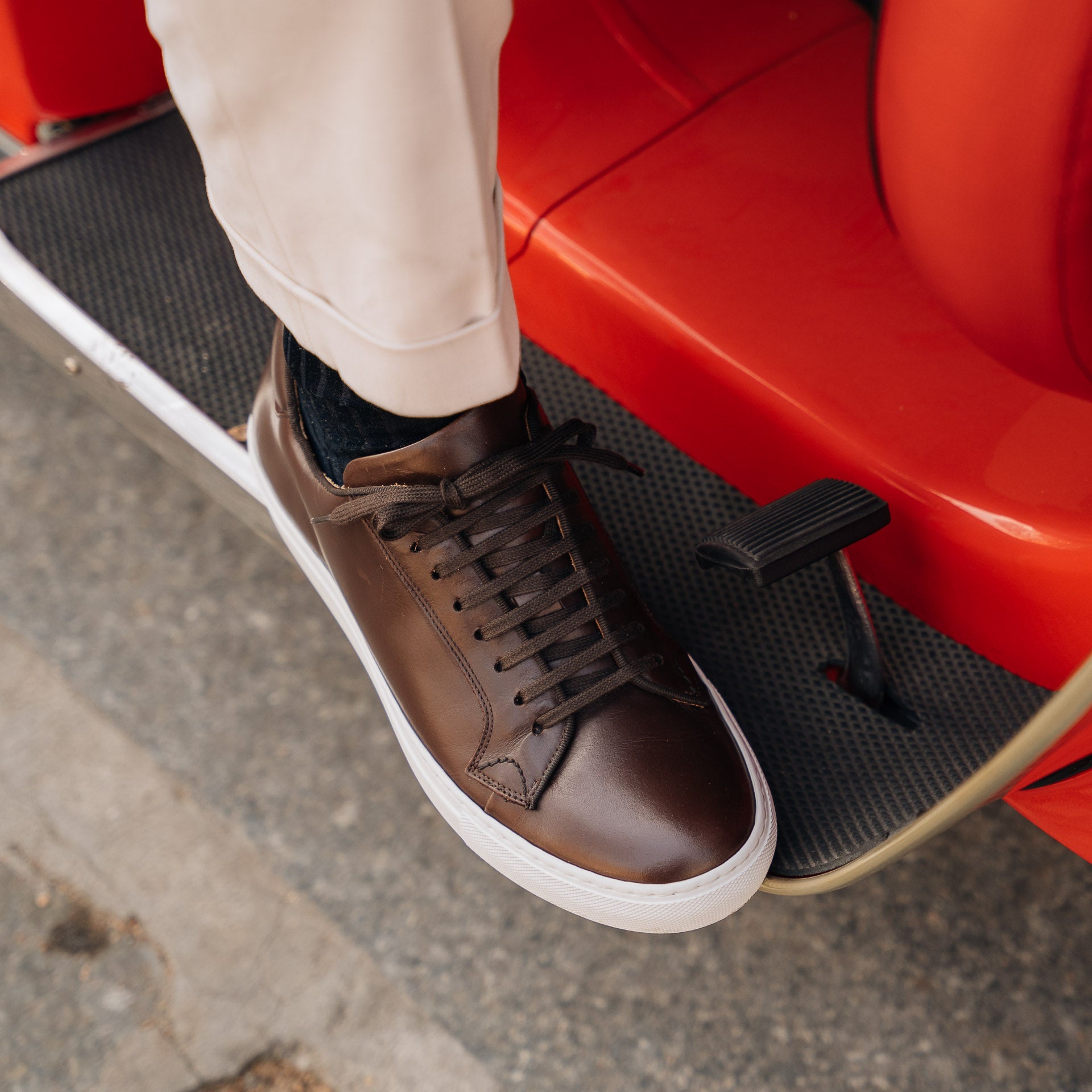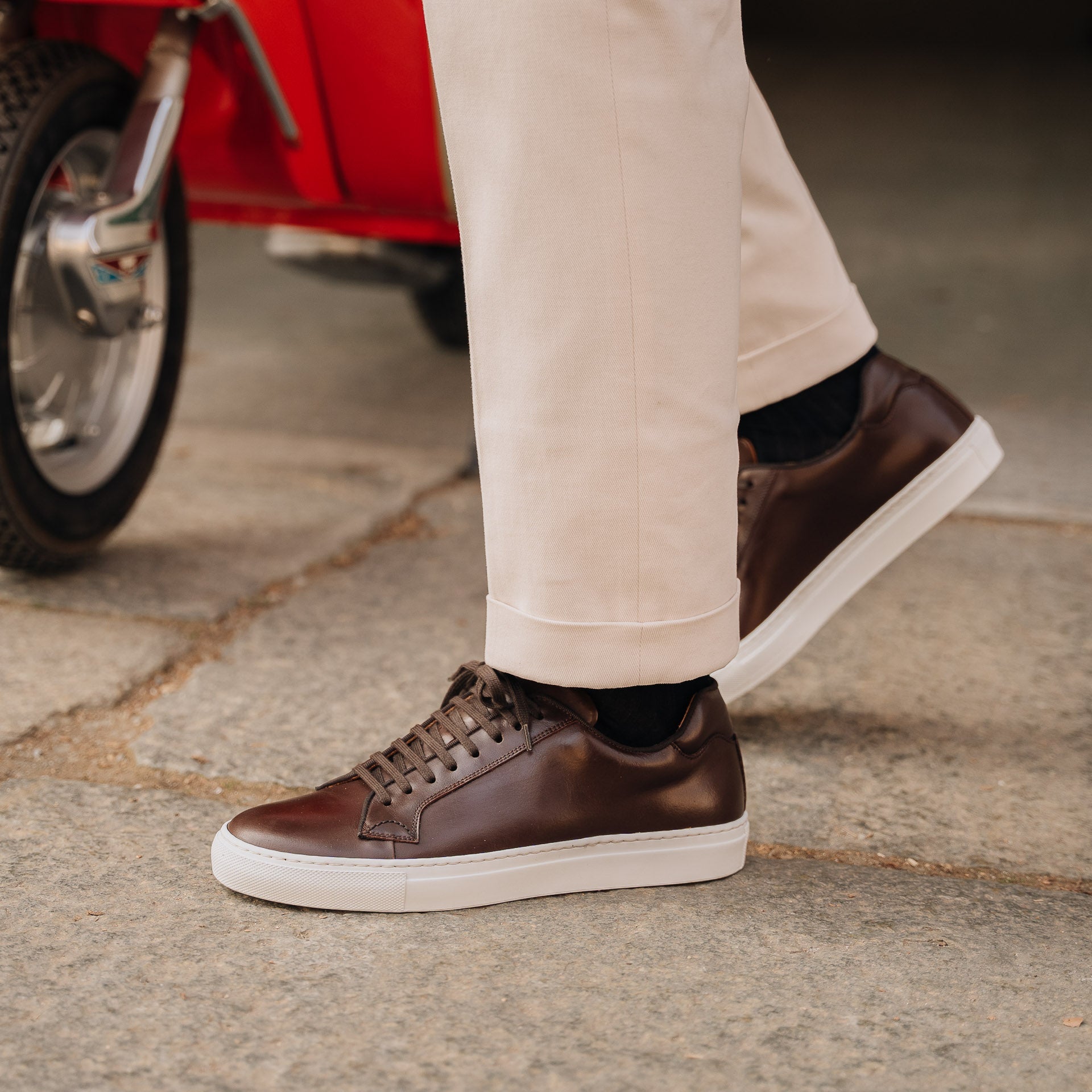 Sneakers with elegant lines that always find the right occasion to complement your look. Made from smooth calfskin leather with a rubber sole, they make your sportswear outfits impeccable and your days in a suit memorable. We styled them with a white t-shirt, light merino crew-neck, field jacket and cotton trousers.