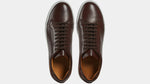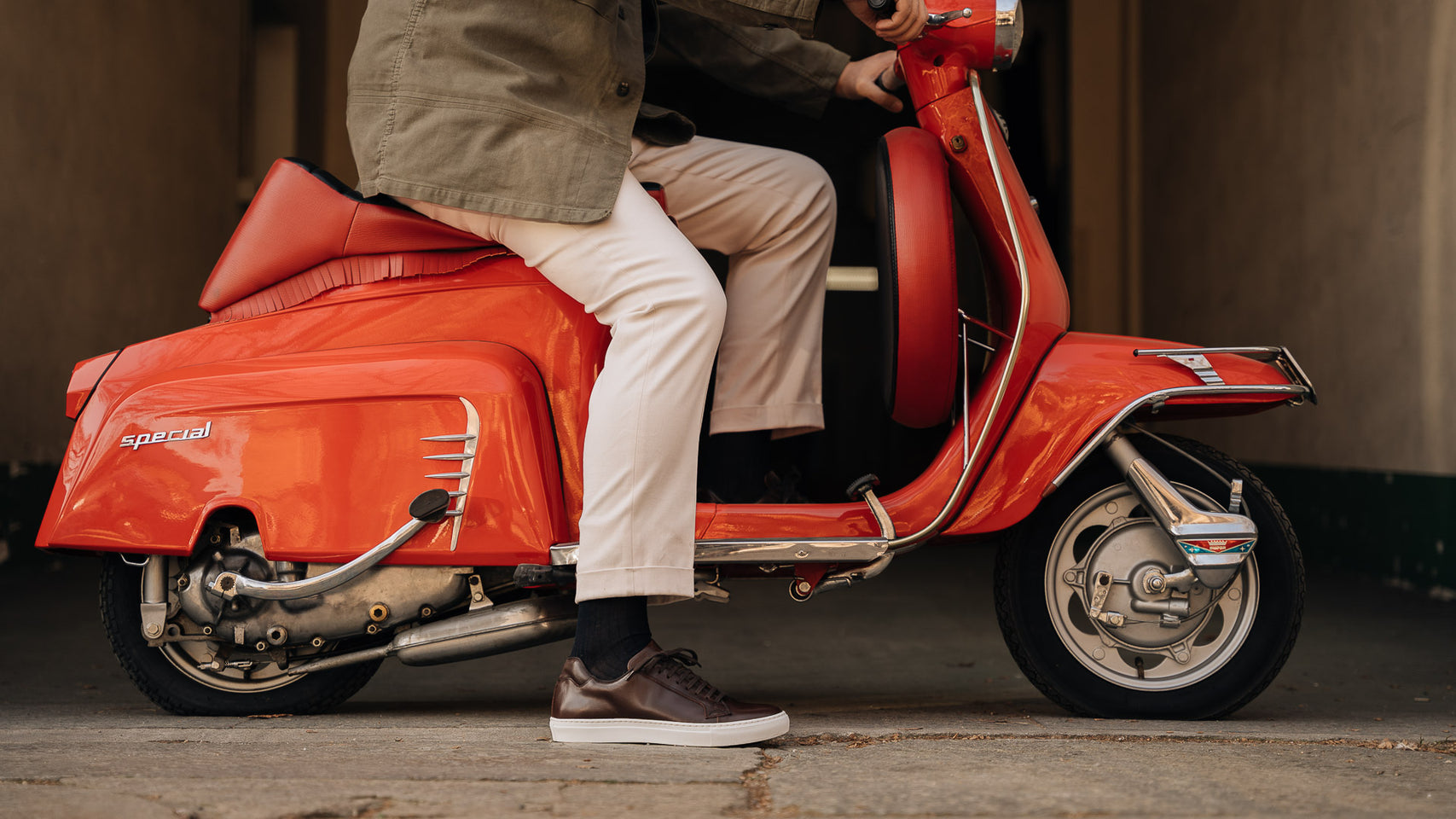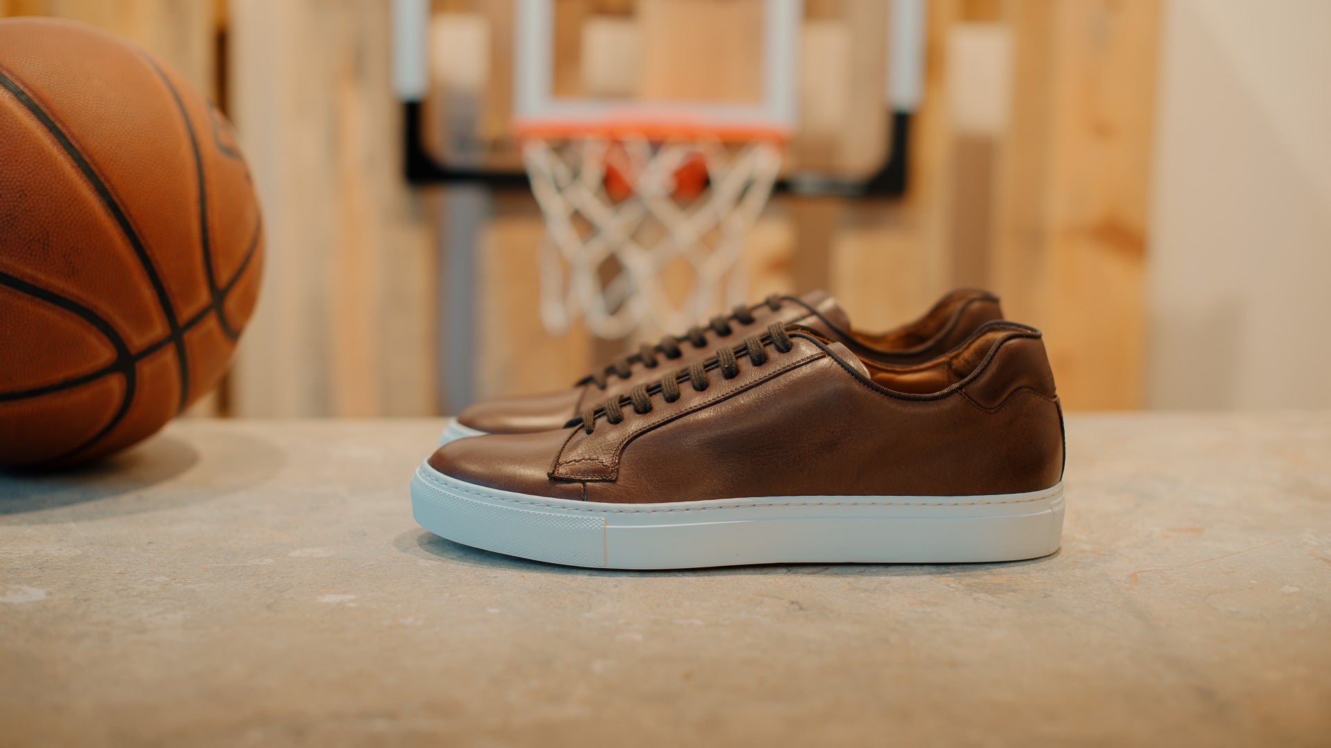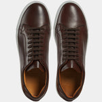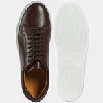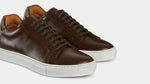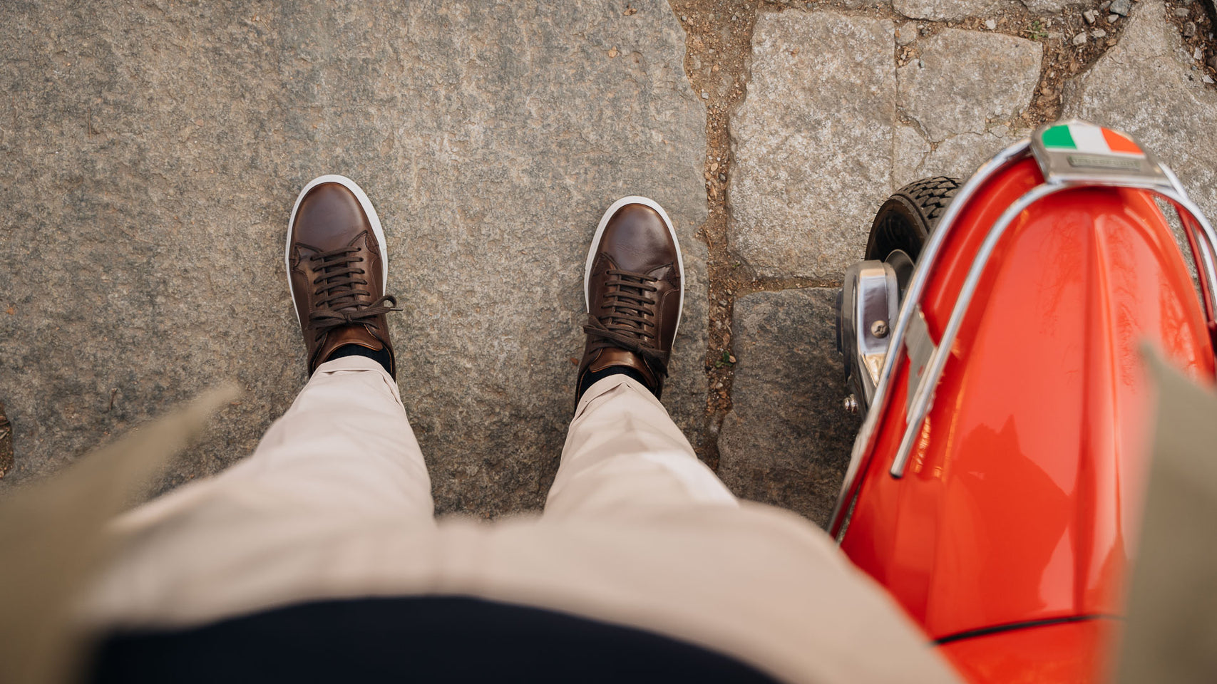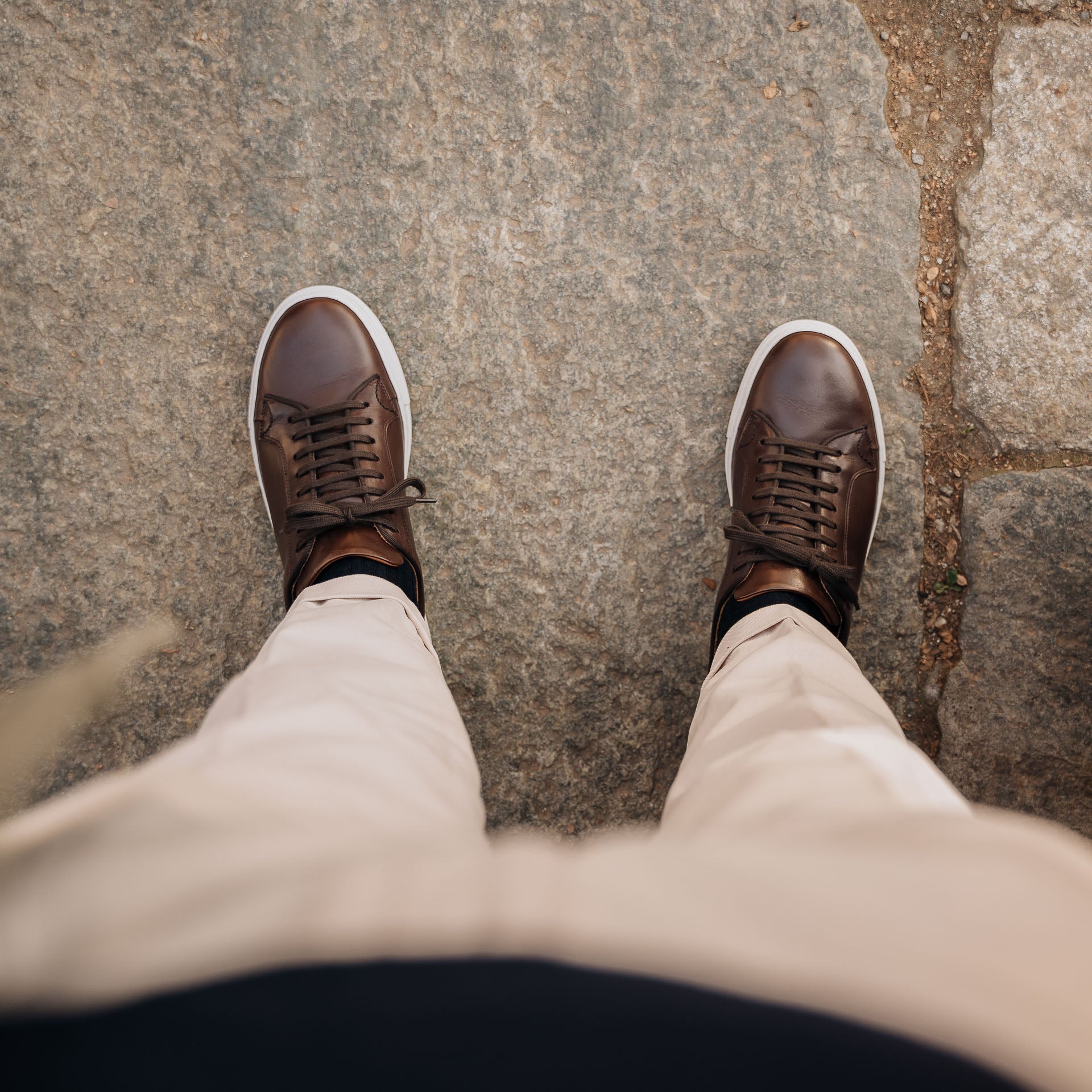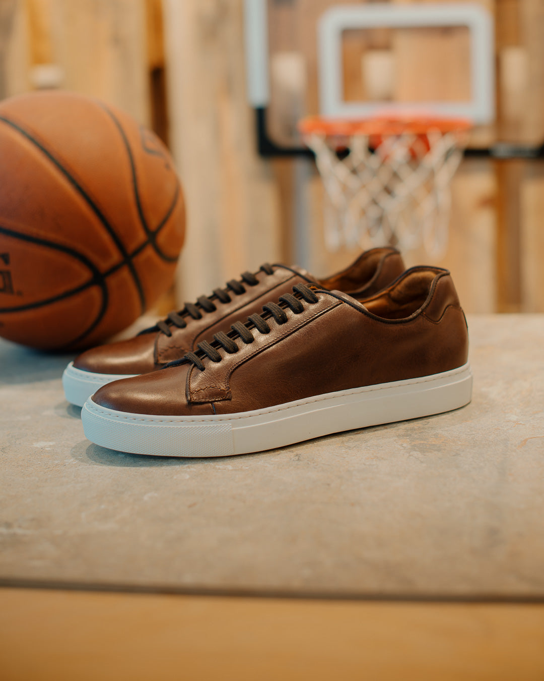 Sneakers with elegant lines that always find the right occasion to complement your look. Made from smooth calfskin leather with a rubber sole, they make your sportswear outfits impeccable and your days in a suit memorable. We styled them with a white t-shirt, light merino crew-neck, field jacket and cotton trousers.