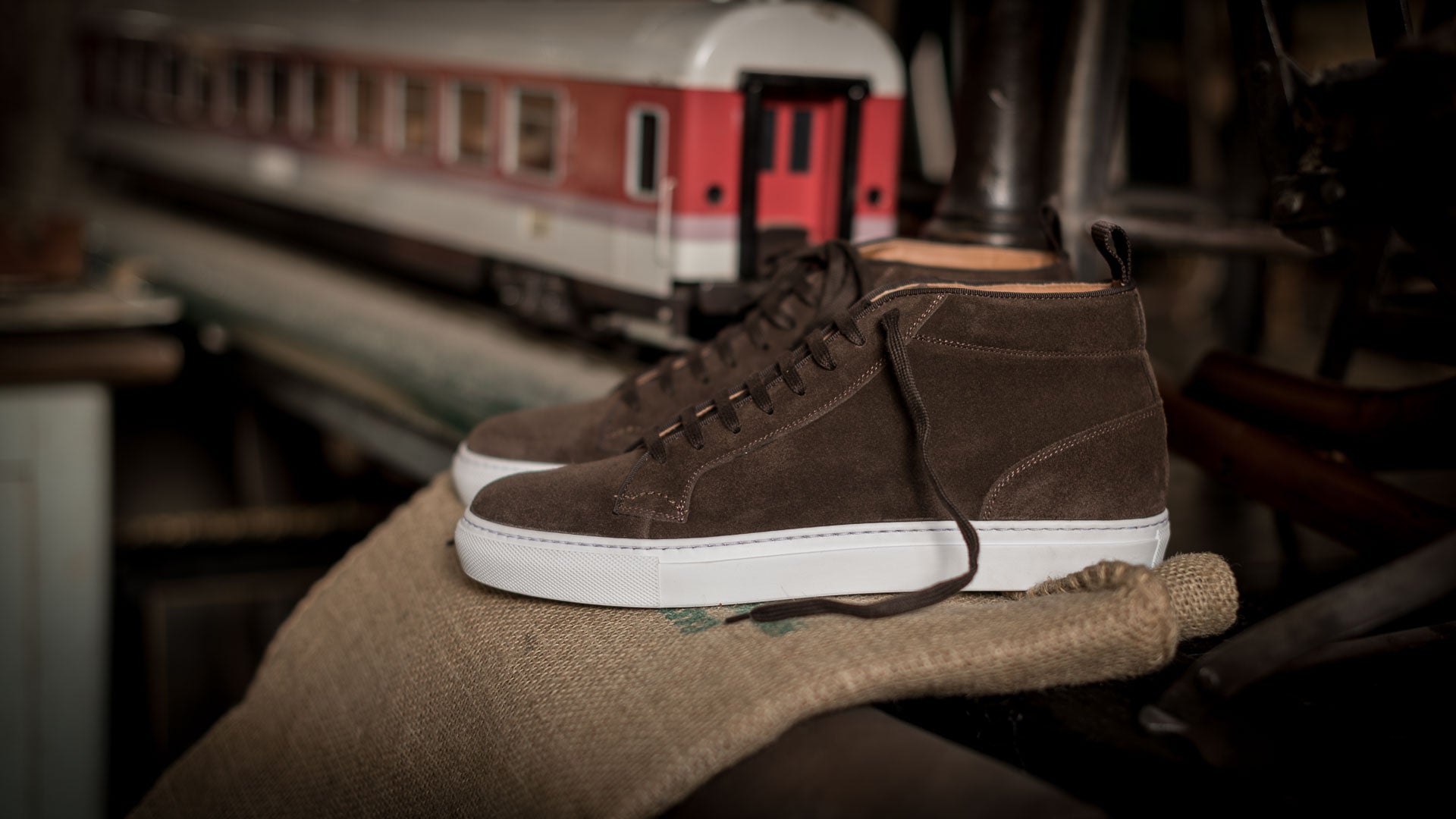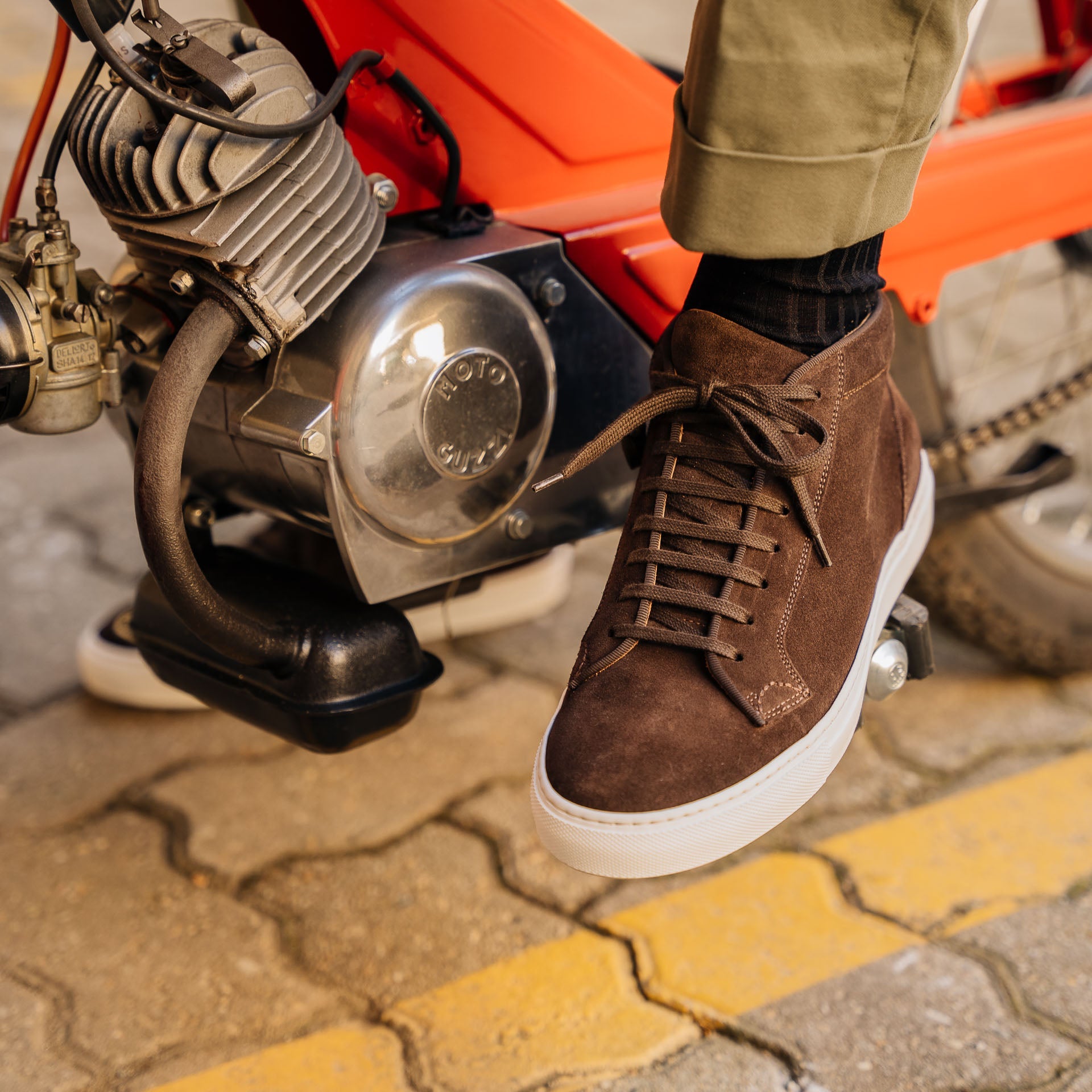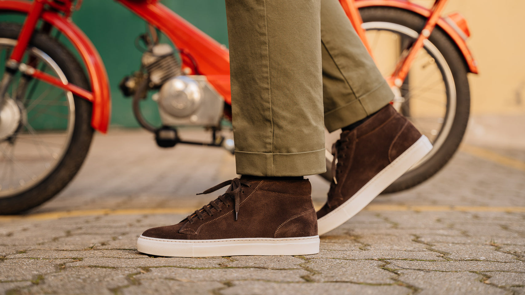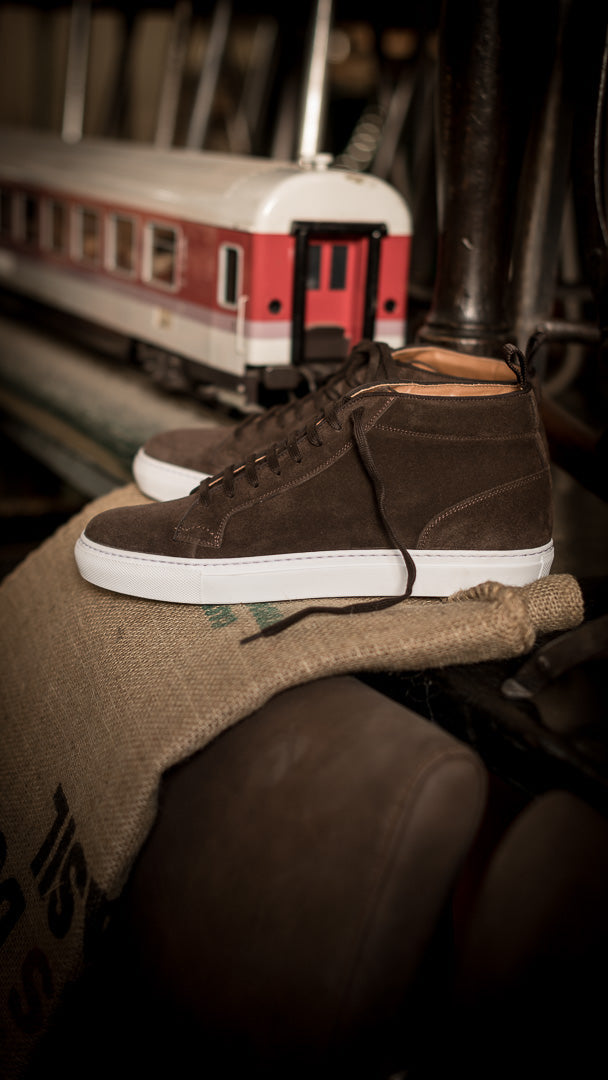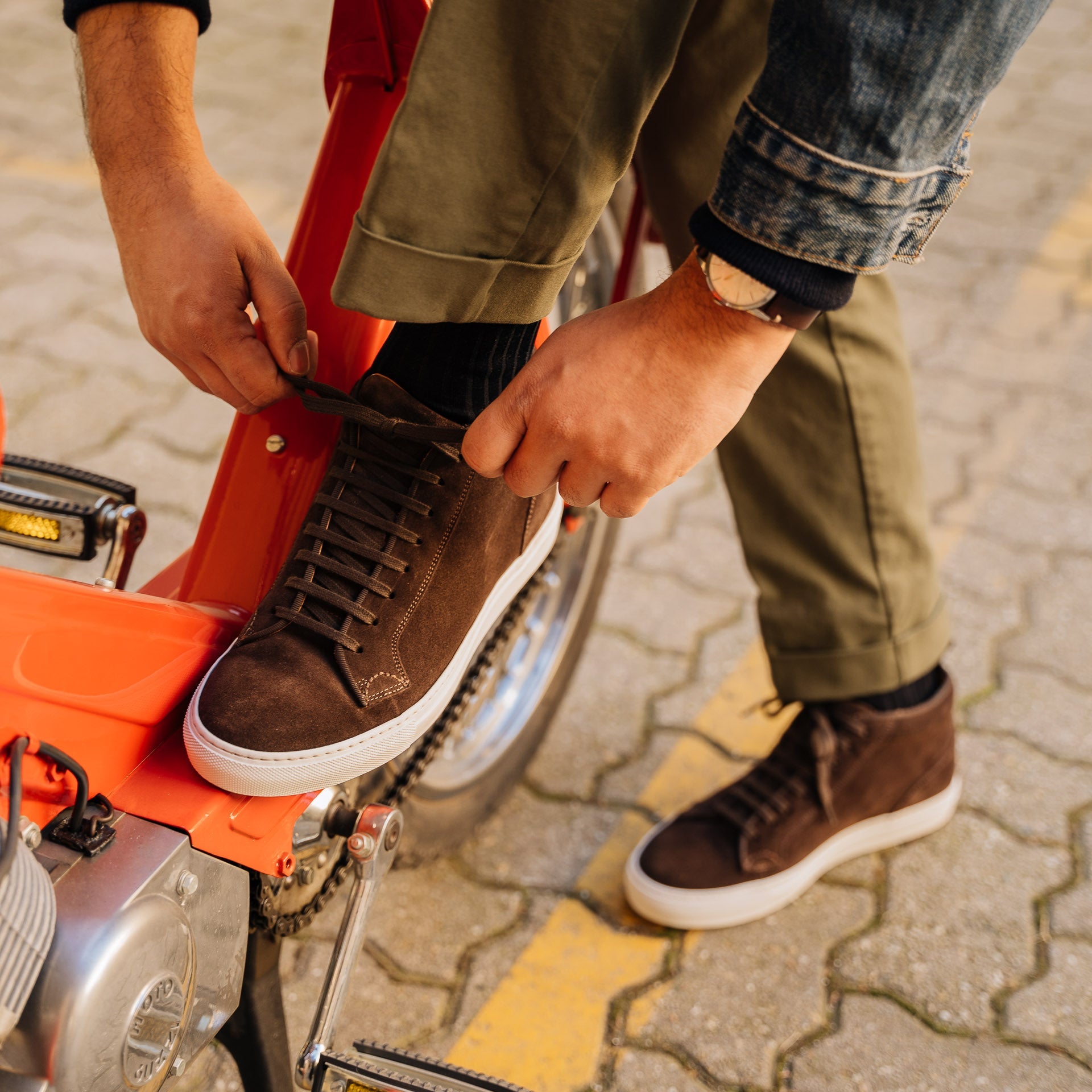 High-top Sneakers, made from suede leather with a rubber sole. Perfect for winter, paired with a wool sock, or in autumn or spring when you don't want to uncover your ankle yet. Casual by nature, we styled them with a denim jacket, white t-shirt, merino crew-neck and green chinos.