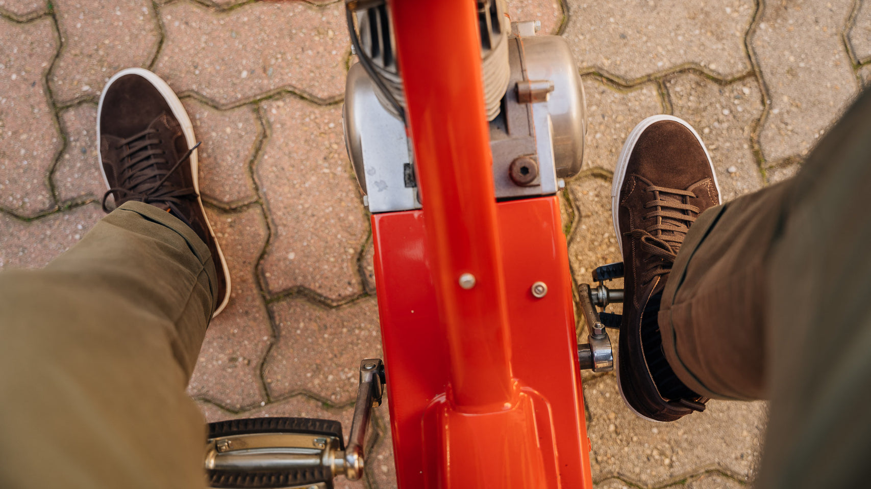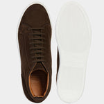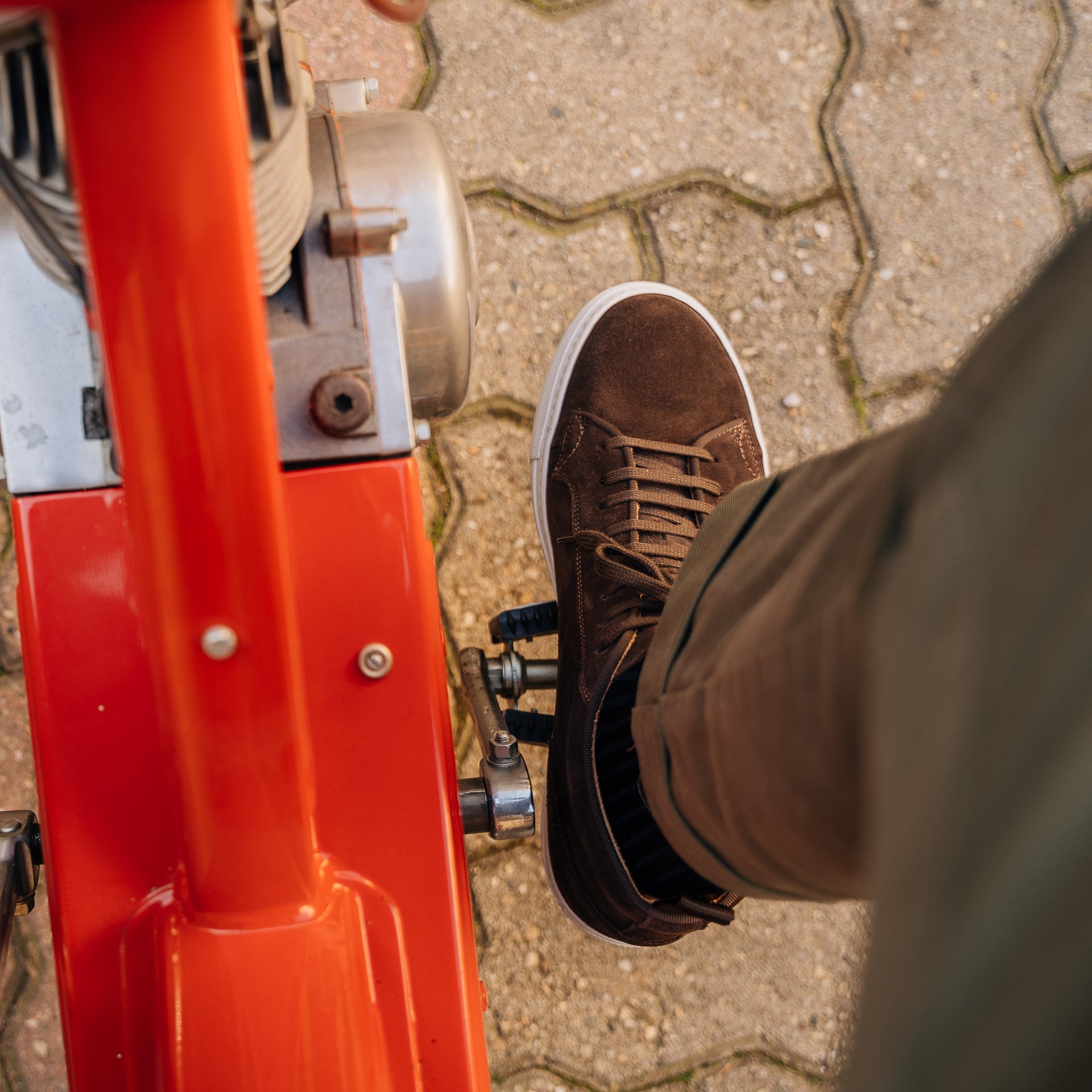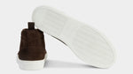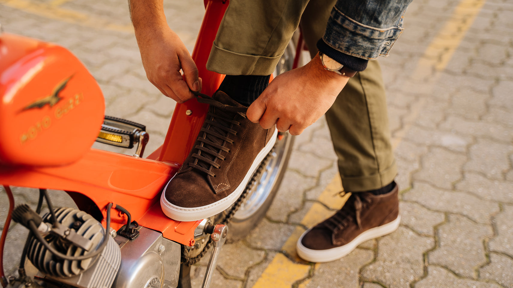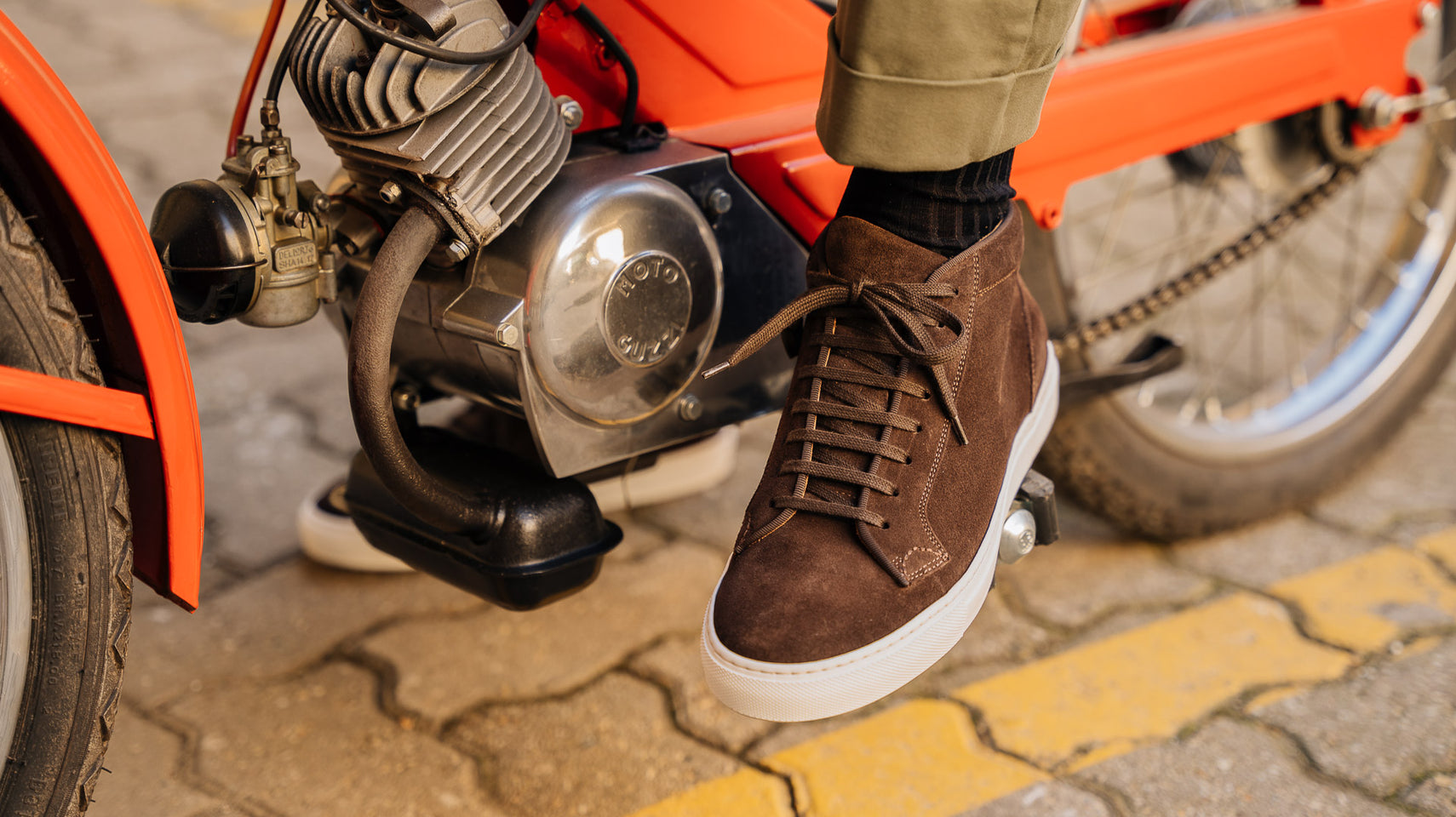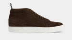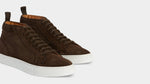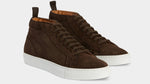 High-top Sneakers, made from suede leather with a rubber sole. Perfect for winter, paired with a wool sock, or in autumn or spring when you don't want to uncover your ankle yet. Casual by nature, we styled them with a denim jacket, white t-shirt, merino crew-neck and green chinos.