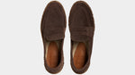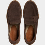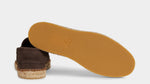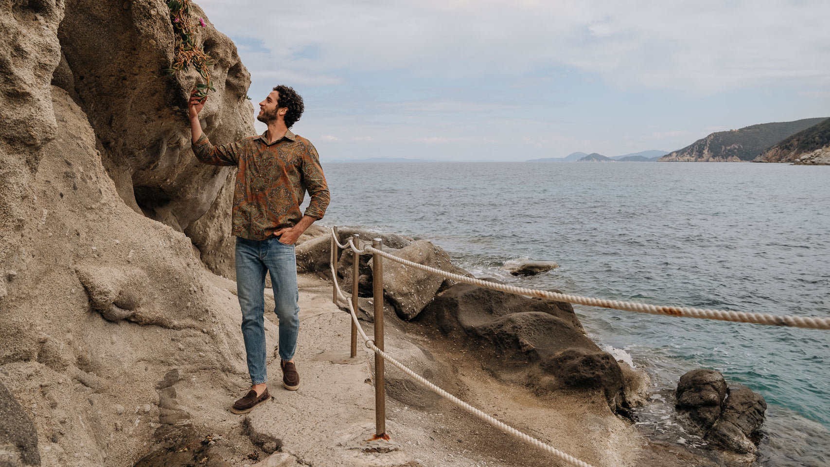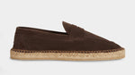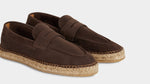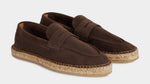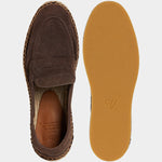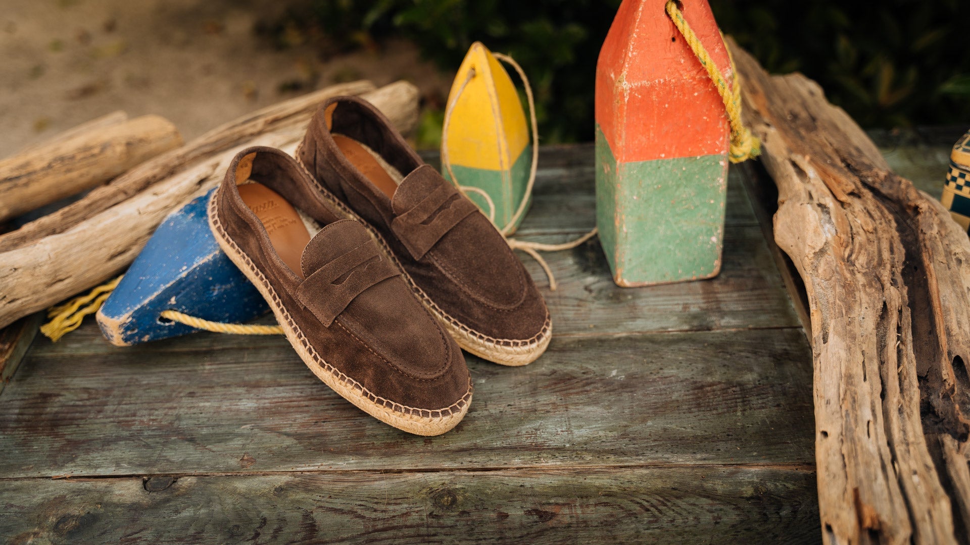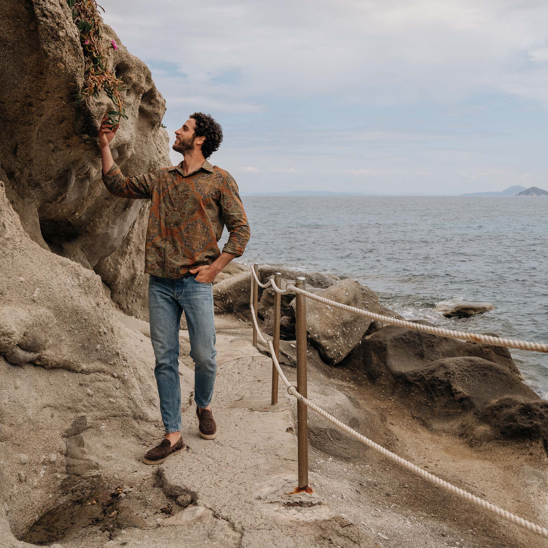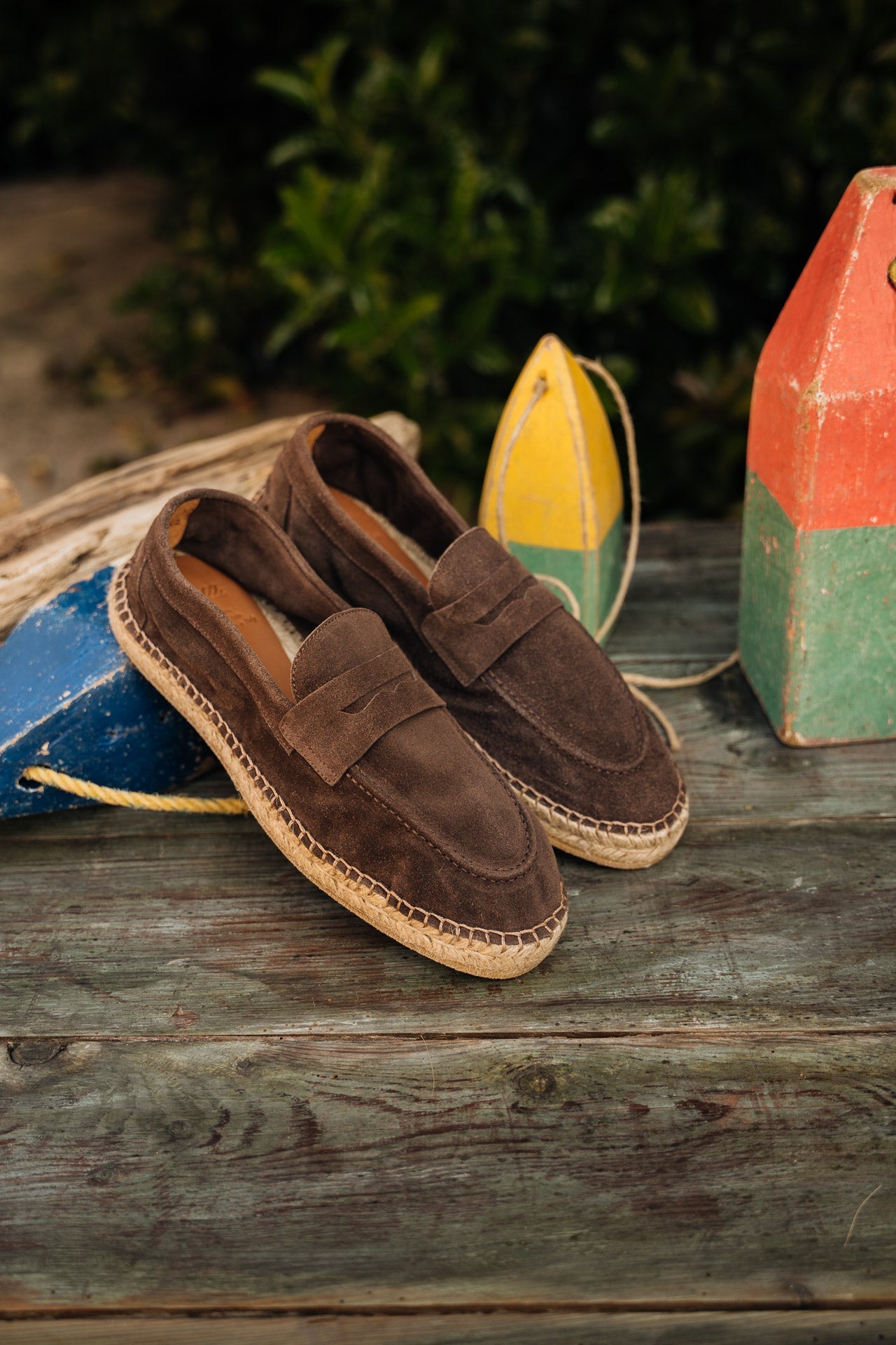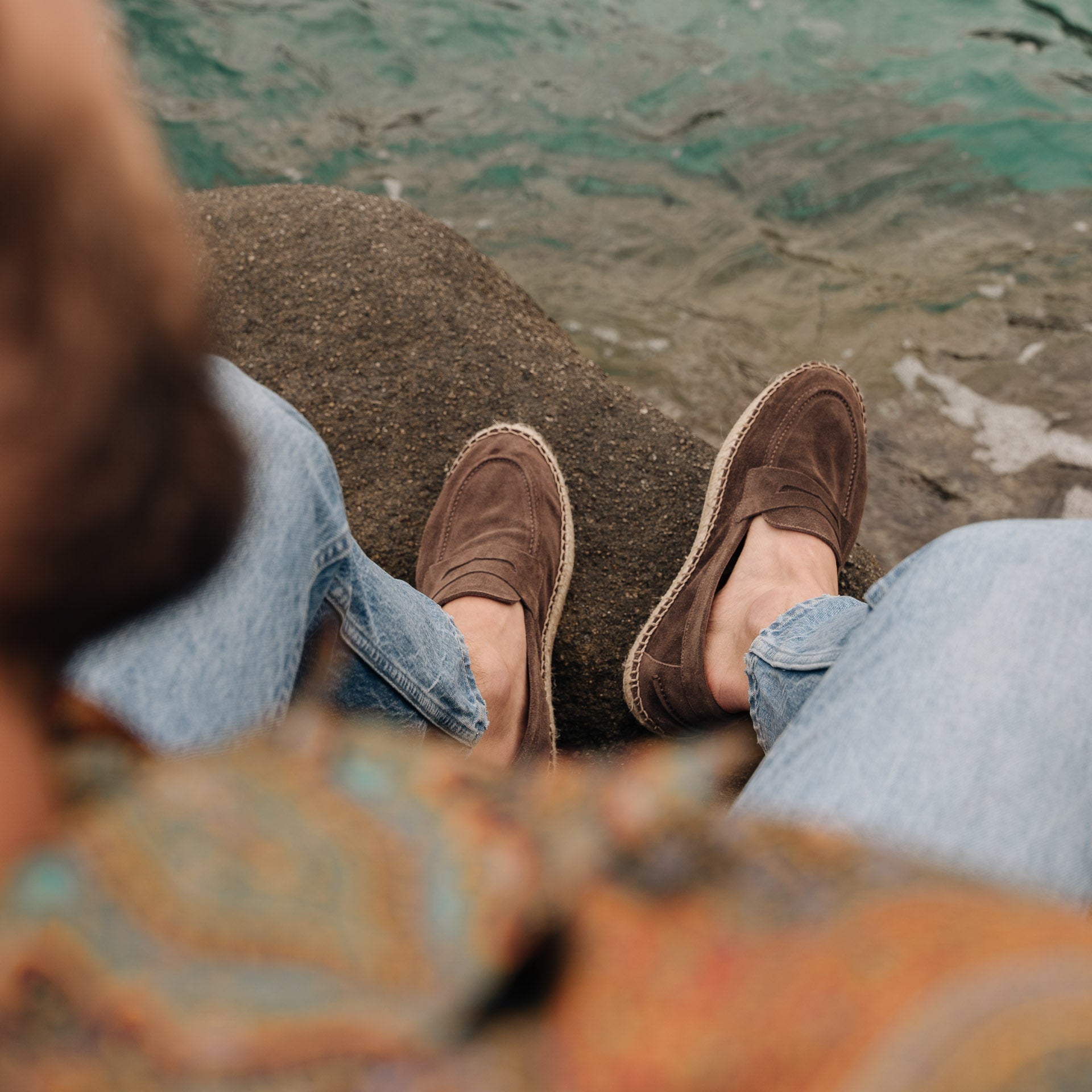 Not a moccasin, neither a classic espadrille. This is our espadrilles with mask, in suede calfskin. The leather upper is joined to the sole with a hand-stitched seam. Here it meets hand-woven rope and rubber. Patterned shirt and jeans: sun on your skin.