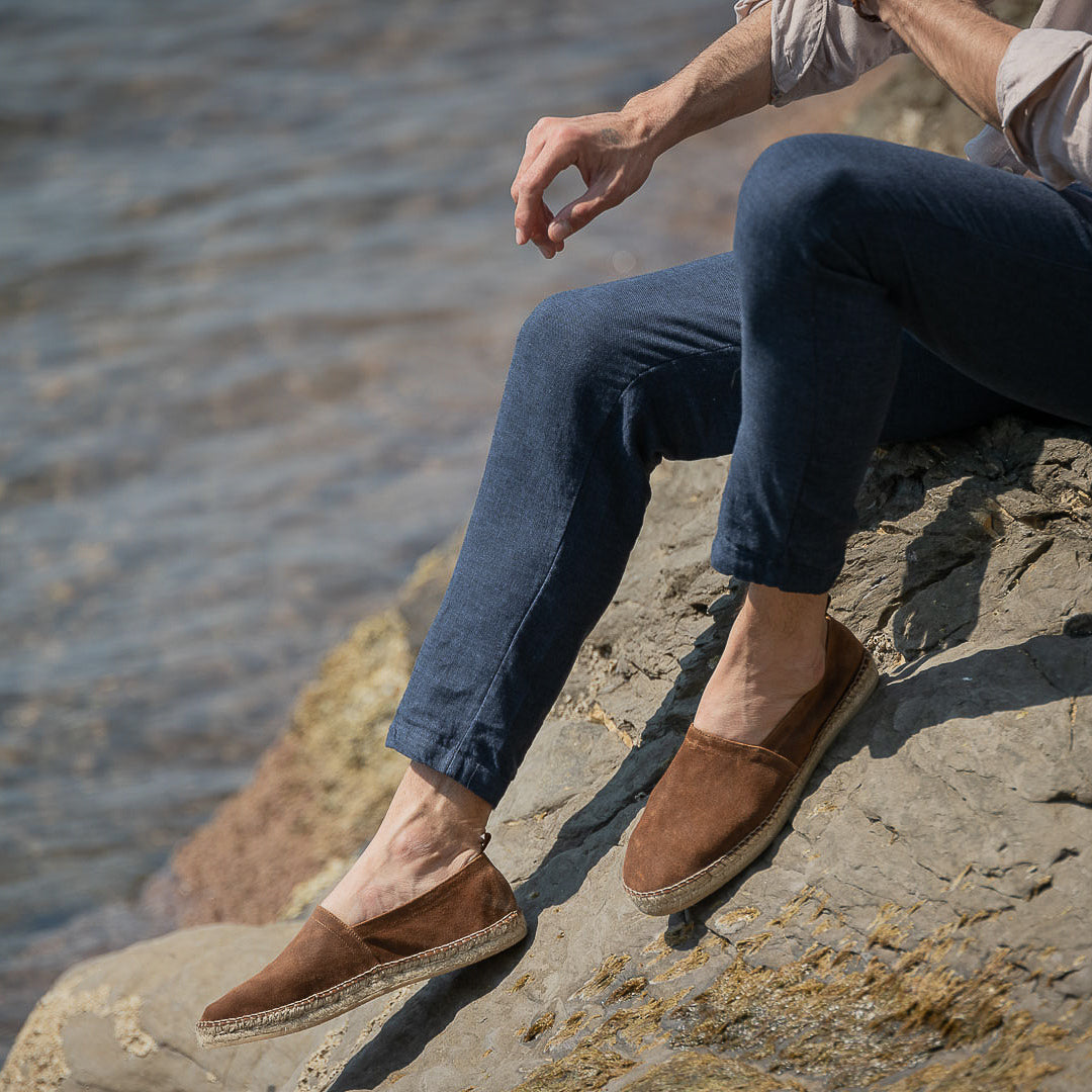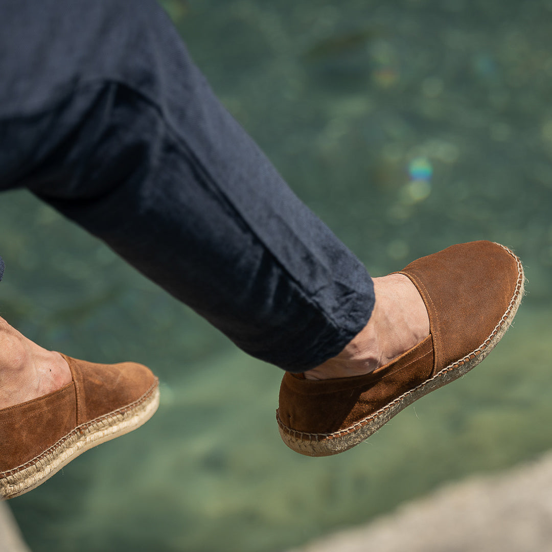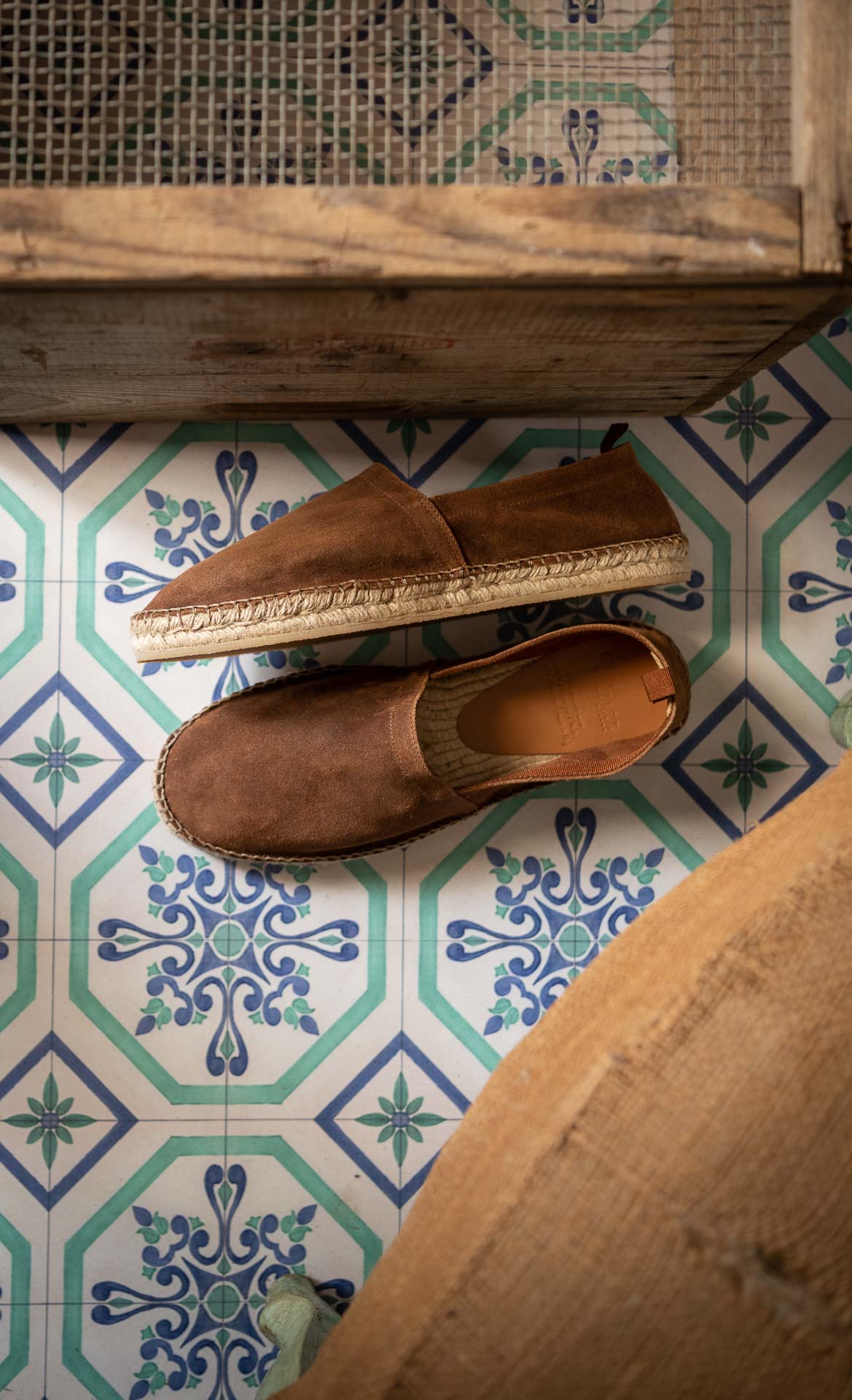 A tobacco brown suede leather upper and a sole made with a mix of natural jute and rubber. Designed to be worn effortlessly on the narrow streets of those small Italian islands that made “La Dolce Vita” famous around the world. An intense smell of salt water, rosemary plants and lemon trees, these are the visual postcards signed by “Inguriatt”. The Espadrilles in tobacco brown call for a light chino - the ones with a nice cuff - and a crew neck t-shirt in oil green. No belt, thanks.