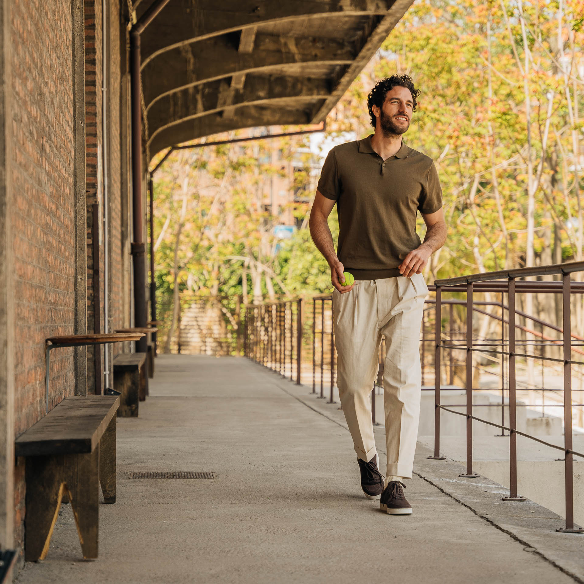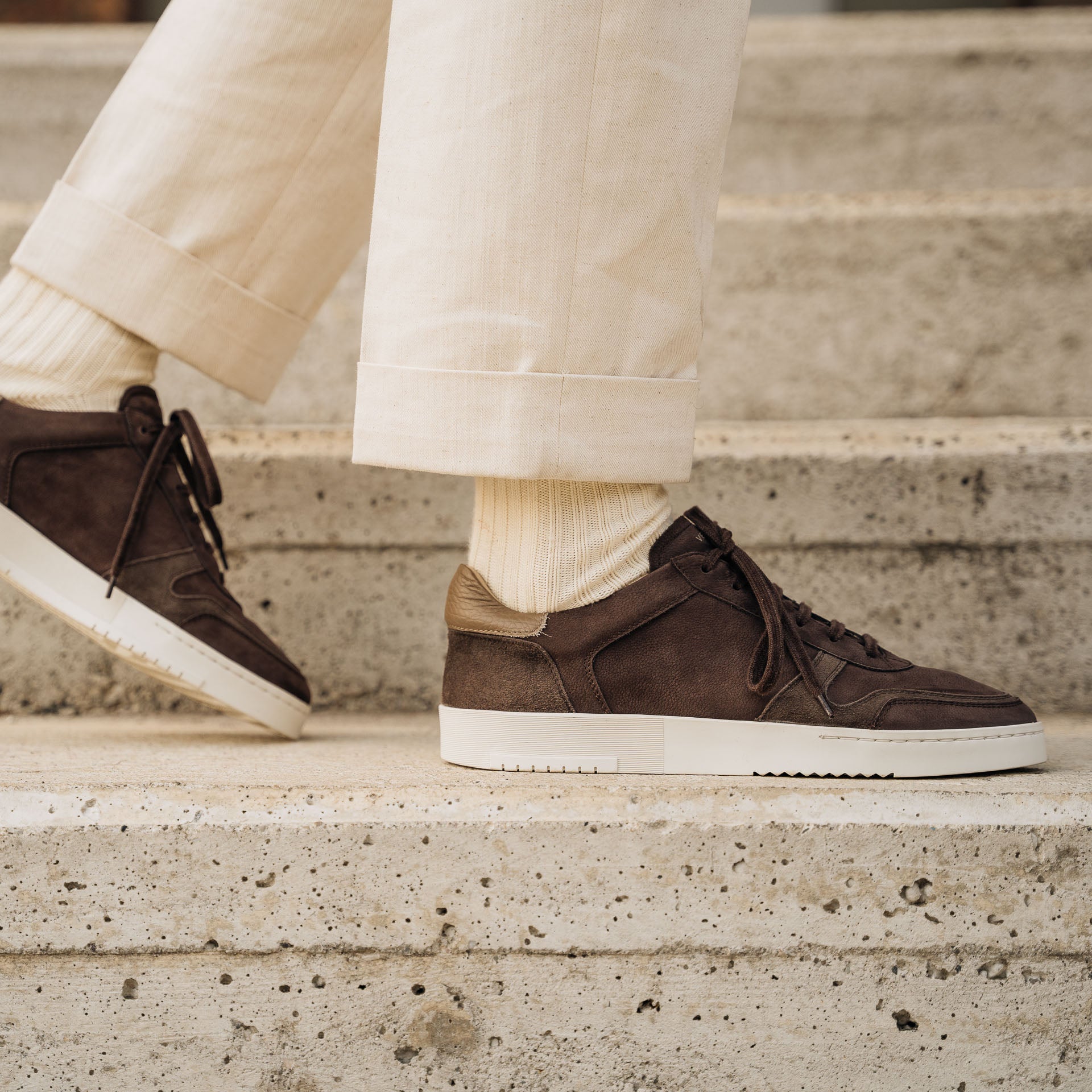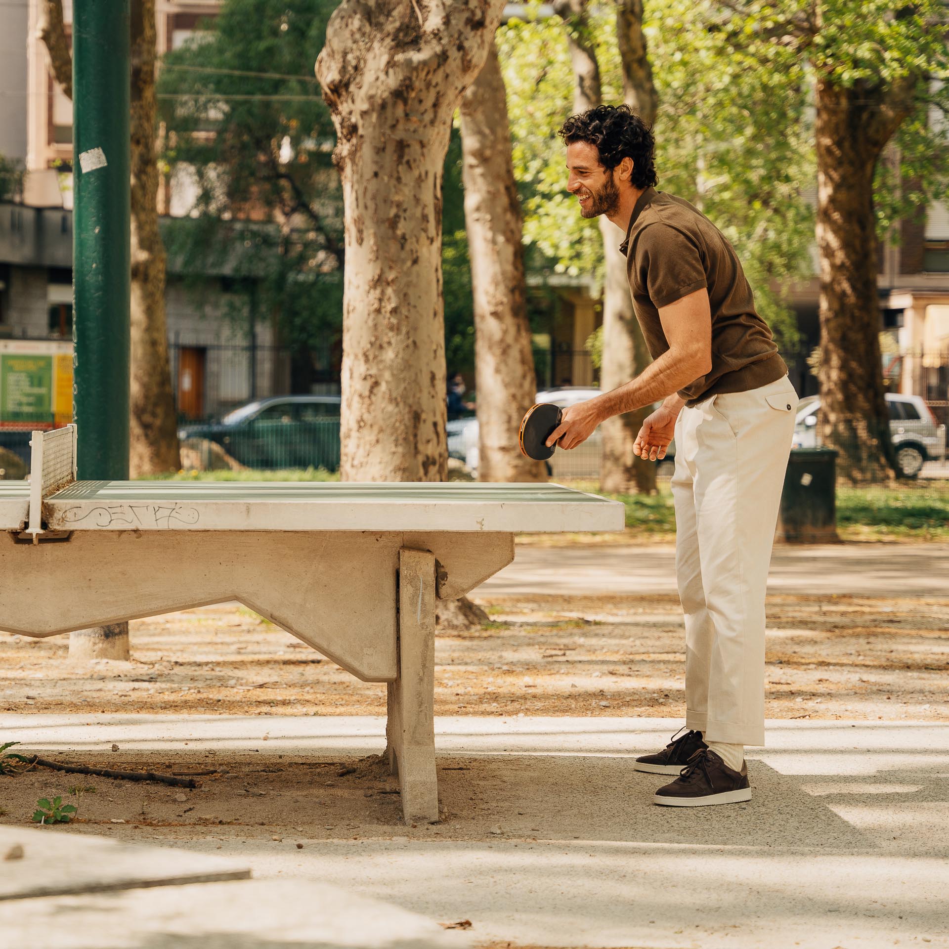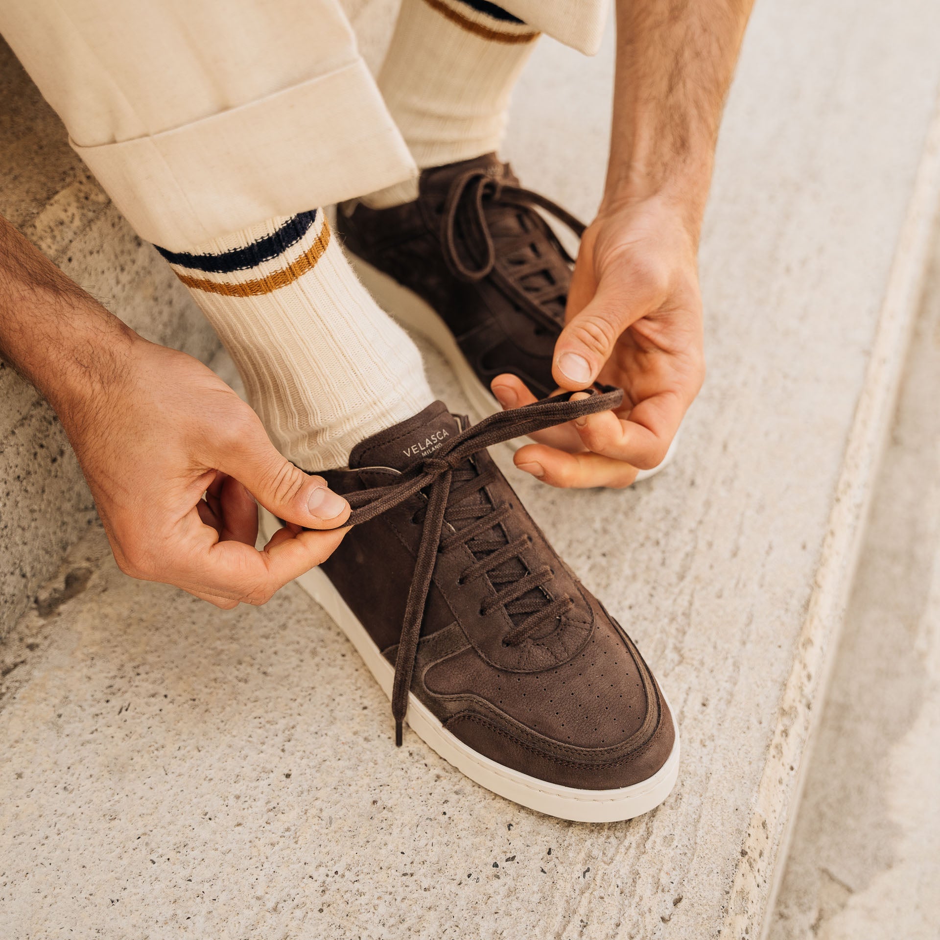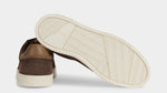 The sneaker Adriano Panatta would love, inspired by the tennis courts of the Seventies. In smooth calfskin with soft nubuck on the toe and the typical smooth rubber sole, and a removable insole. The logo has been specially redesigned for this sporty line with simple contours. Wear them with a mud-coloured cotton jersey polo shirt and cream cotton pleated trousers.