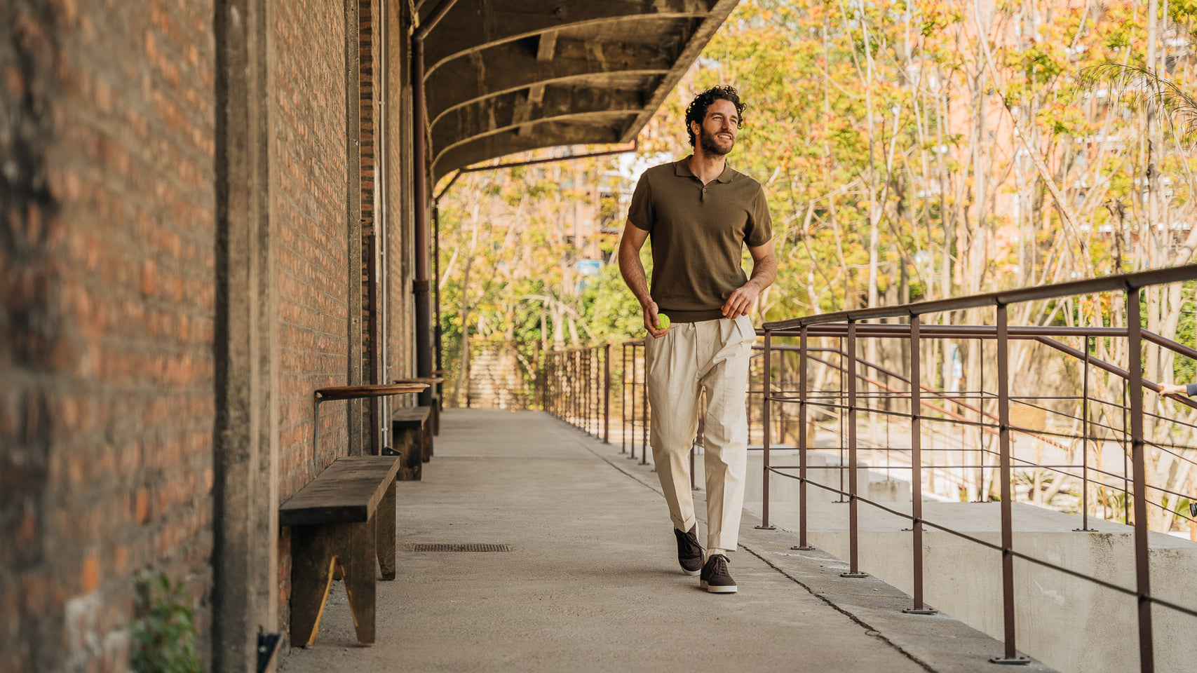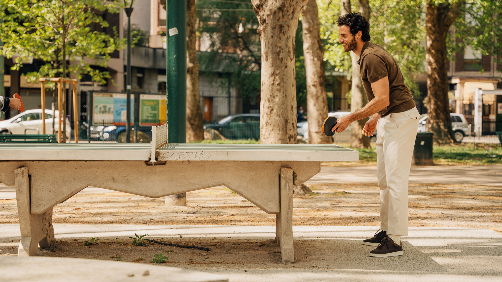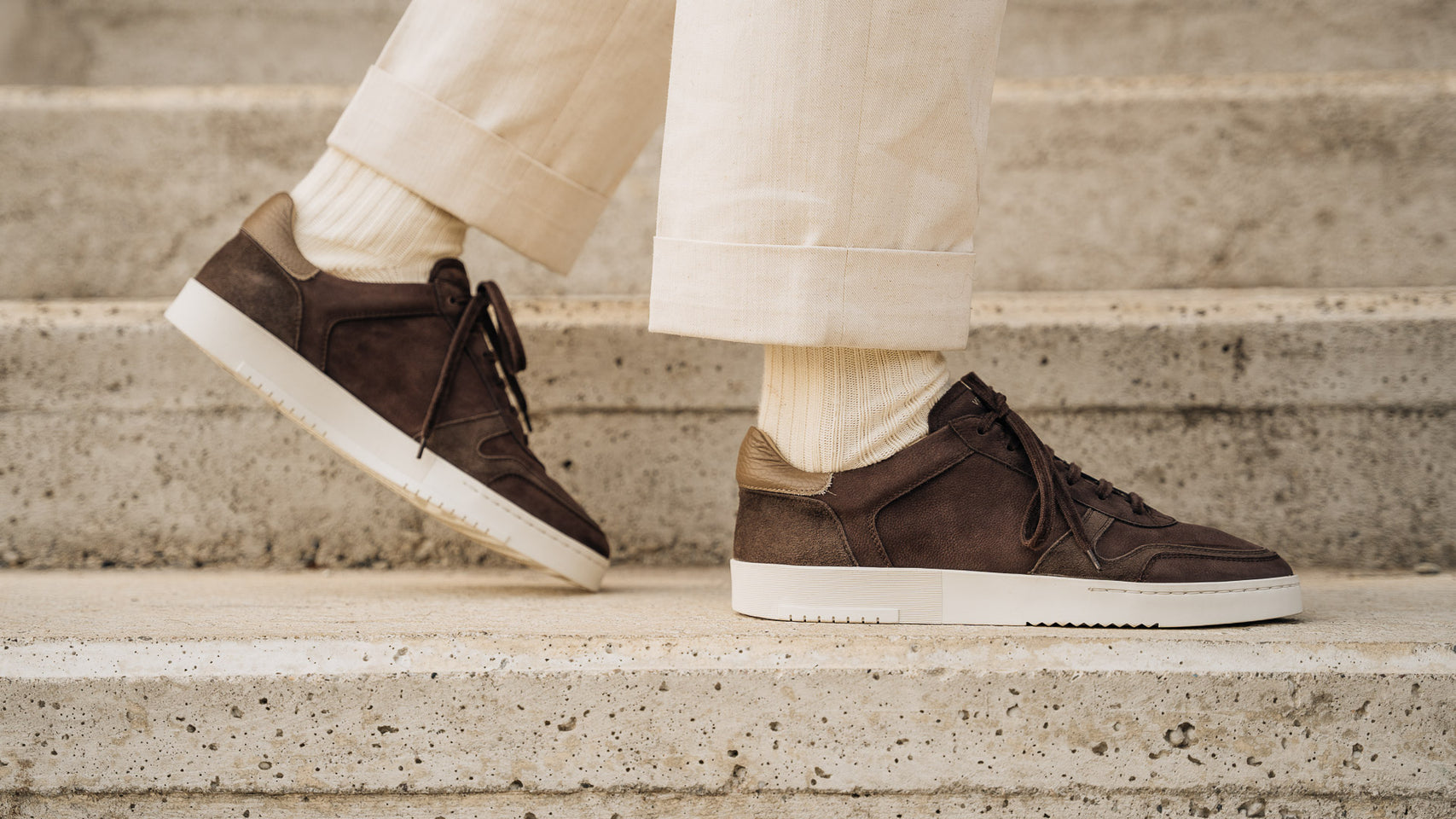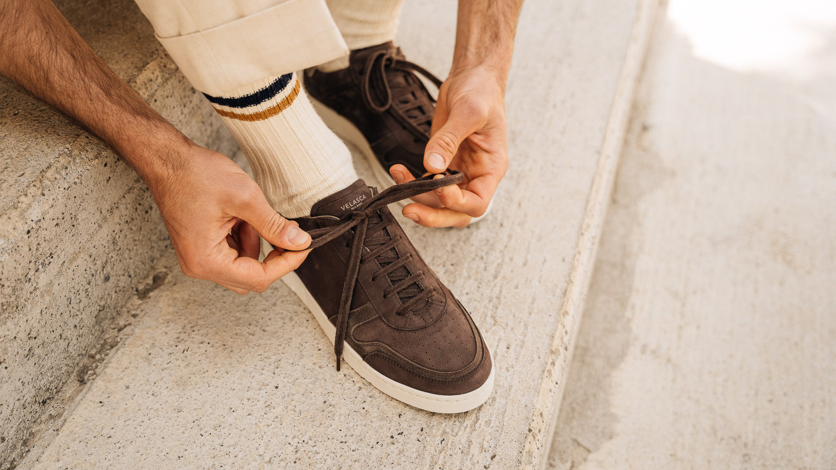 The sneaker Adriano Panatta would love, inspired by the tennis courts of the Seventies. In smooth calfskin with soft nubuck on the toe and the typical smooth rubber sole, and a removable insole. The logo has been specially redesigned for this sporty line with simple contours. Wear them with a mud-coloured cotton jersey polo shirt and cream cotton pleated trousers.