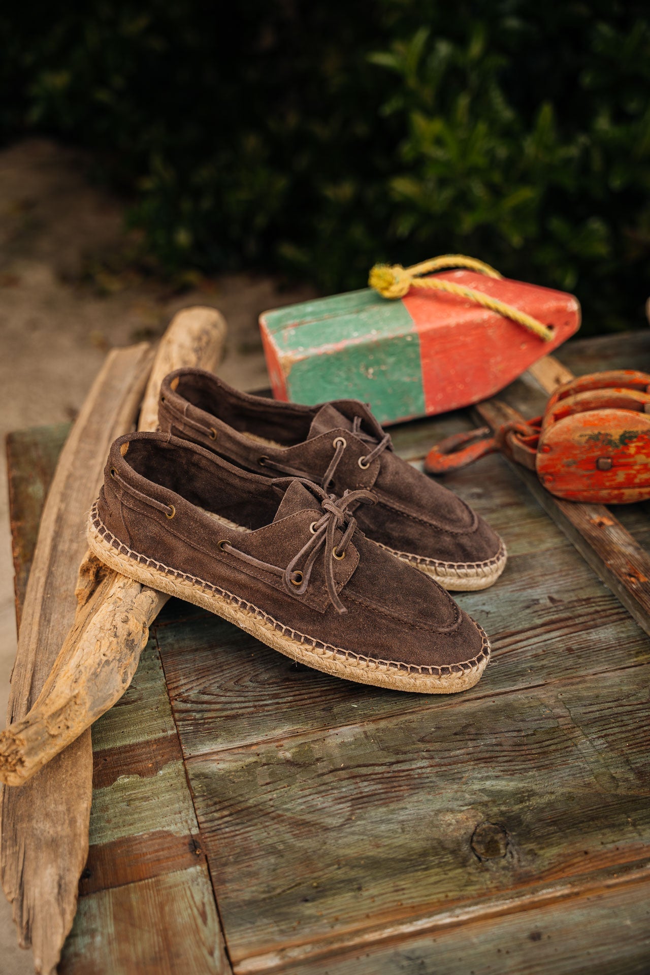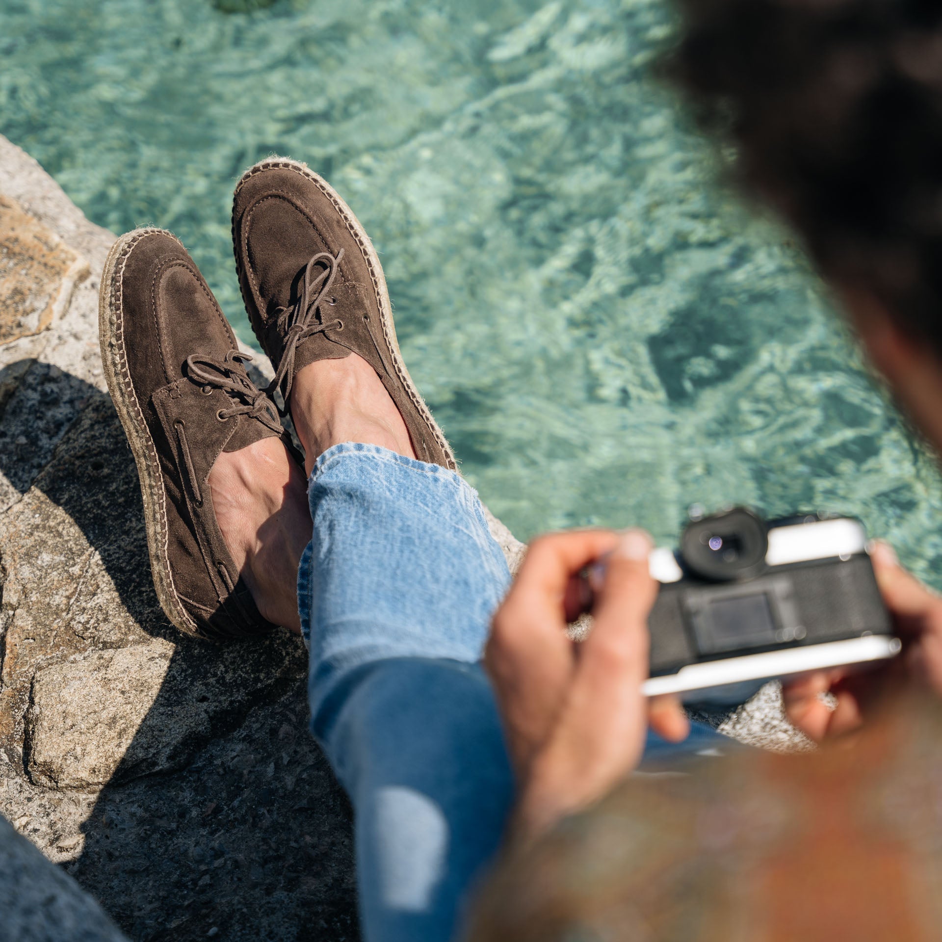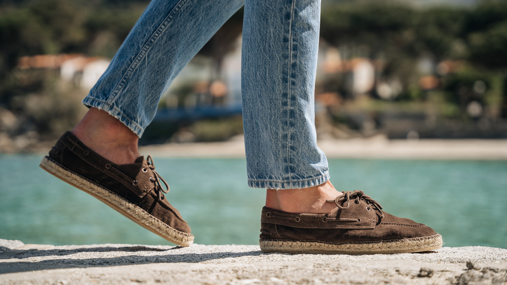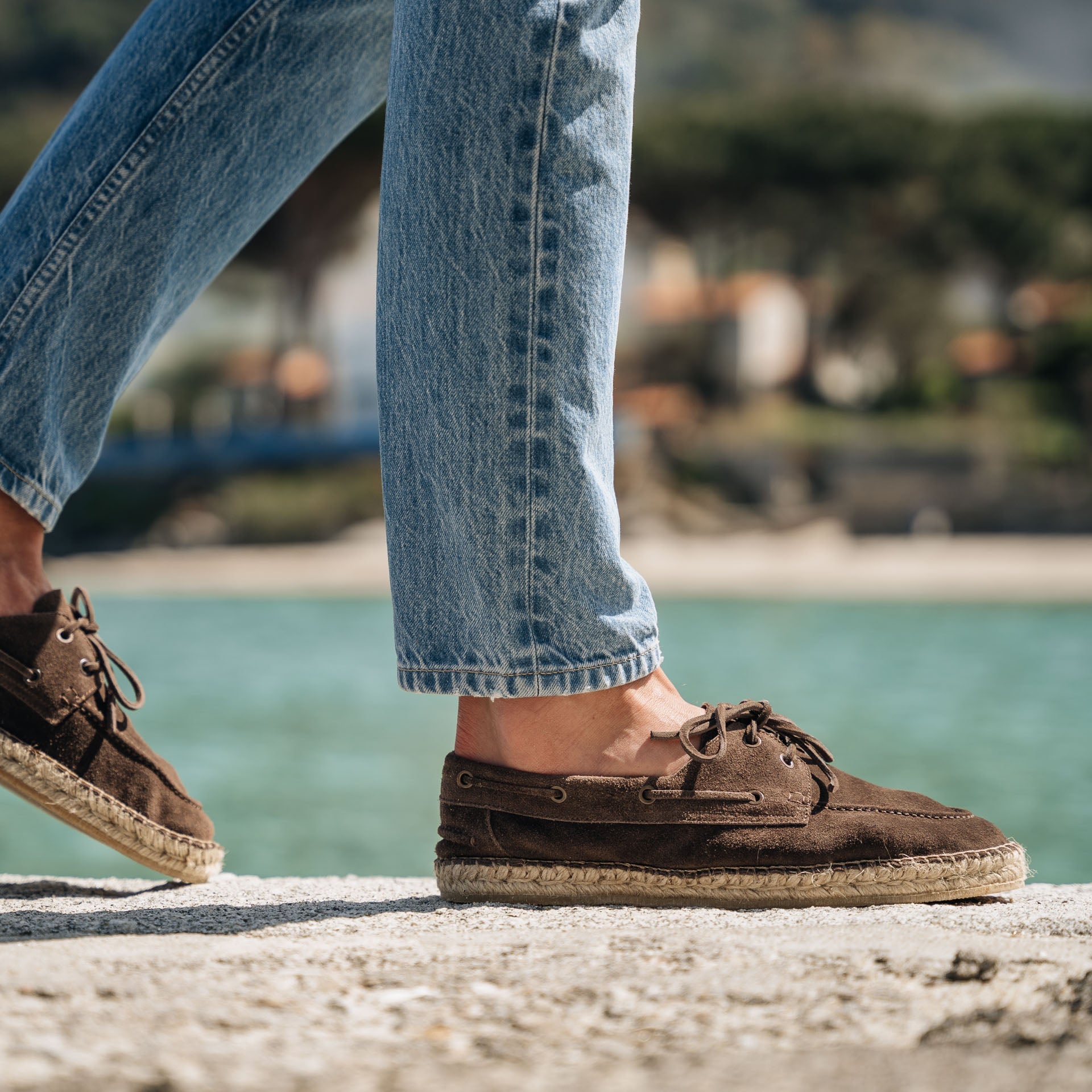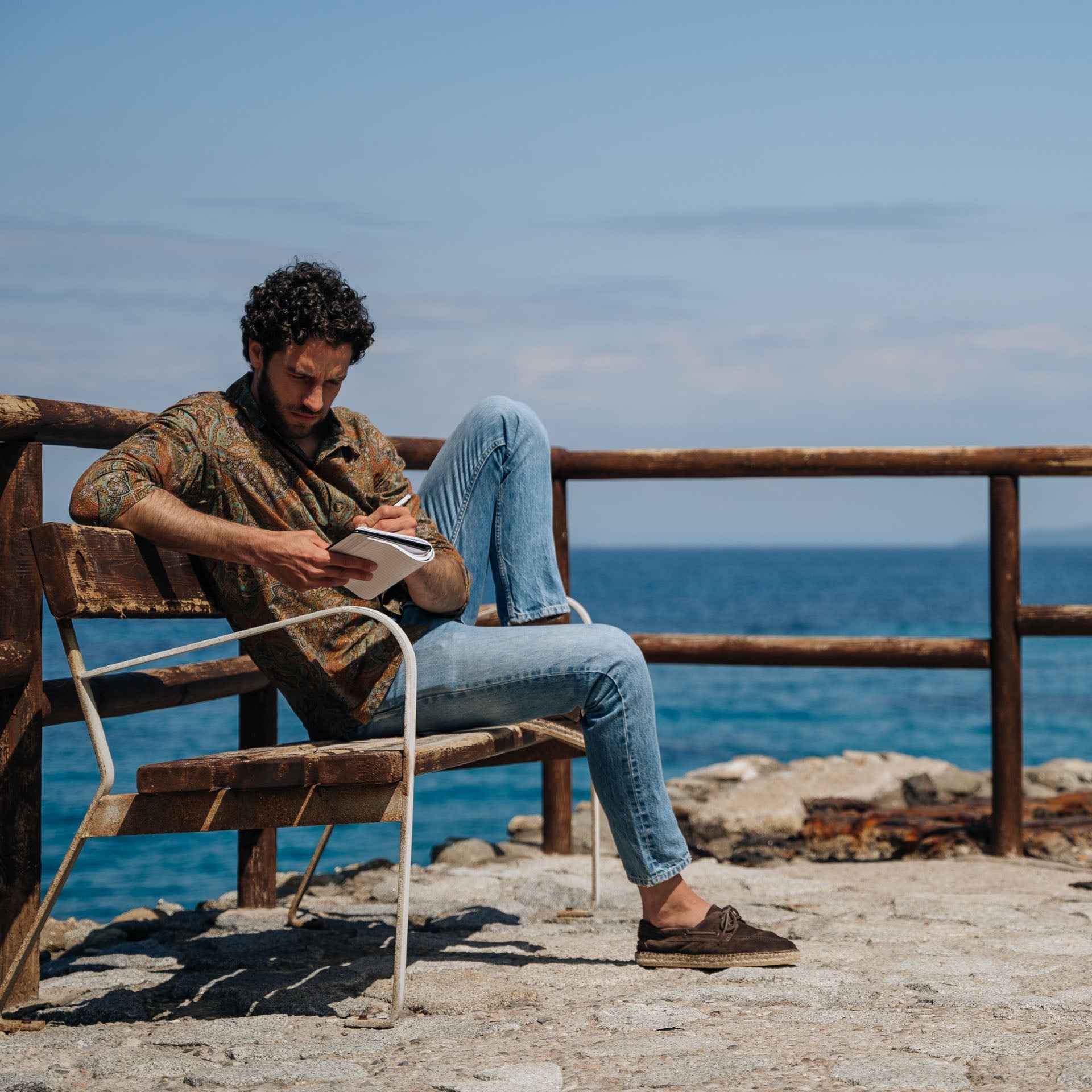 Our espadrilles inspired by the sailing tradition, in suede calfskin. The leather upper is joined to the sole with a hand-stitched seam. Here it meets hand-woven rope and rubber. Patterned shirt and jeans: sun on your skin.