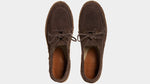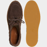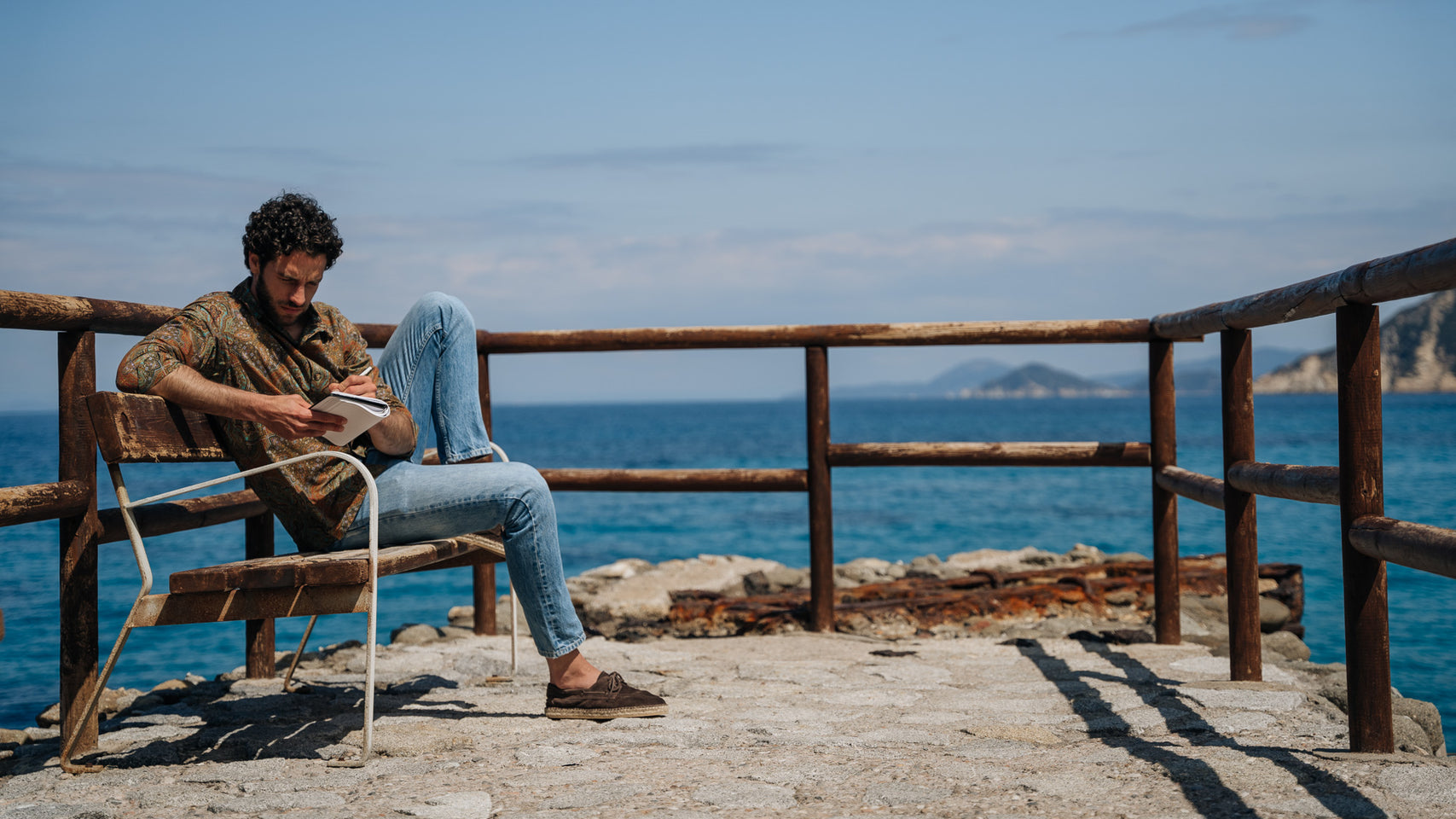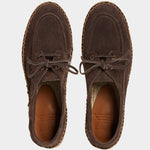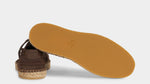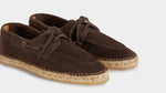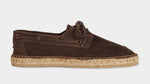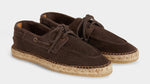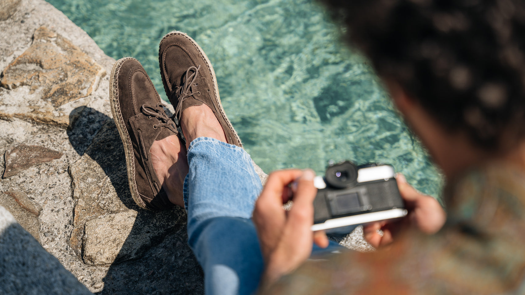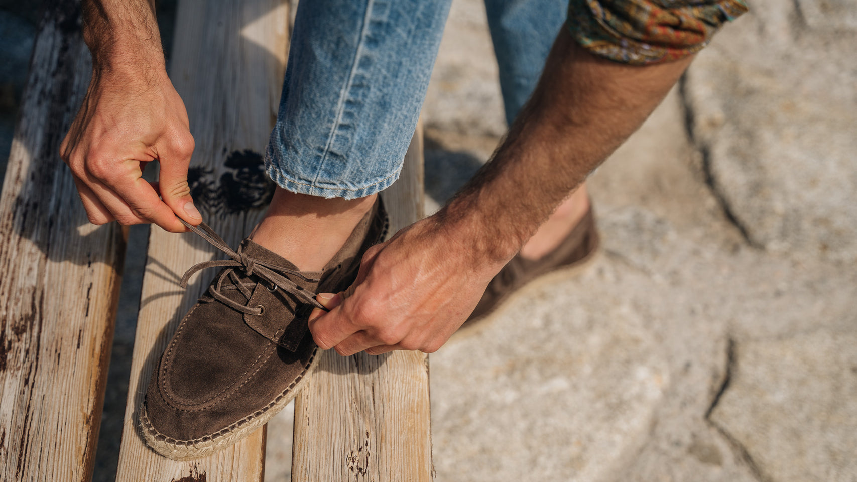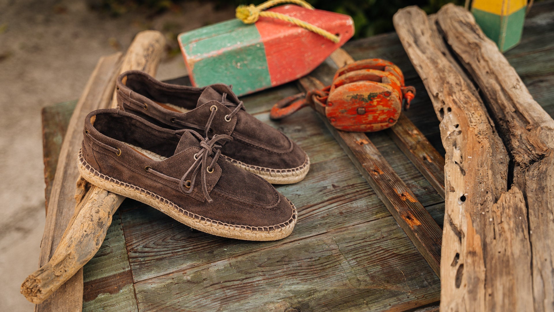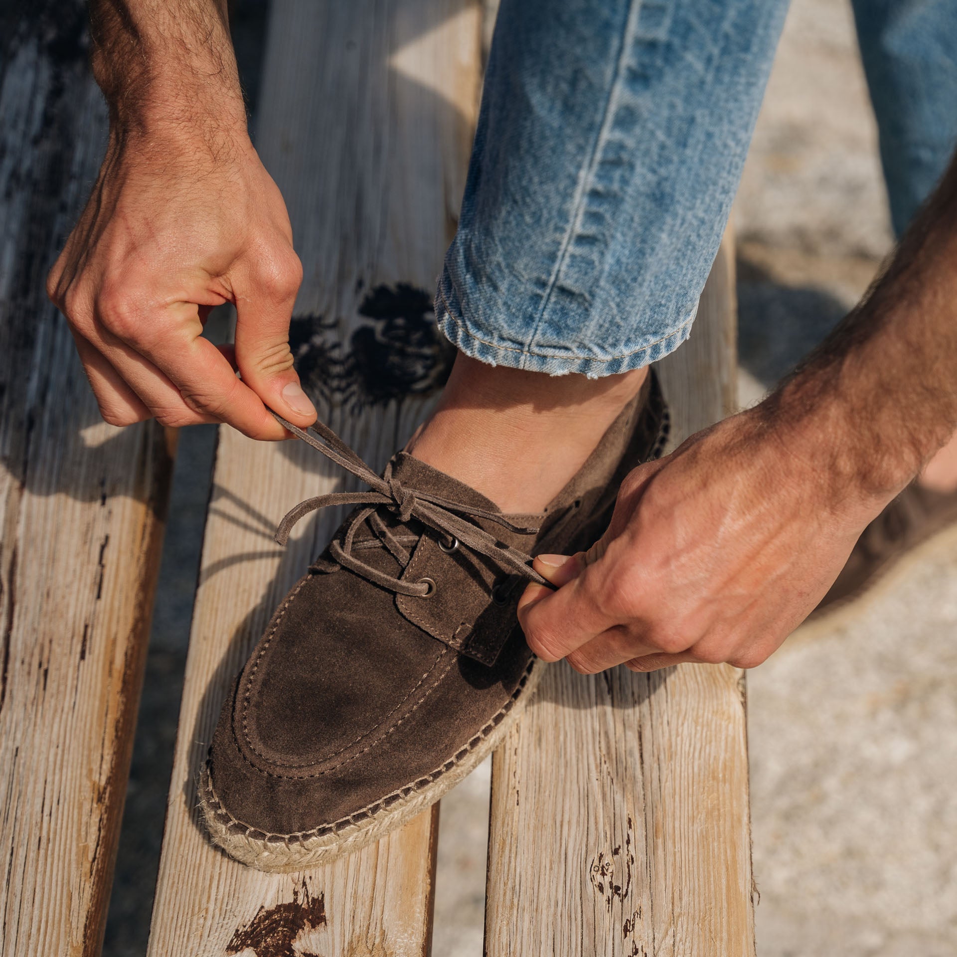 Our espadrilles inspired by the sailing tradition, in suede calfskin. The leather upper is joined to the sole with a hand-stitched seam. Here it meets hand-woven rope and rubber. Patterned shirt and jeans: sun on your skin.