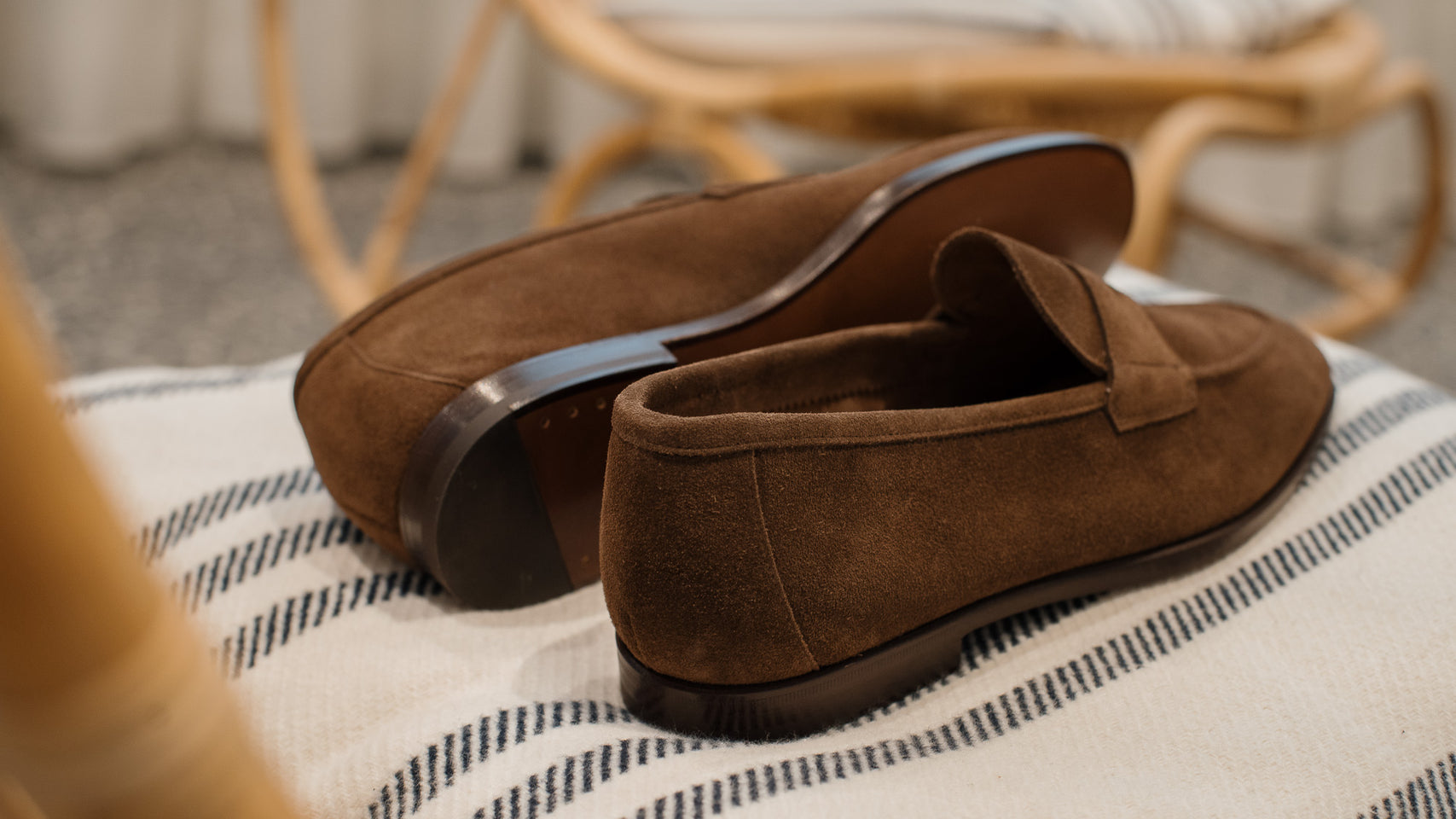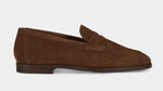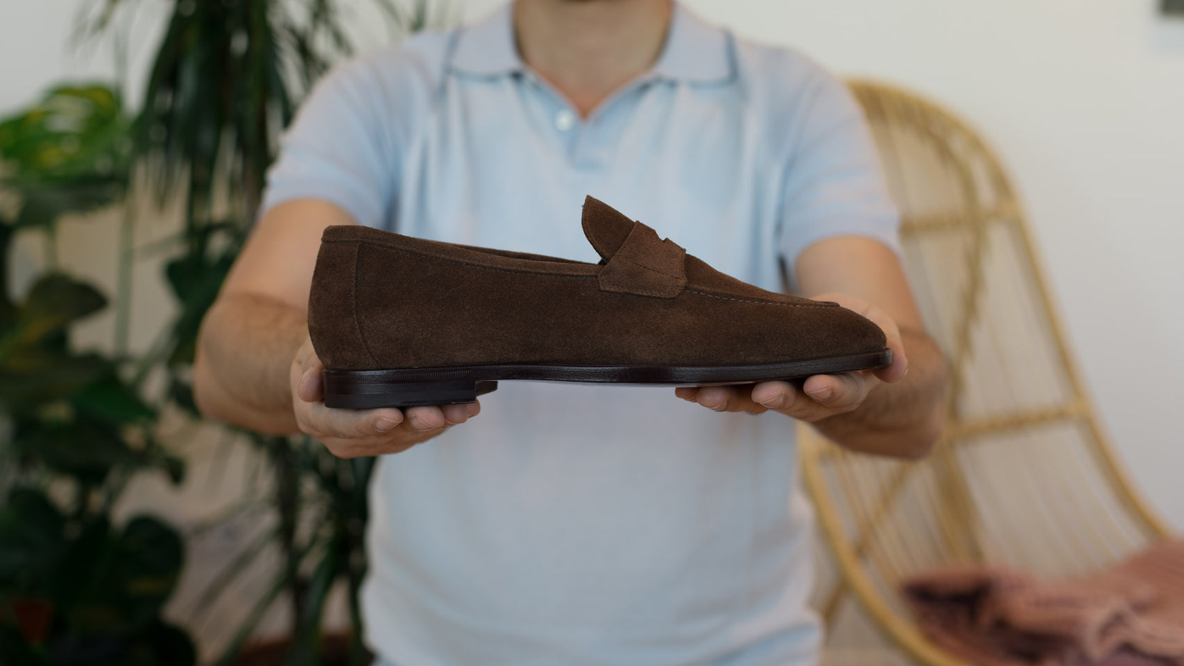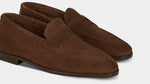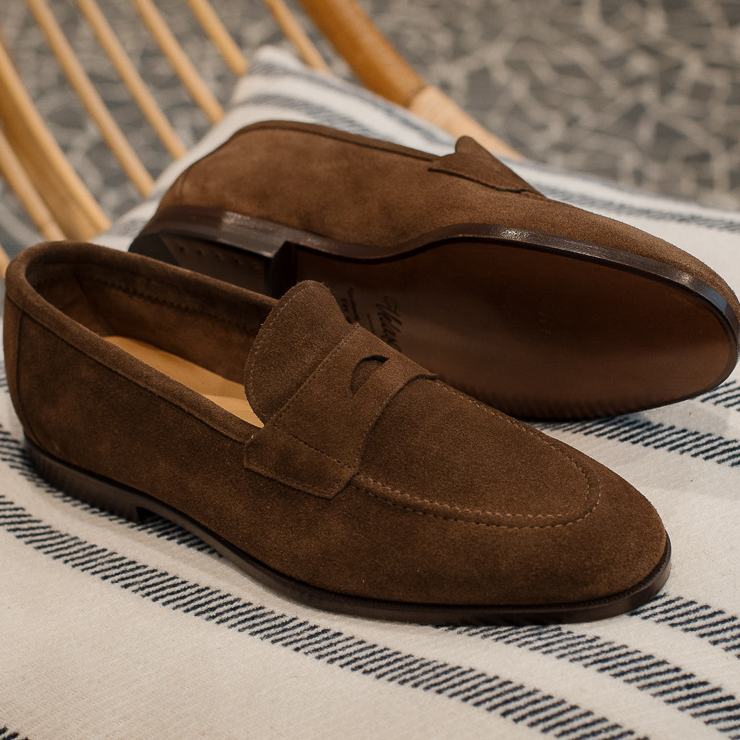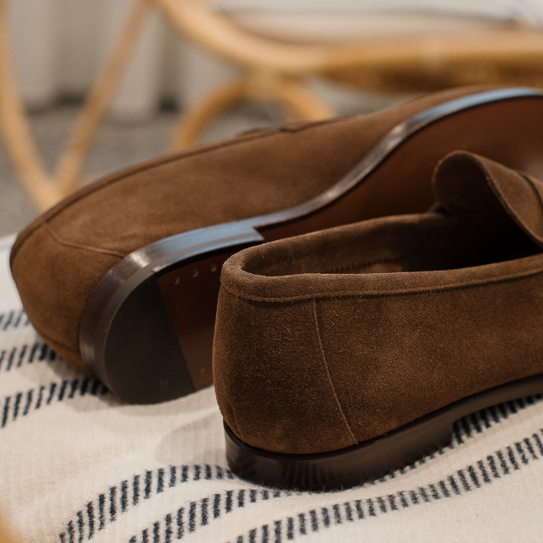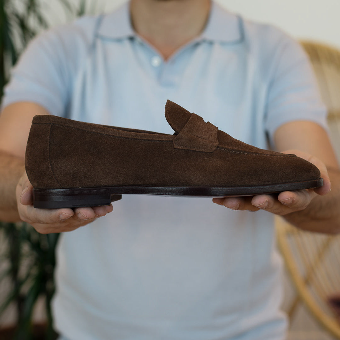 College shoes with a mask, which stretches towards the tapered tip in soft suede calf leather. The unlined interior welcomes the foot without the need for socks. The sole is in classic leather. You can wear your dark brown moccasins with a caramel-coloured cotton solaro suit and a light-blue cotton and linen shirt. Fresh, but still elegant.