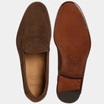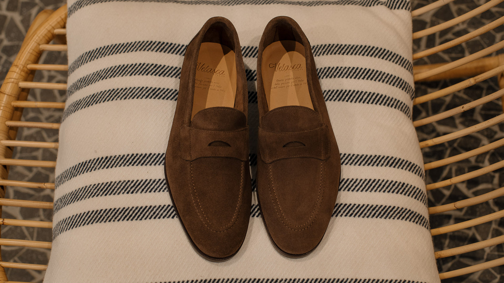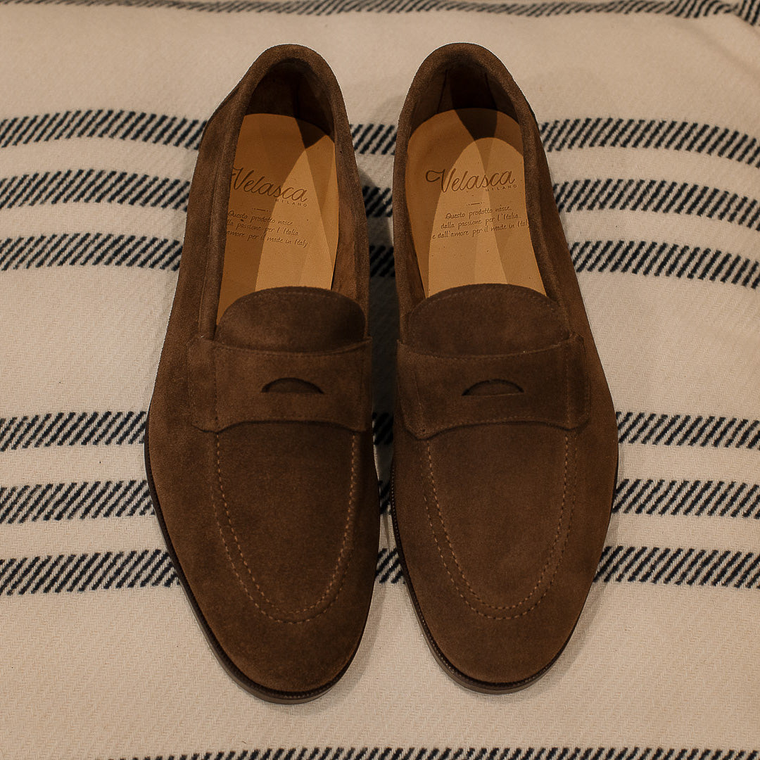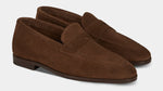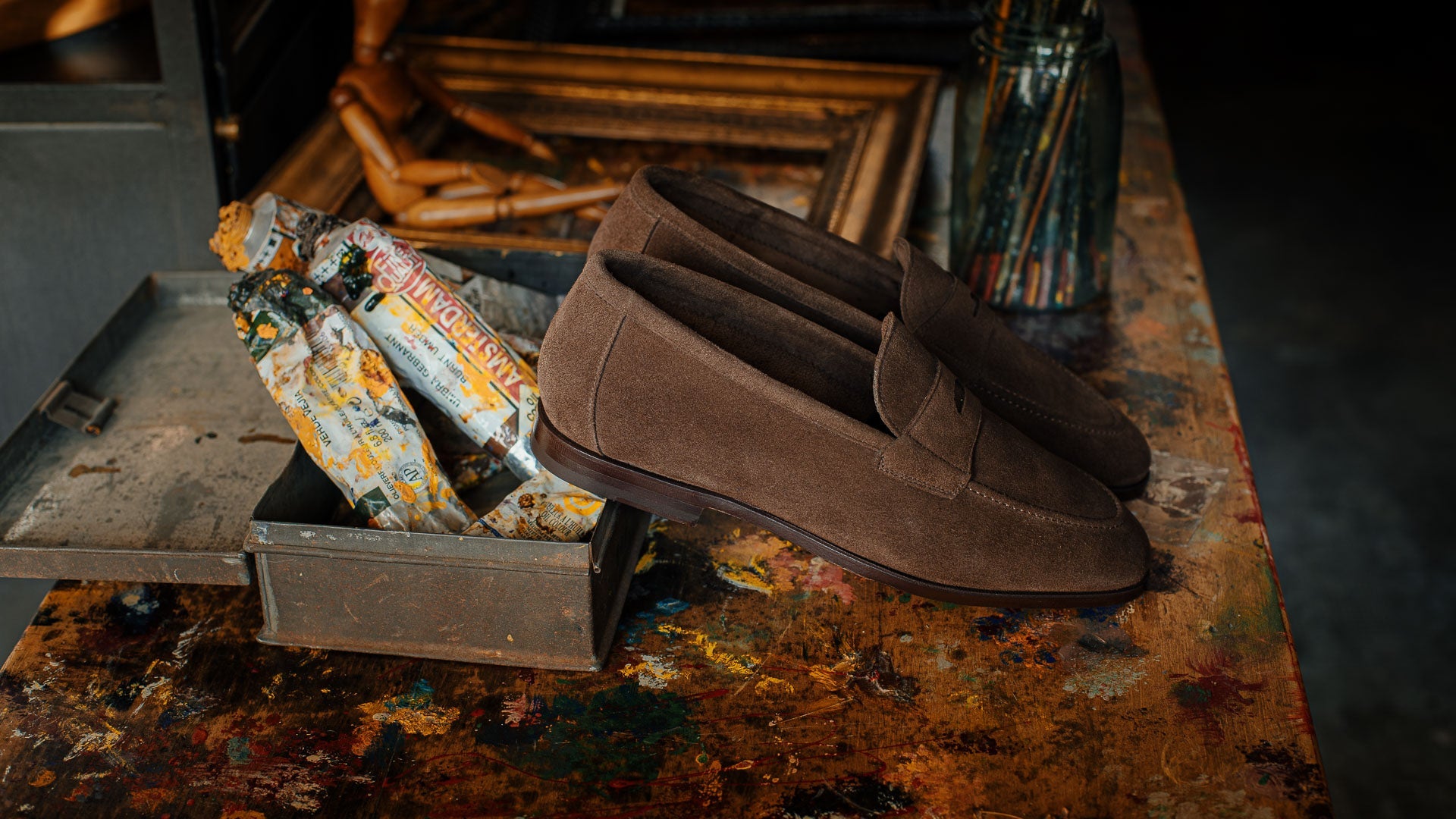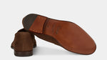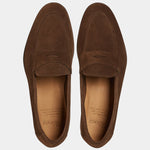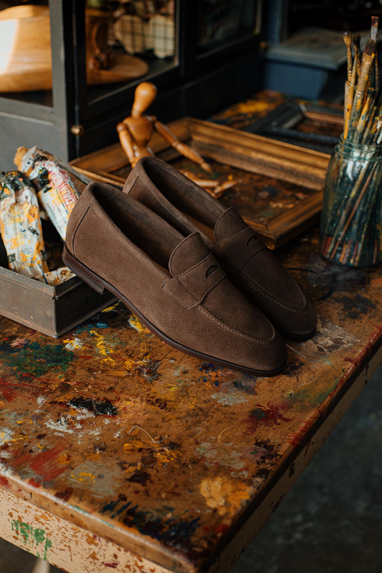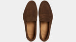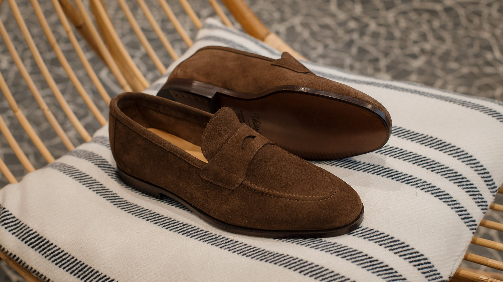 College shoes with a mask, which stretches towards the tapered tip in soft suede calf leather. The unlined interior welcomes the foot without the need for socks. The sole is in classic leather. You can wear your dark brown moccasins with a caramel-coloured cotton solaro suit and a light-blue cotton and linen shirt. Fresh, but still elegant.