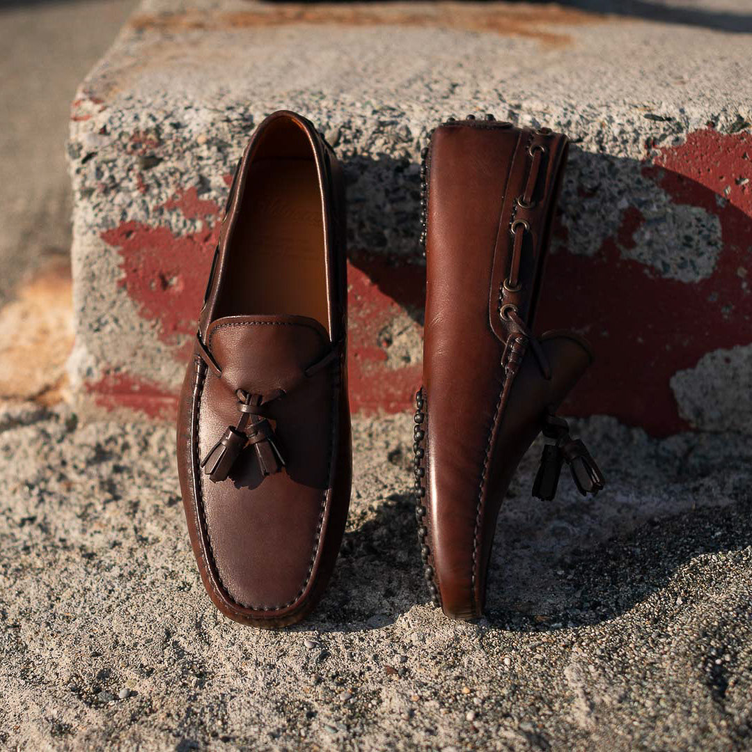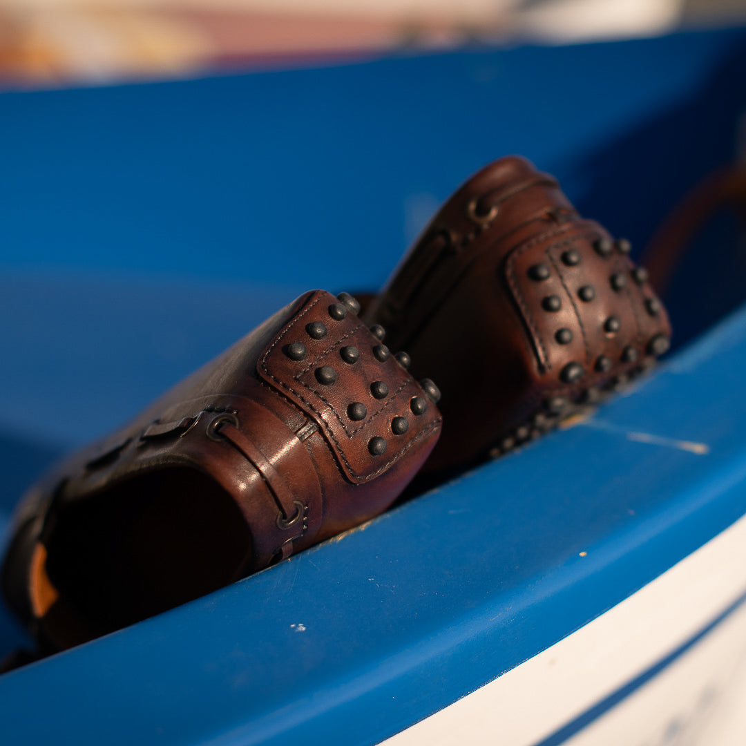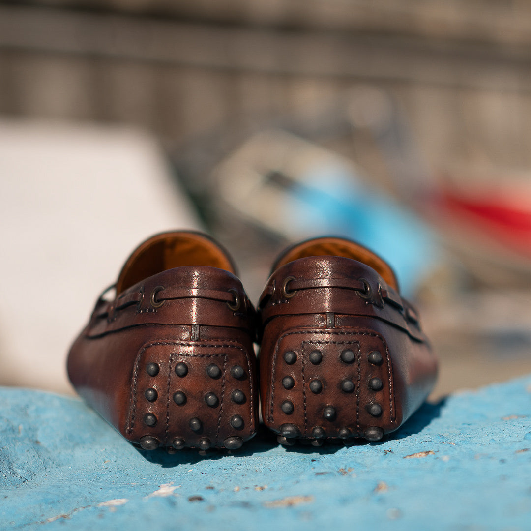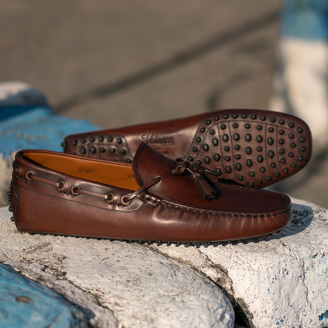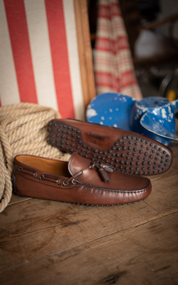 It's the vintage Moccasin with a tassel, instead of classic laces. With its antiqued leather and studded rubber sole, it’s a brown shoe for getting around in style during summer. Our artisans chose to make them using the tubular technique. Their best feature is how they feel: they’re flexible and soft to walk in.
