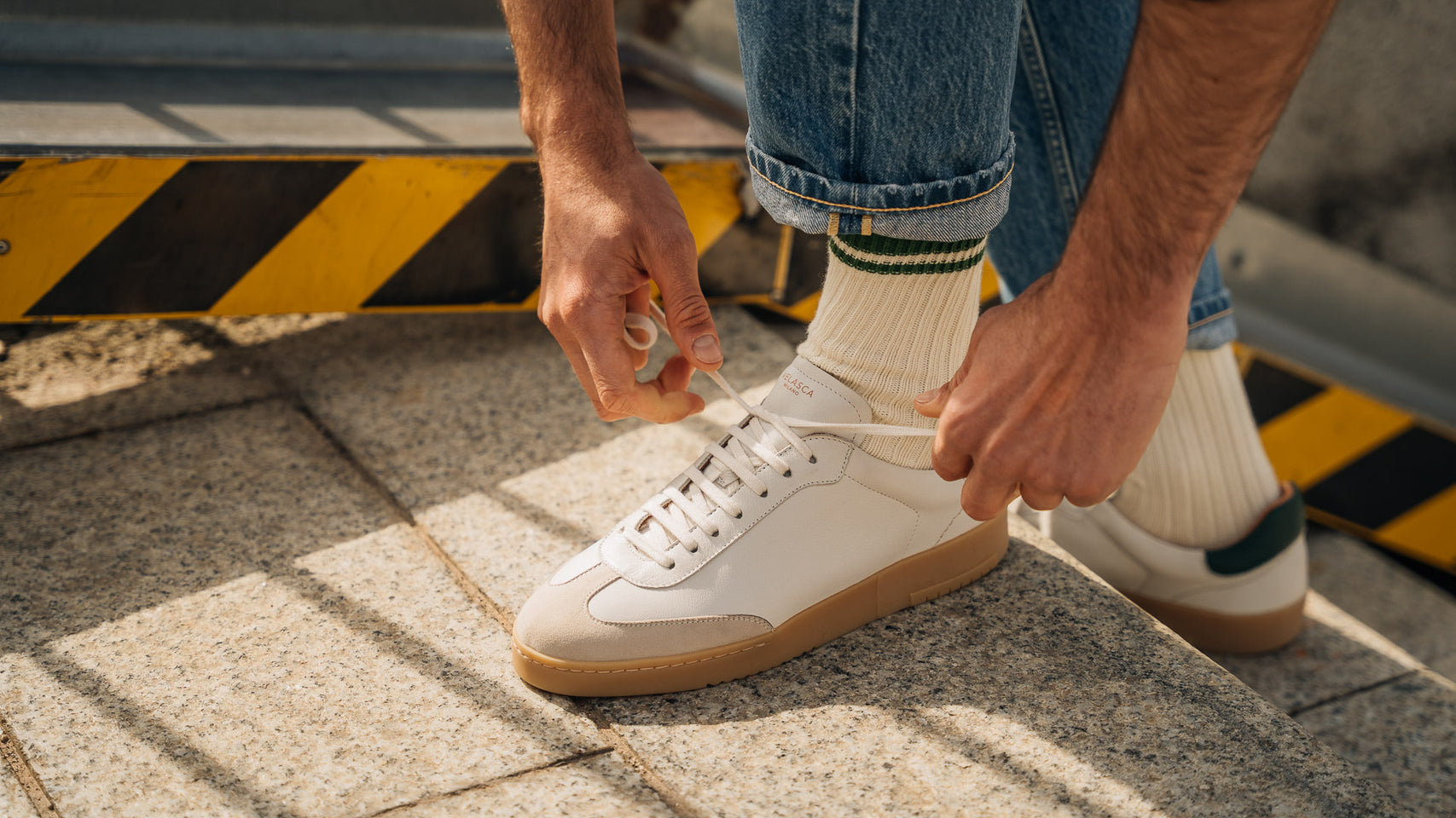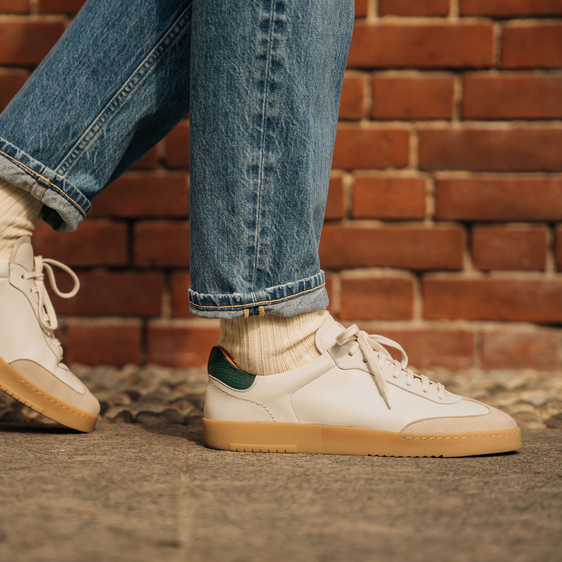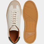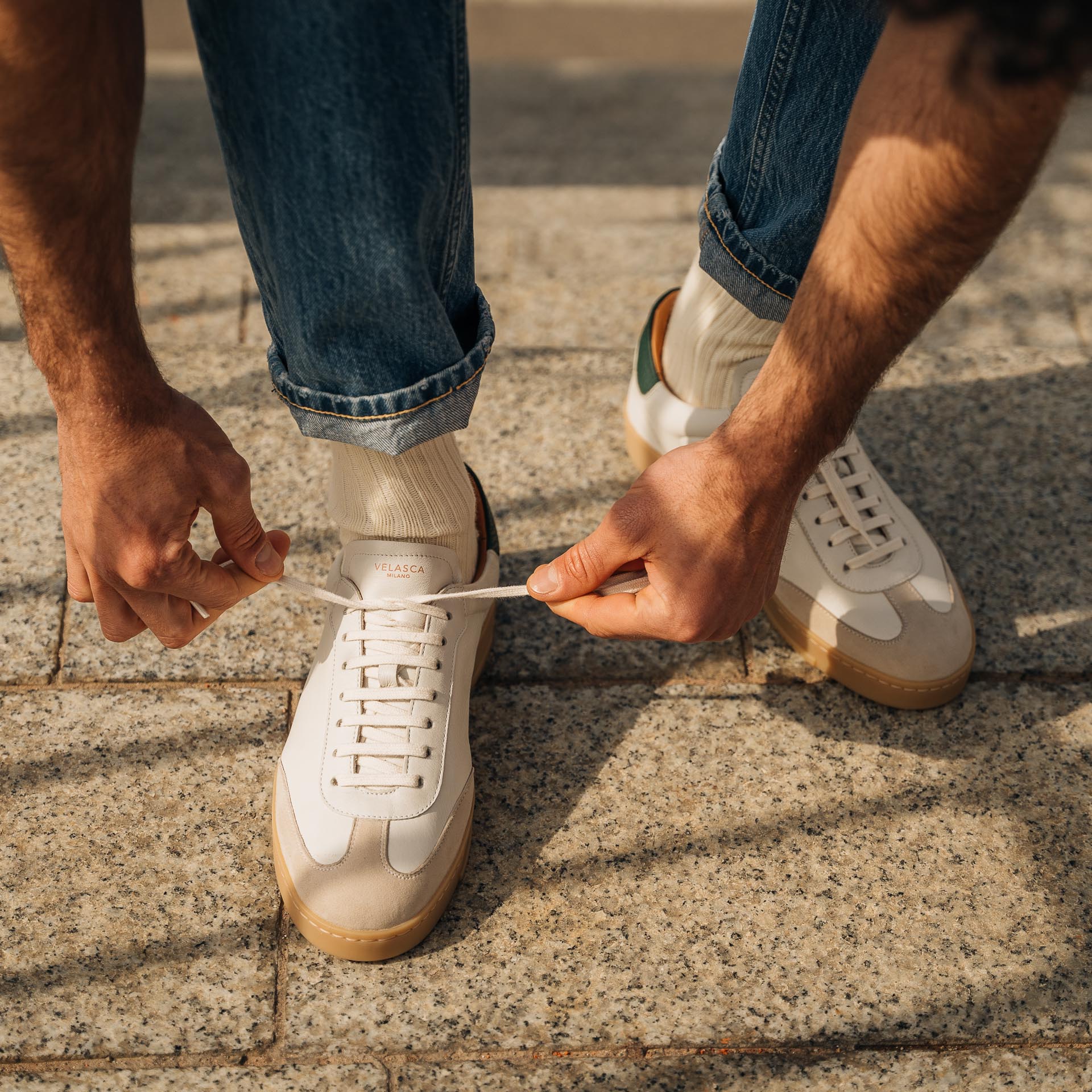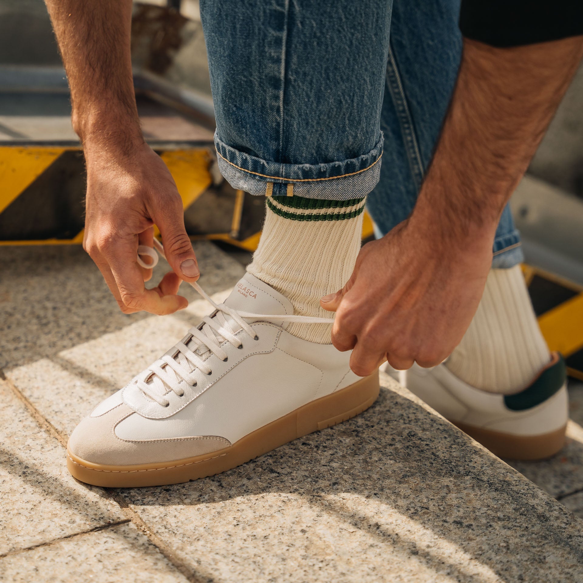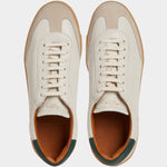 The sneaker Adriano Panatta would love, inspired by the tennis courts of the Seventies. In smooth calfskin with suede on the toe and a smooth amber rubber sole, and a removable insole. The logo has been specially redesigned for this sporty line with simple contours. We paired it with turned-up jeans and a brick-coloured cotton jersey polo shirt.