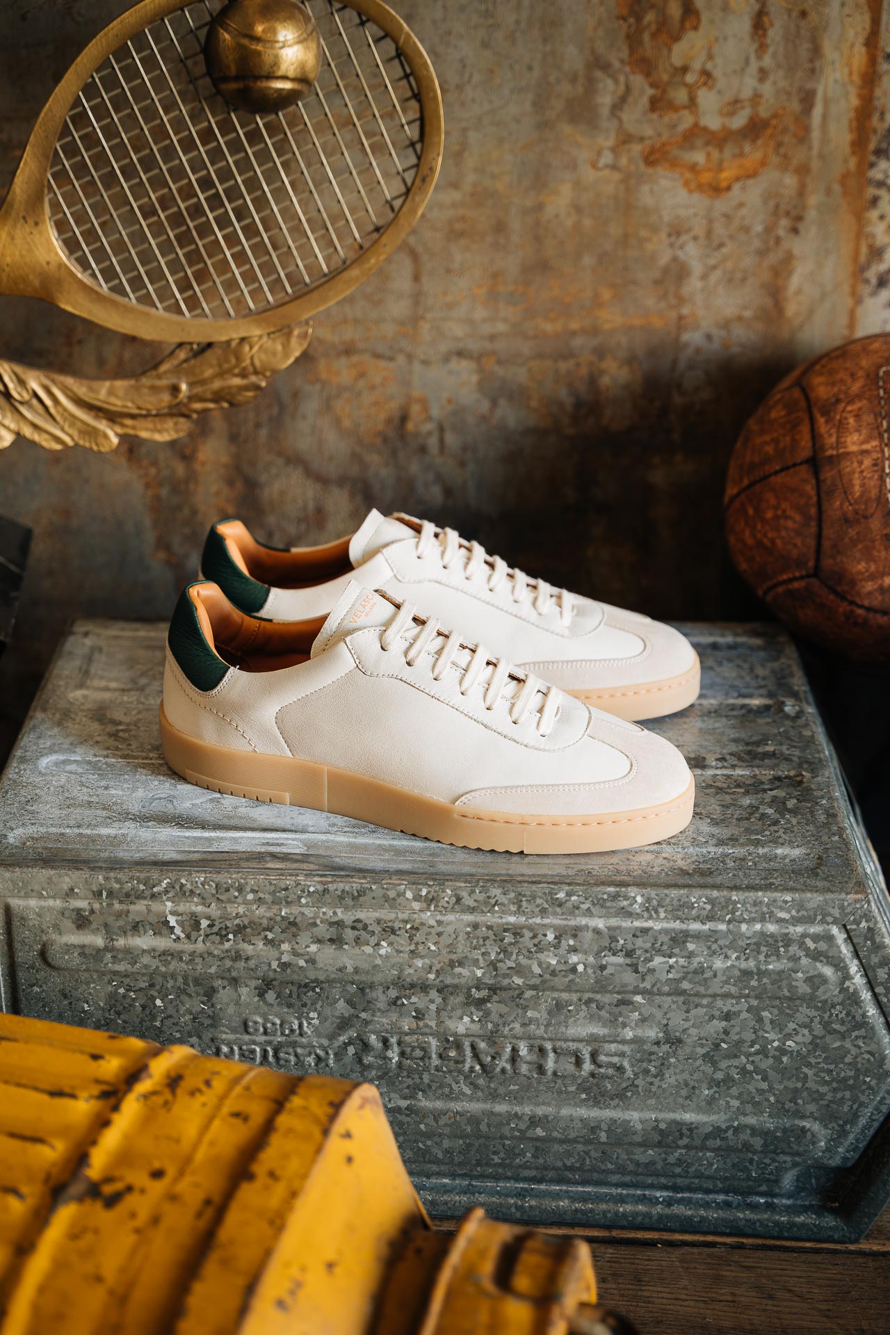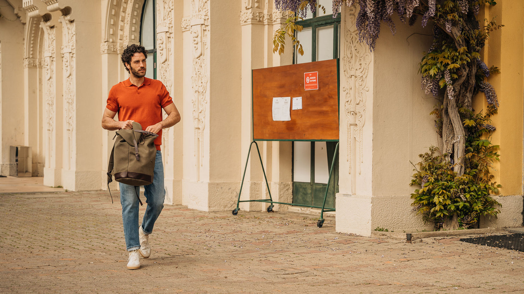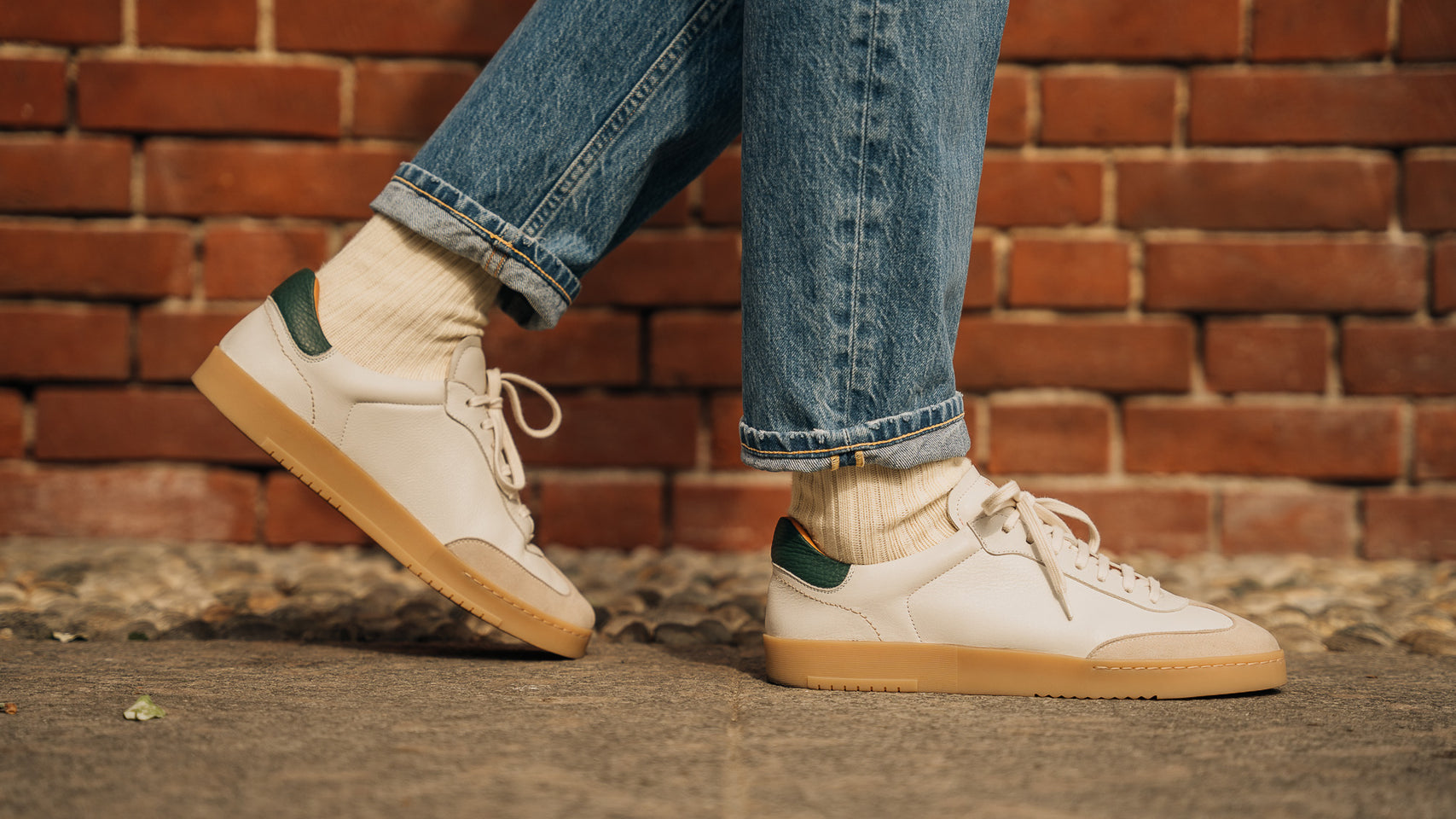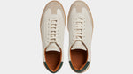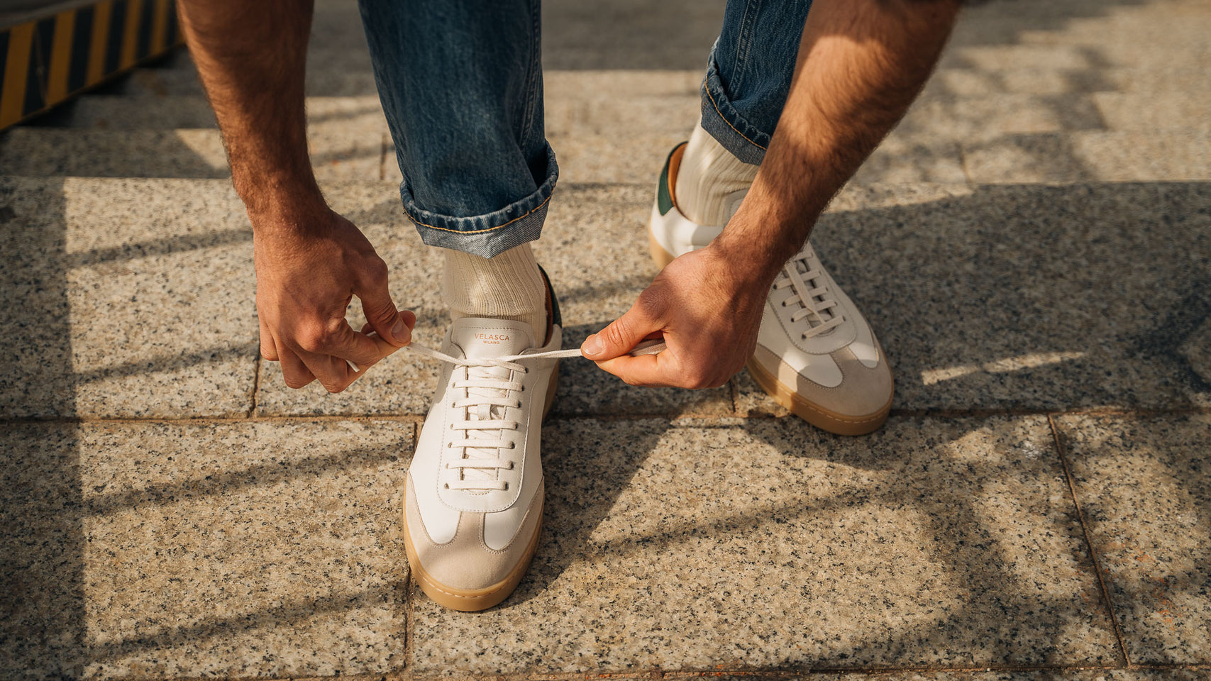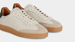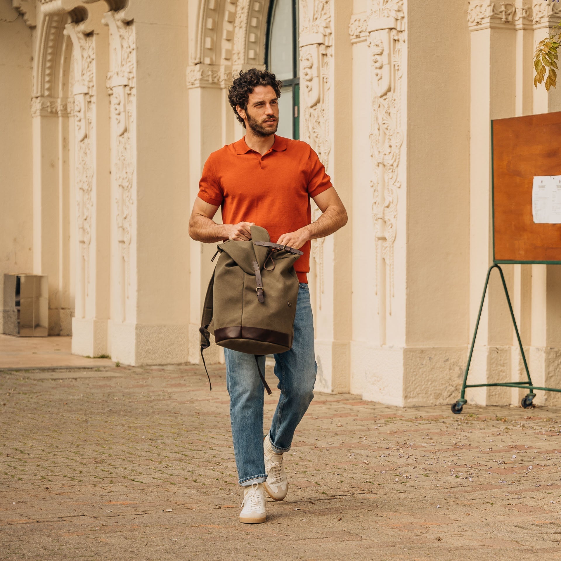 The sneaker Adriano Panatta would love, inspired by the tennis courts of the Seventies. In smooth calfskin with suede on the toe and a smooth amber rubber sole, and a removable insole. The logo has been specially redesigned for this sporty line with simple contours. We paired it with turned-up jeans and a brick-coloured cotton jersey polo shirt.