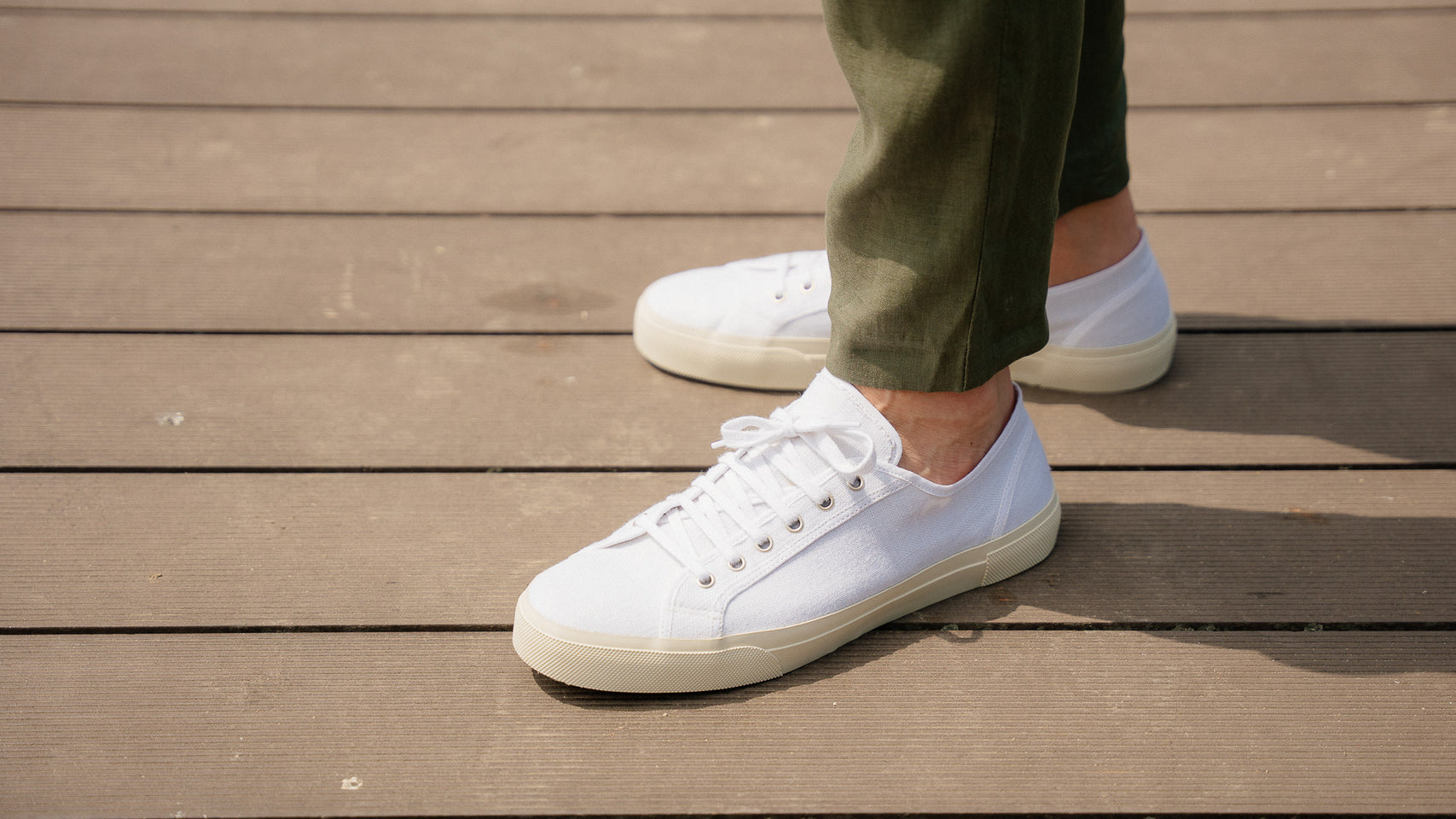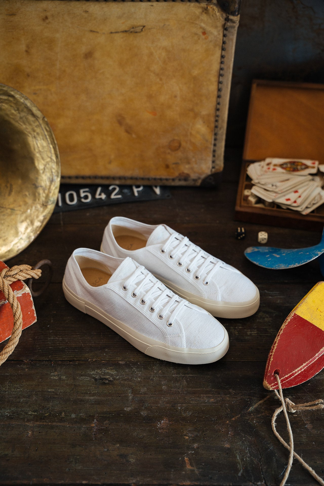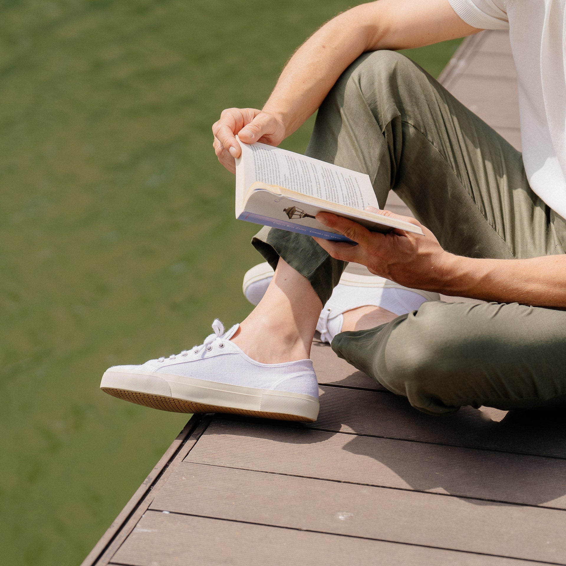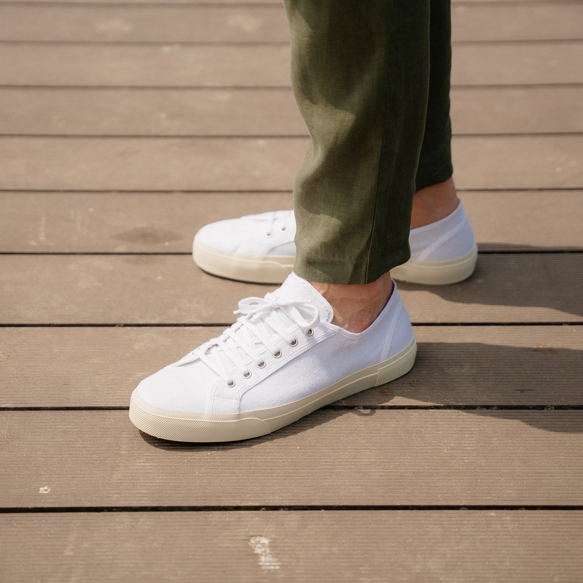 Our handcrafted sneakers with a vintage soul, in white linen. The sole is composed of a rubber band that wraps around, joining the Vibram sole to the linen upper. Summer is waiting, and socks aren’t invited.