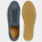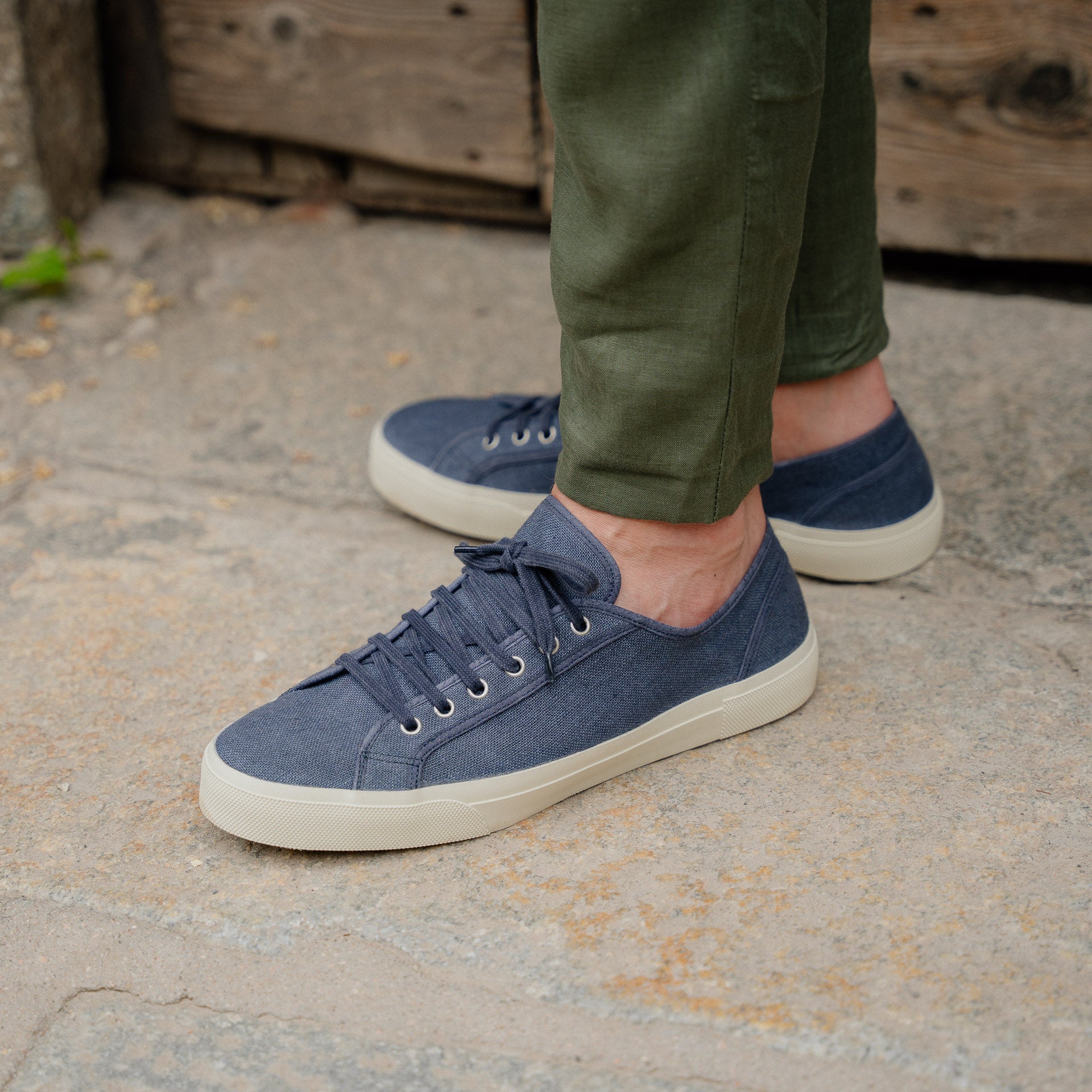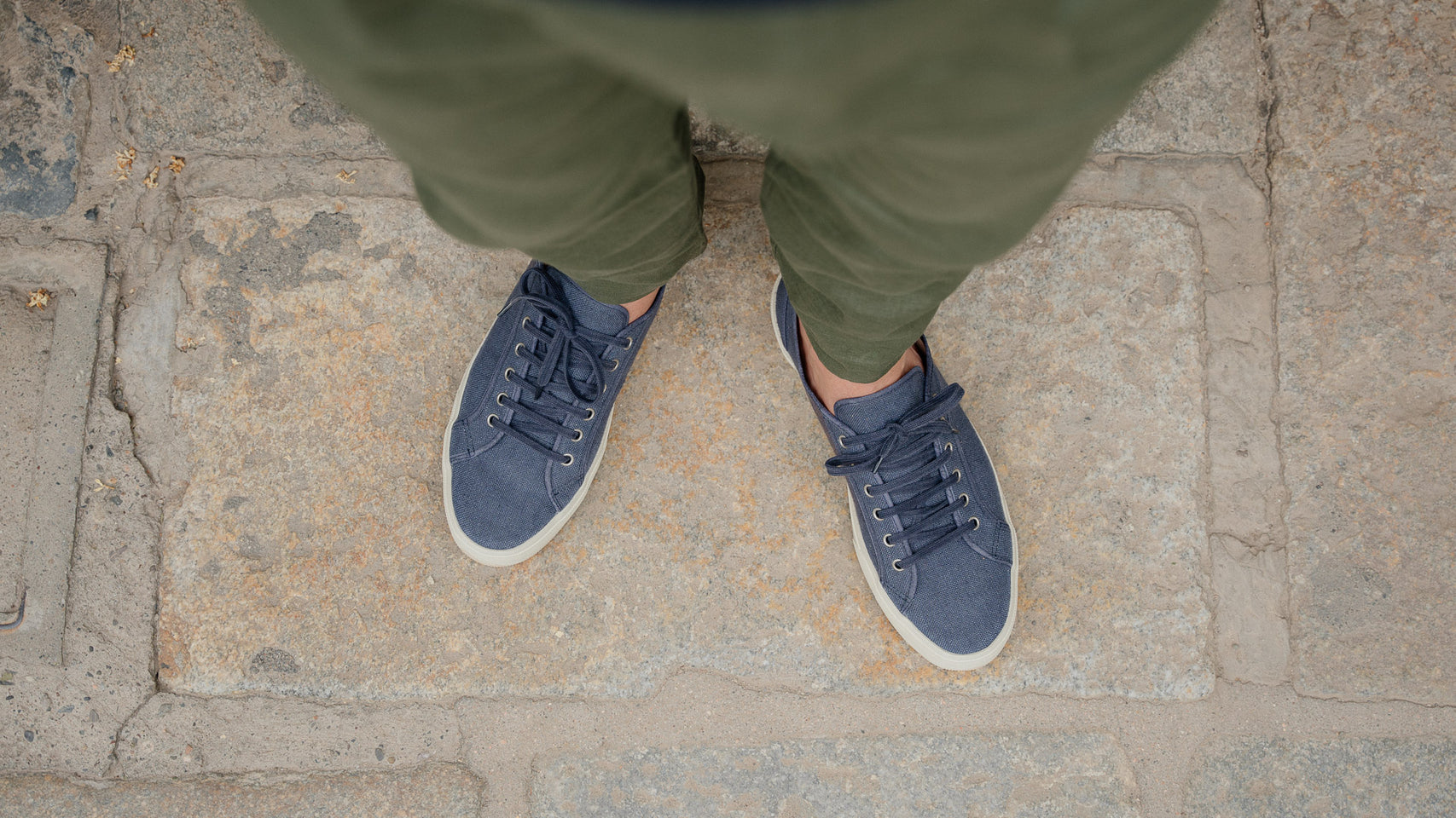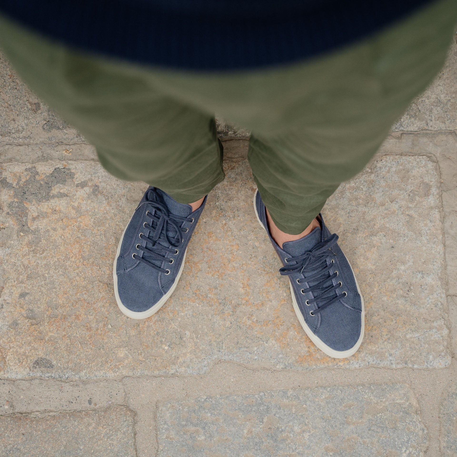 Our handcrafted sneakers with a vintage soul, in blue linen. The sole is composed of a rubber band that wraps around, joining the Vibram sole to the linen upper. Summer is waiting, and socks aren’t invited.