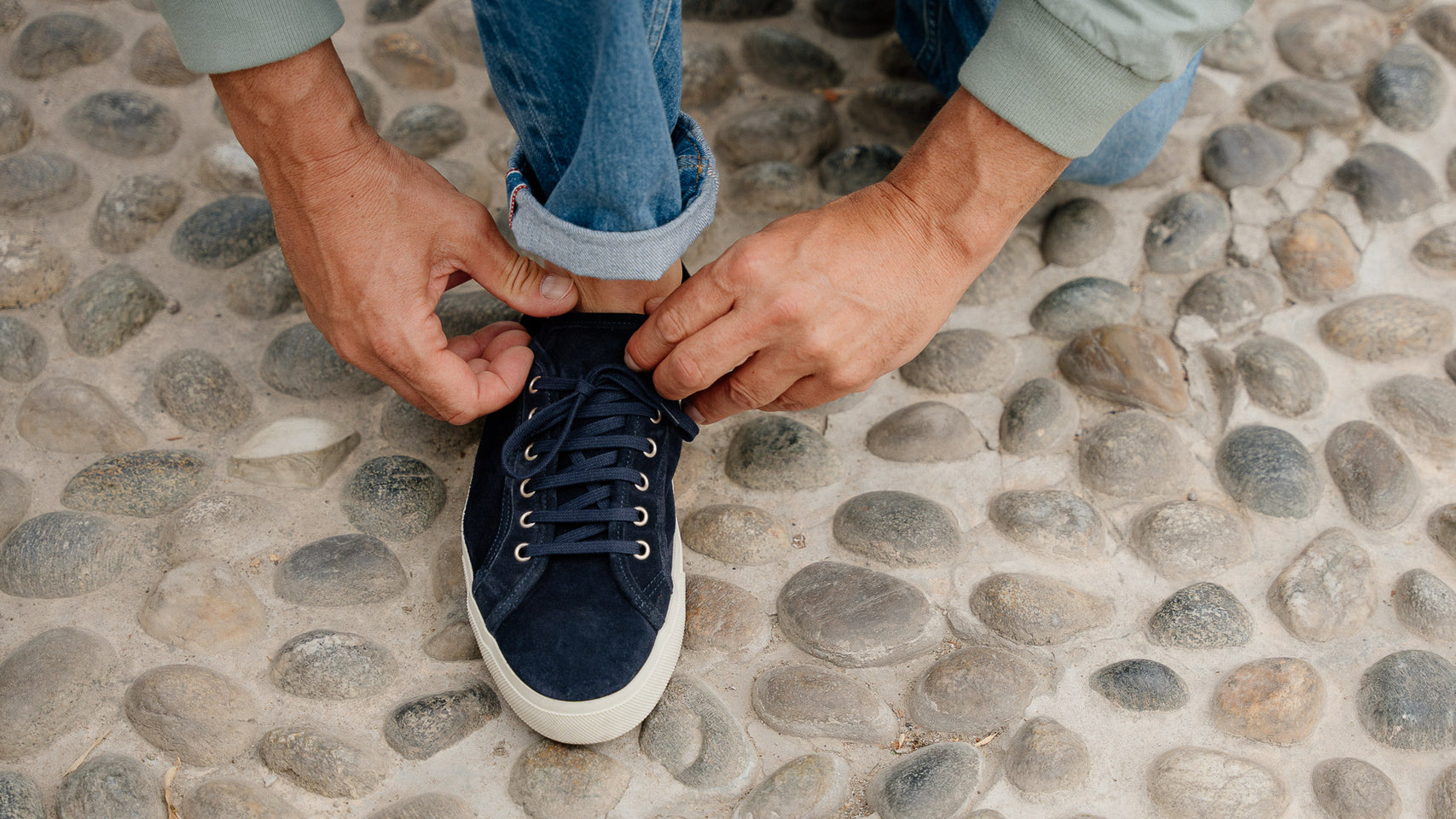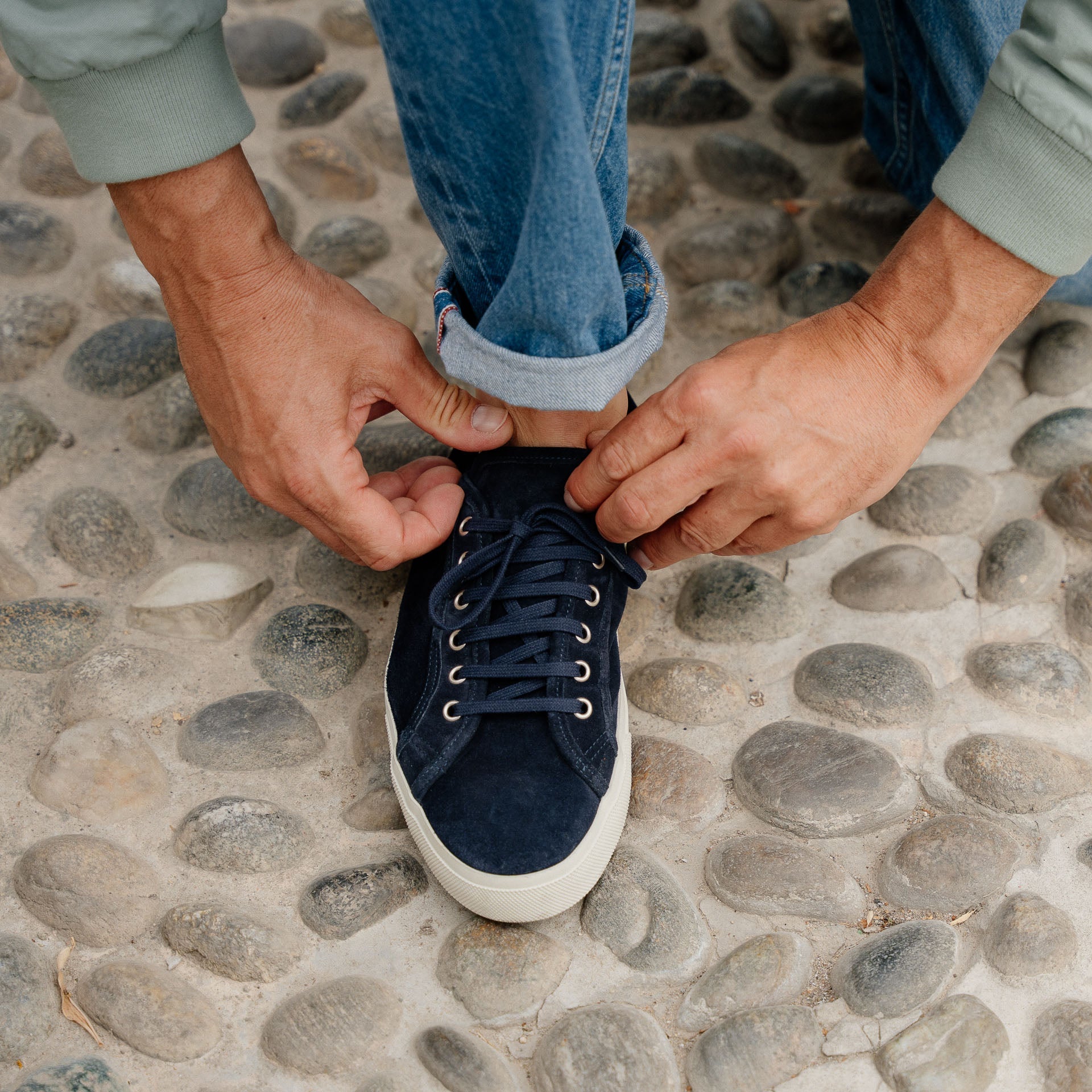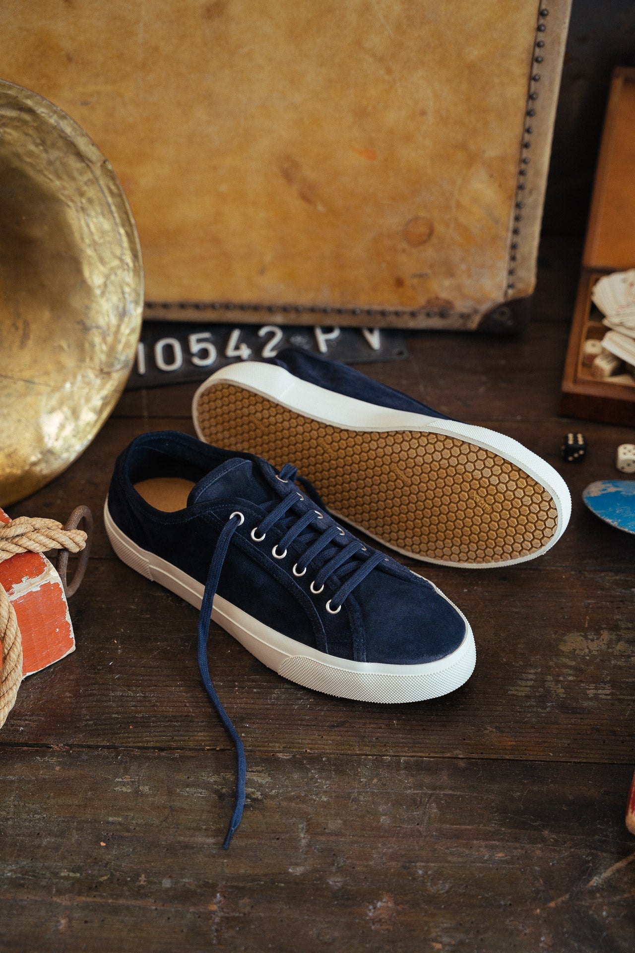 Our handcrafted sneakers with a vintage soul, in blue suede leather. The sole is composed of a rubber band that wraps around, joining the Vibram sole to the linen upper. Summer is waiting, and socks aren’t invited.