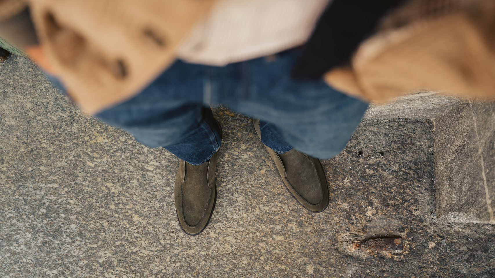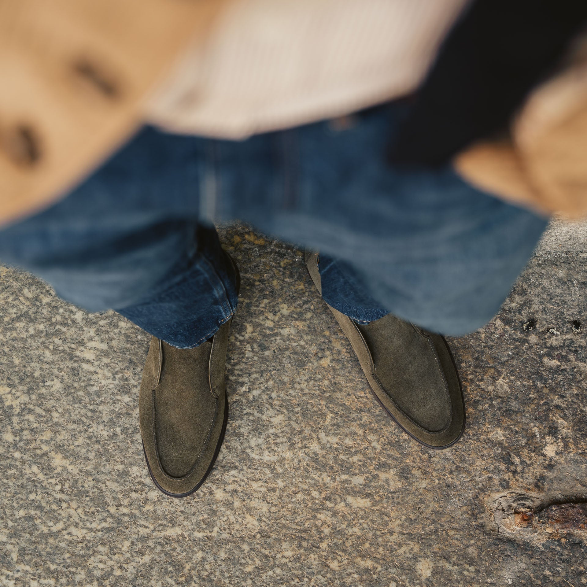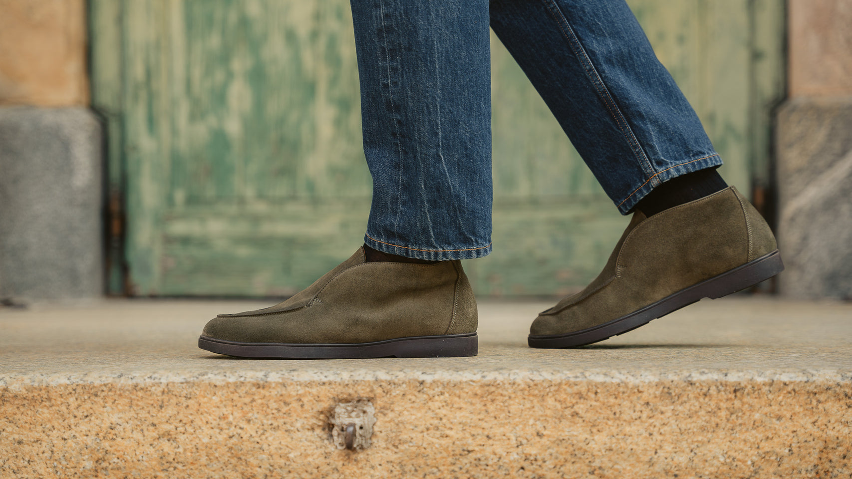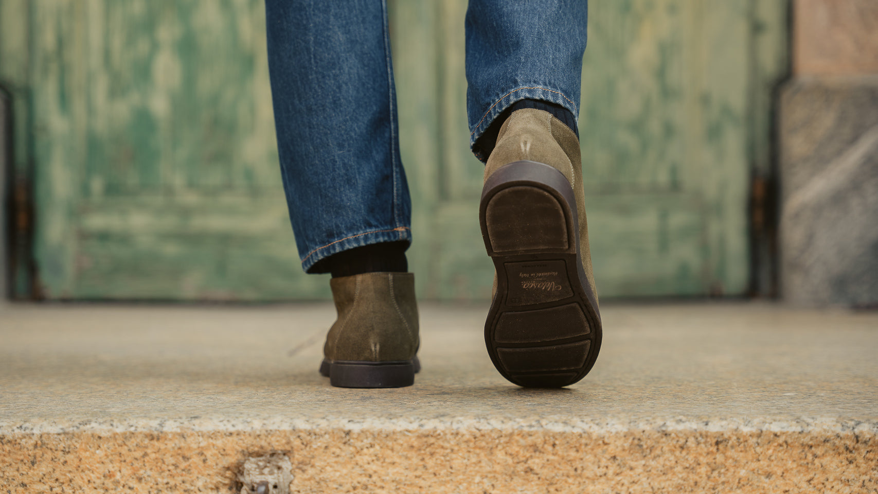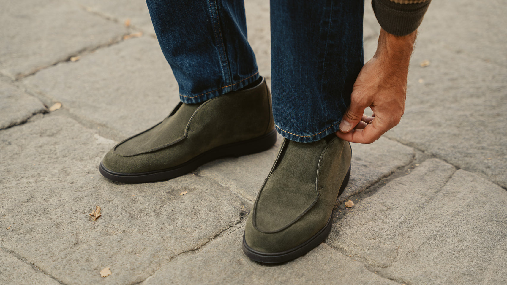 They are the unlaced ankle boots, handmade in Italy. The lack of laces makes them extremely practical, facilitating the “put on-take off'' while the rubber sole with ridges on the bottom is designed to make your step more comfortable. We paired them with a wide-ribbed corduroy jacket, a shirt with thin lines and jeans.