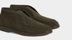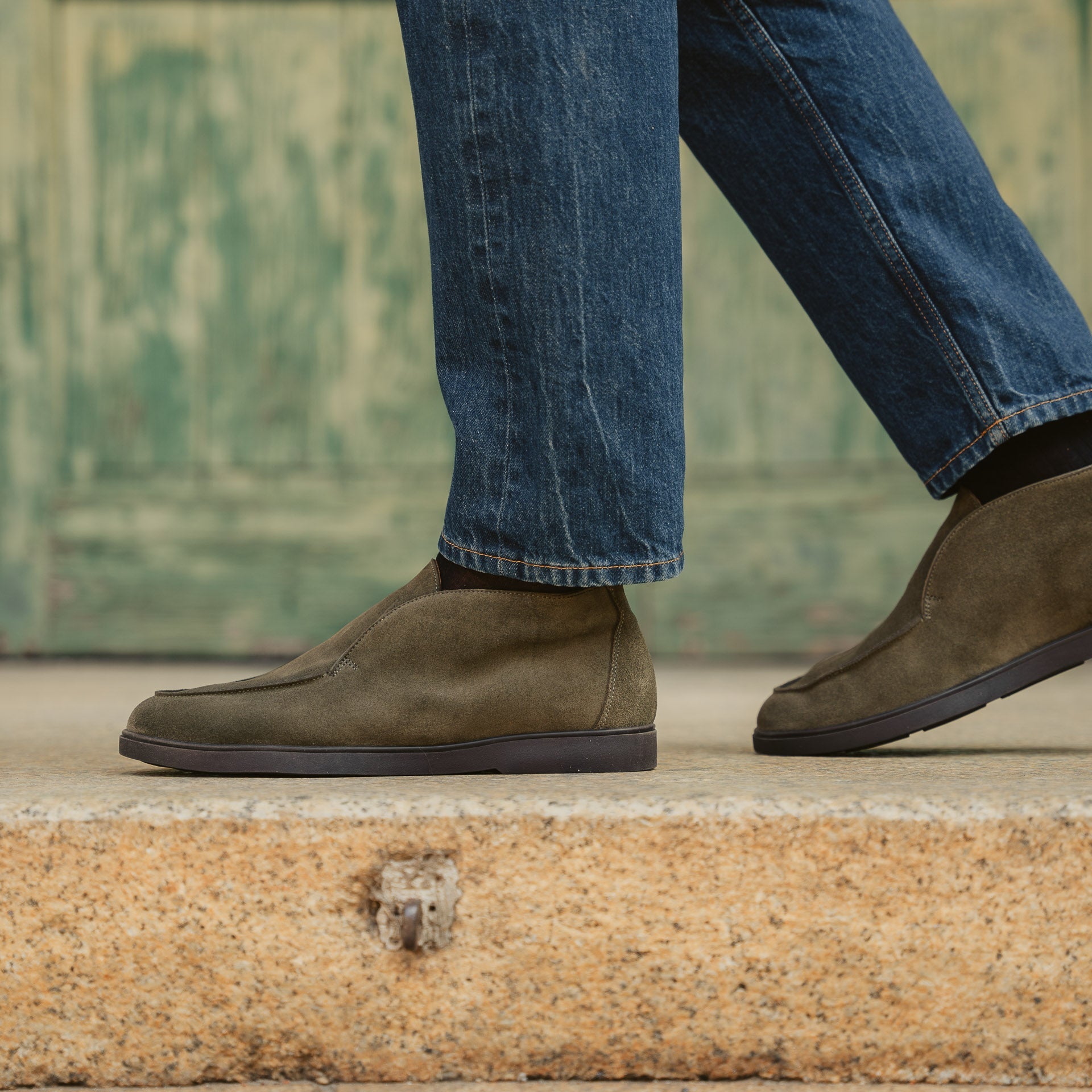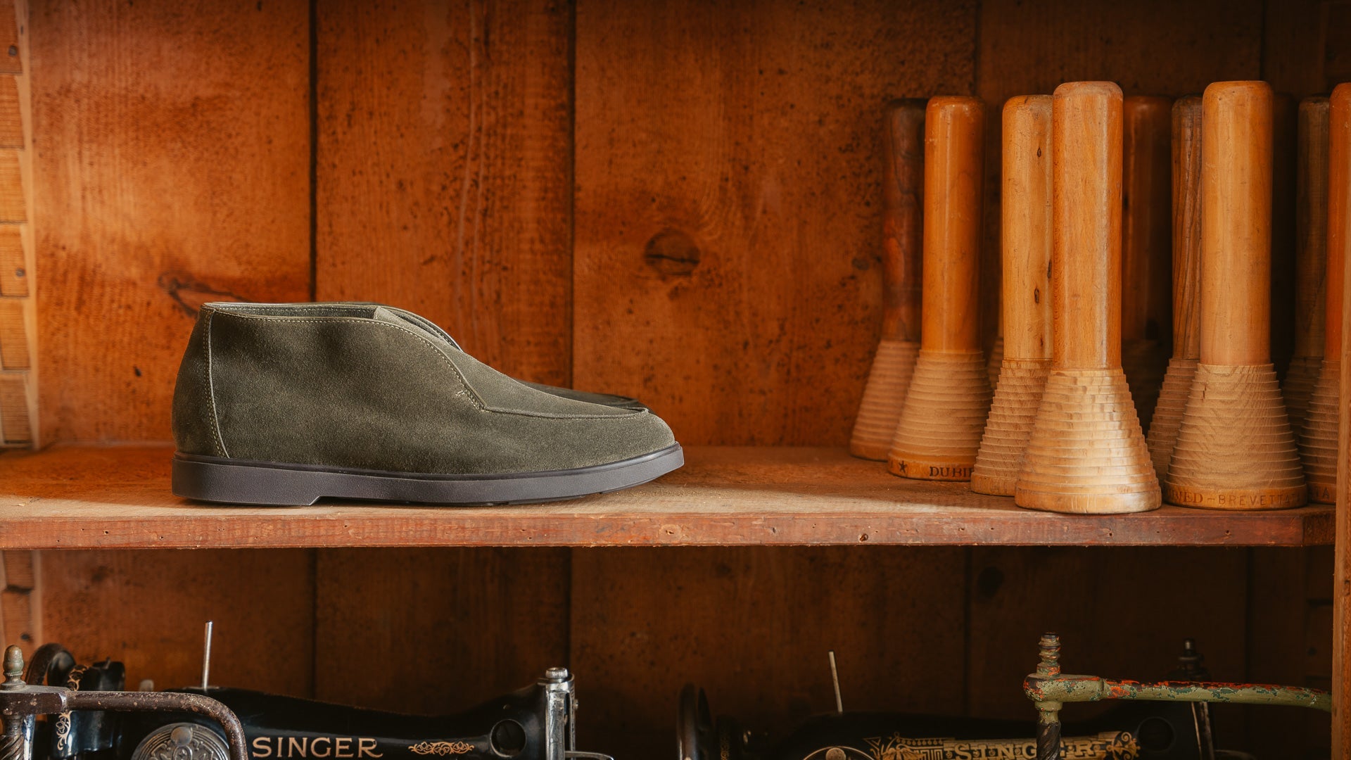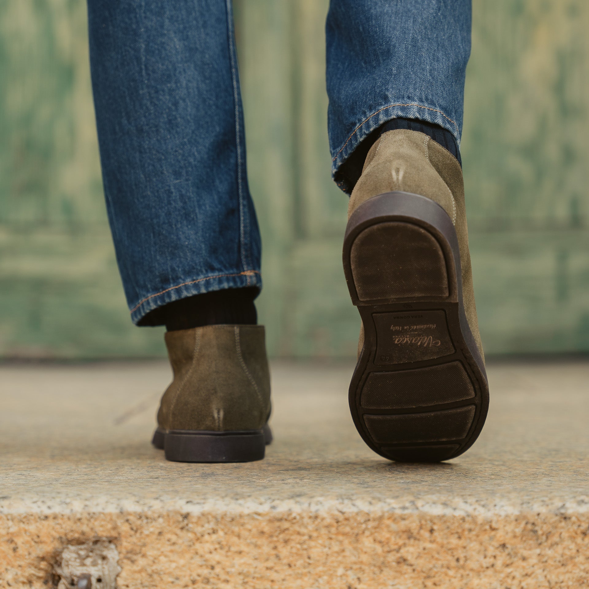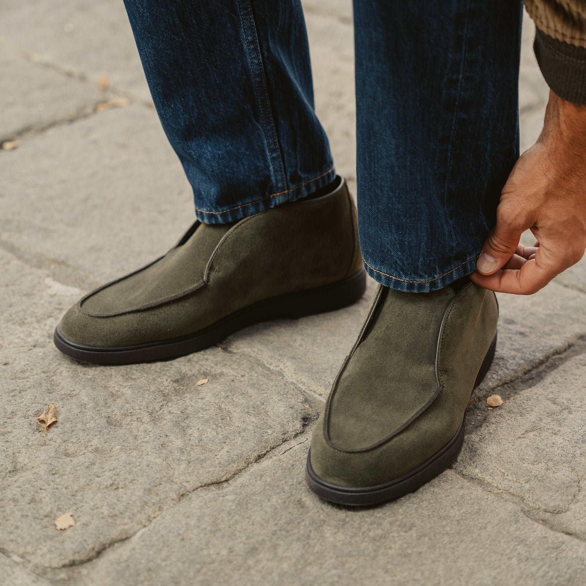 They are the unlaced ankle boots, handmade in Italy. The lack of laces makes them extremely practical, facilitating the “put on-take off'' while the rubber sole with ridges on the bottom is designed to make your step more comfortable. We paired them with a wide-ribbed corduroy jacket, a shirt with thin lines and jeans.