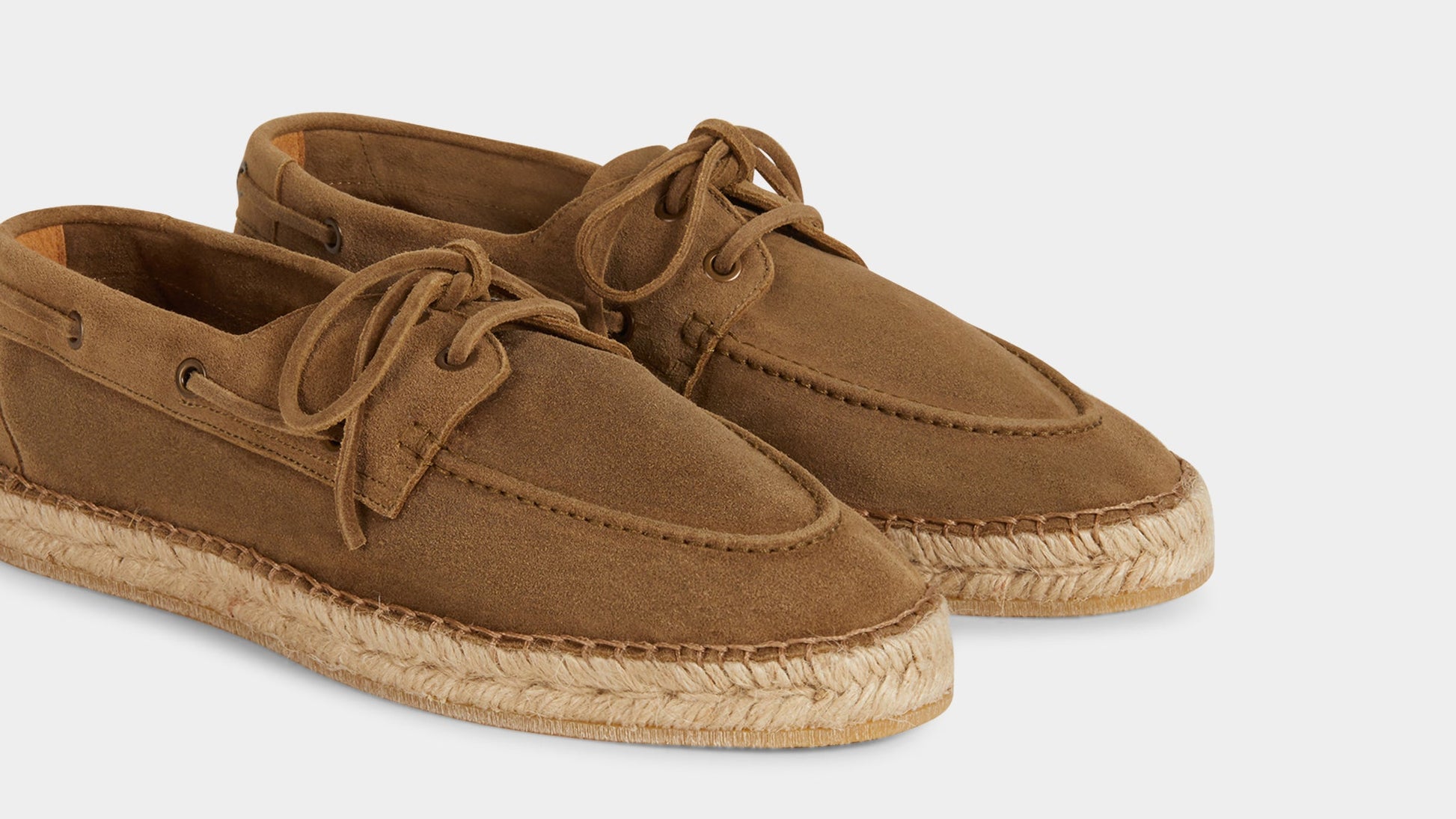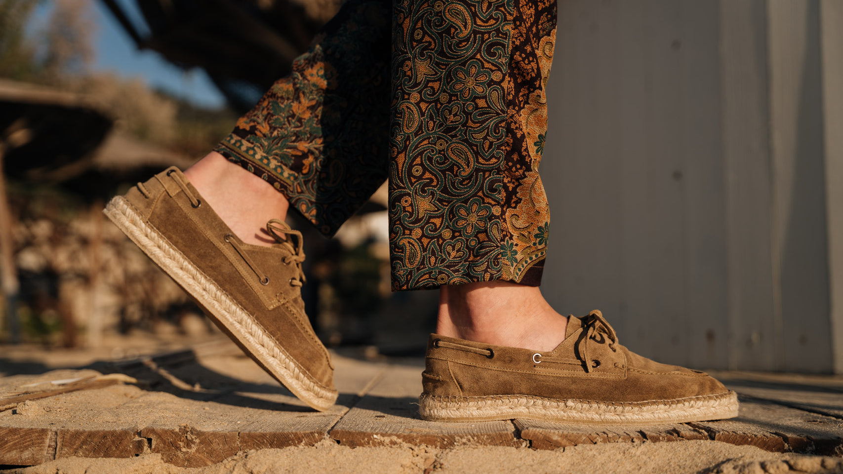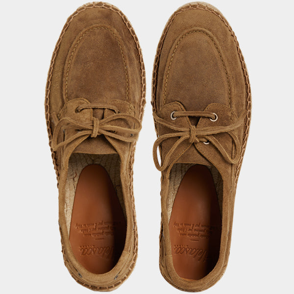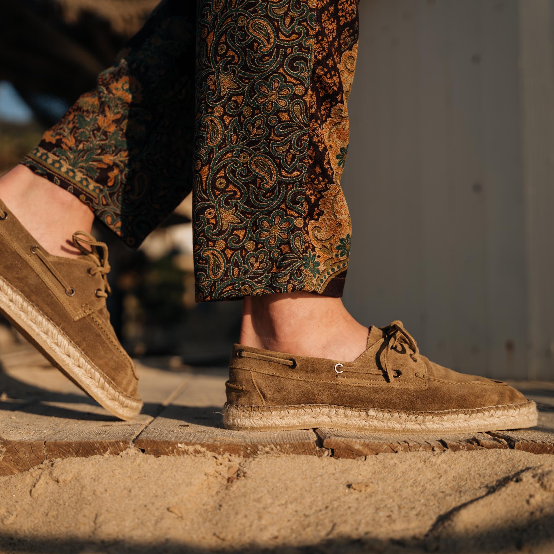 Our espadrilles inspired by the sailing tradition, in suede calfskin. The leather upper is joined to the sole with a hand-stitched seam. Here it meets hand-woven rope and rubber. With a linen safari jacket, a grey melange T-shirt and a pair of soft patterned trousers, it's down to the beach.
