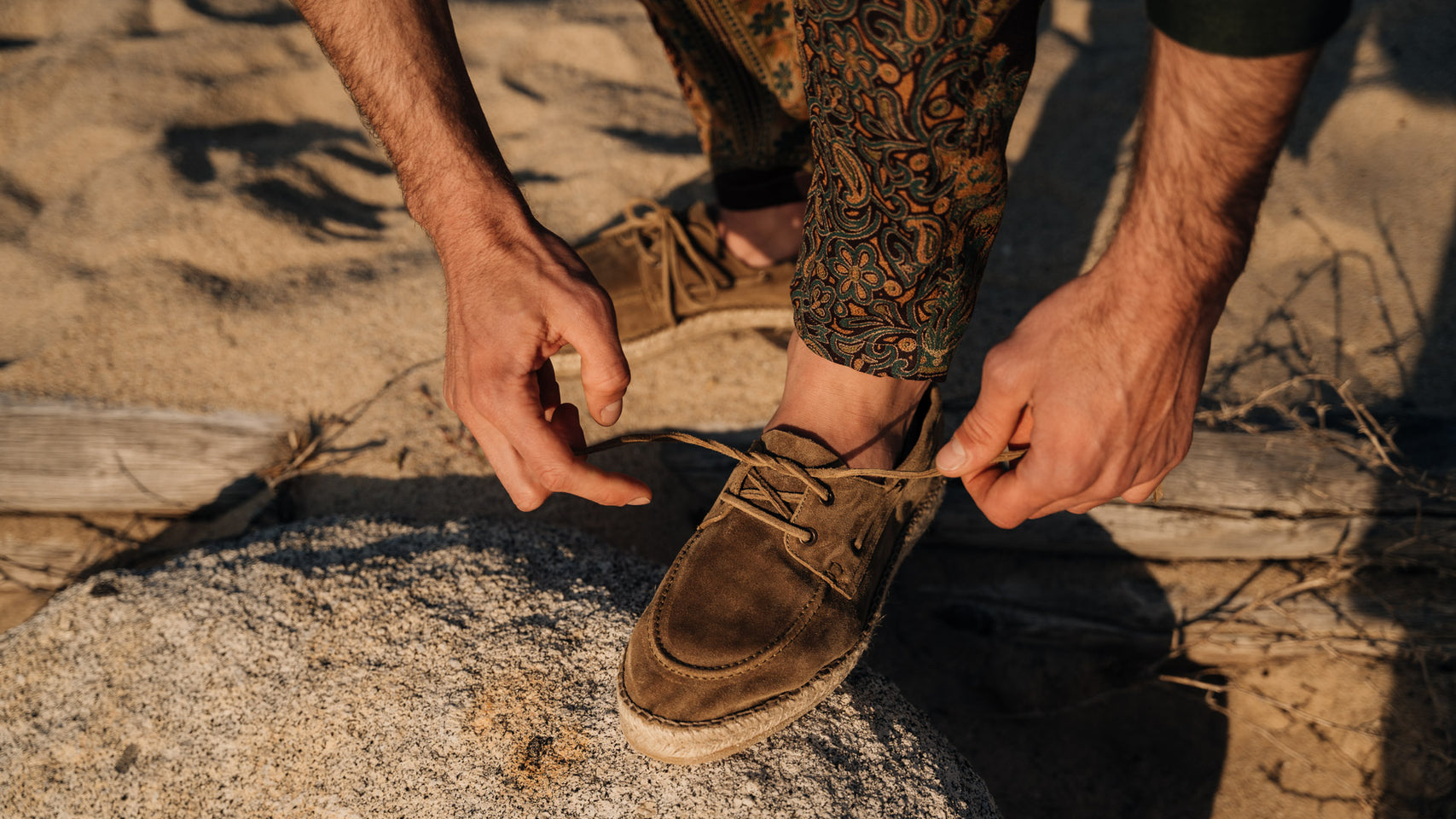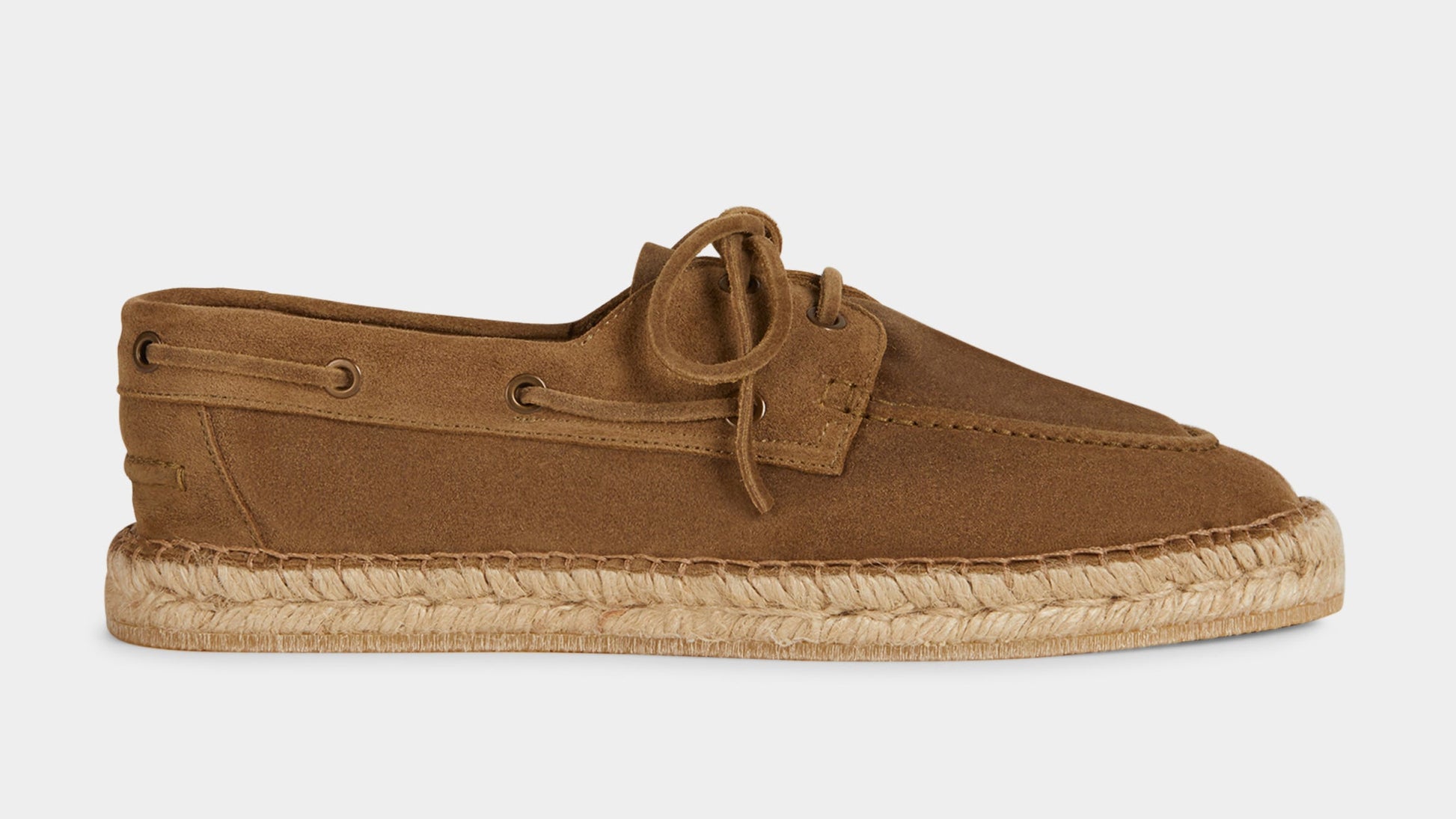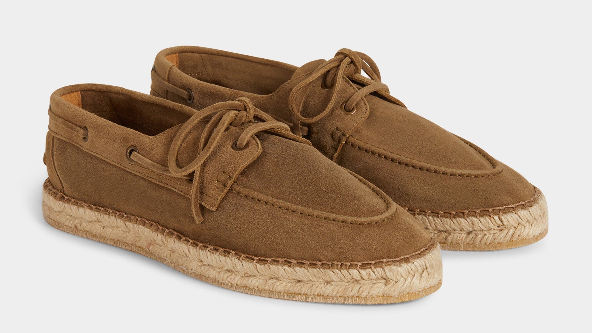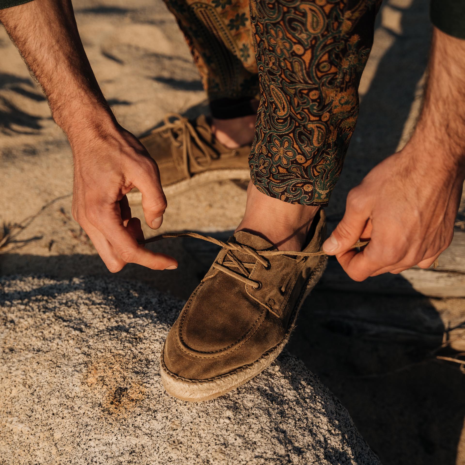 Our espadrilles inspired by the sailing tradition, in suede calfskin. The leather upper is joined to the sole with a hand-stitched seam. Here it meets hand-woven rope and rubber. With a linen safari jacket, a grey melange T-shirt and a pair of soft patterned trousers, it's down to the beach.