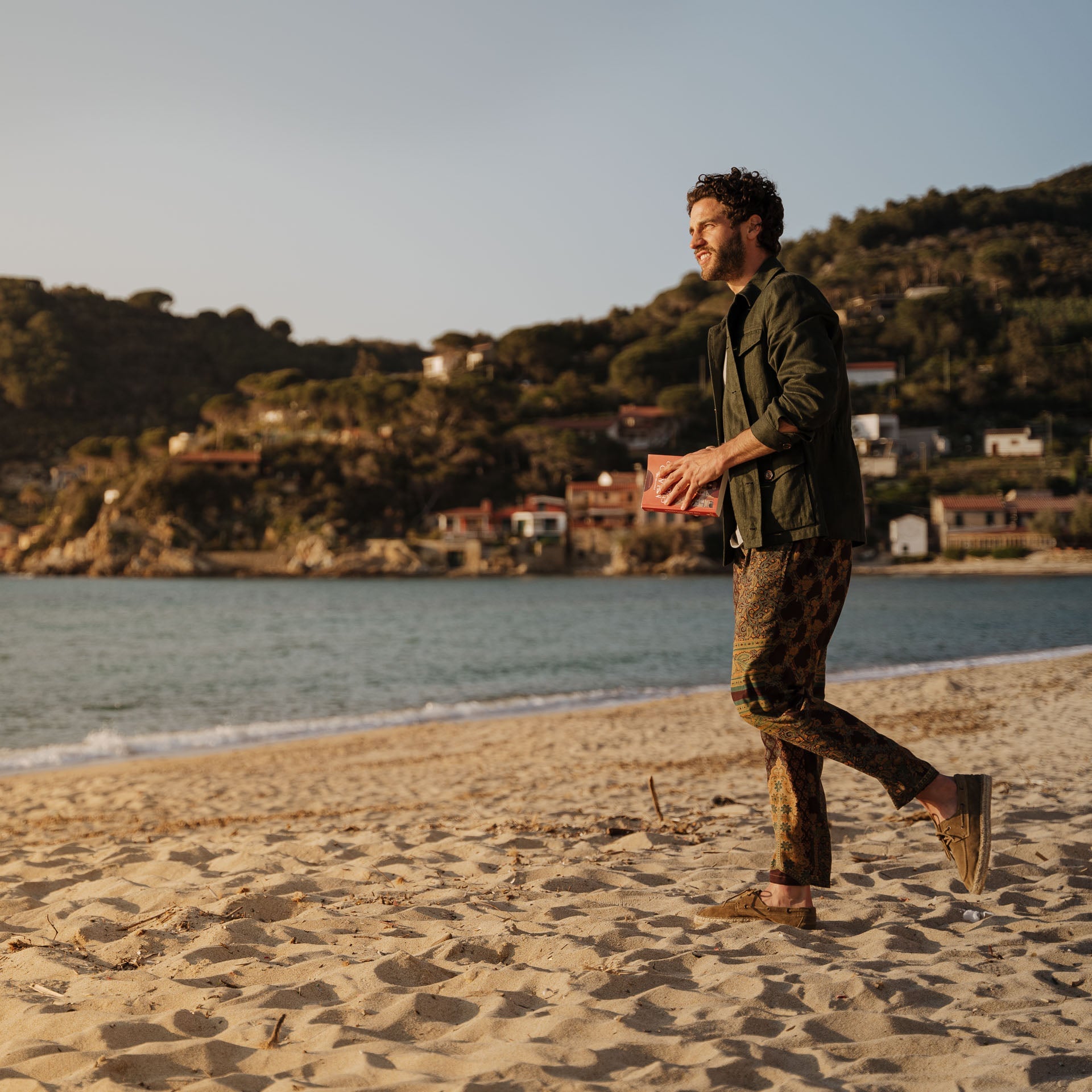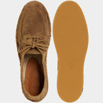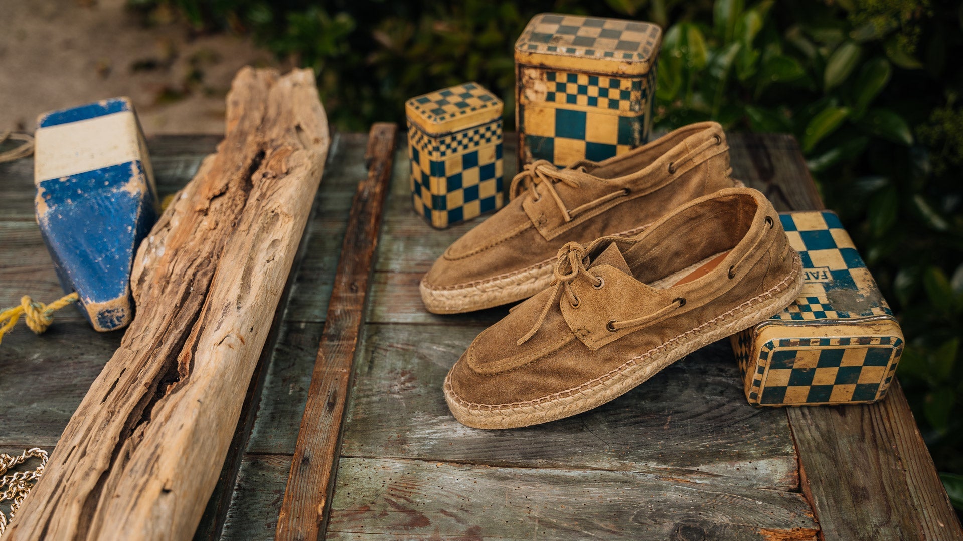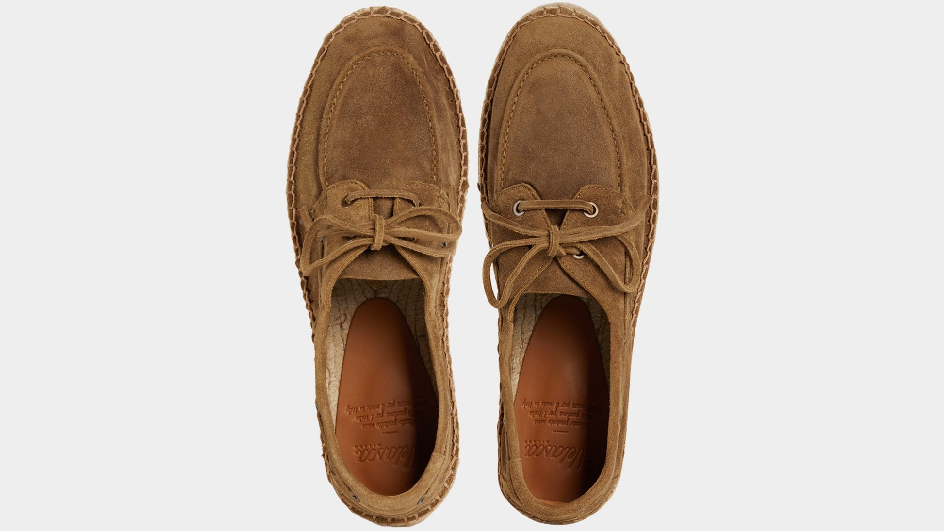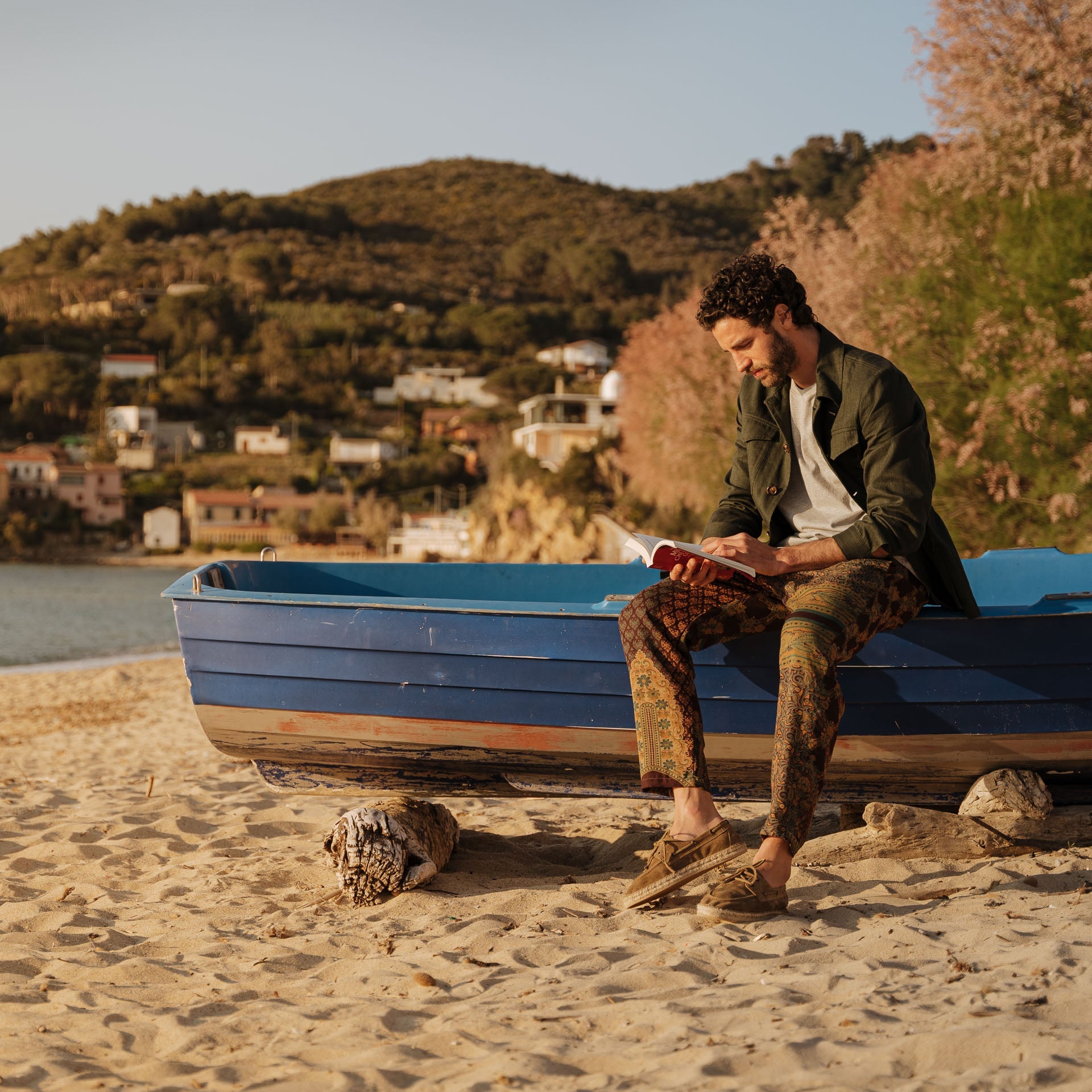 Our espadrilles inspired by the sailing tradition, in suede calfskin. The leather upper is joined to the sole with a hand-stitched seam. Here it meets hand-woven rope and rubber. With a linen safari jacket, a grey melange T-shirt and a pair of soft patterned trousers, it's down to the beach.