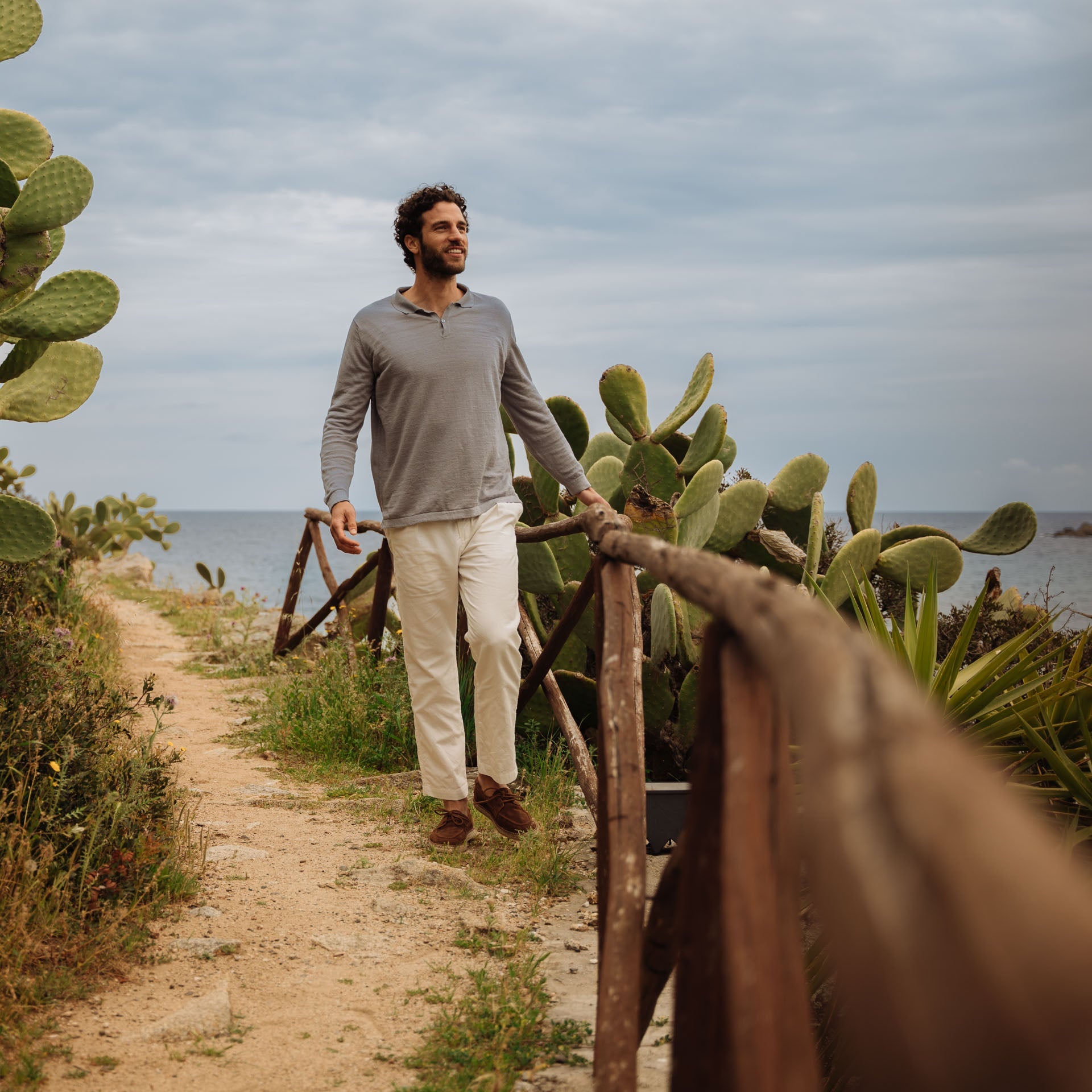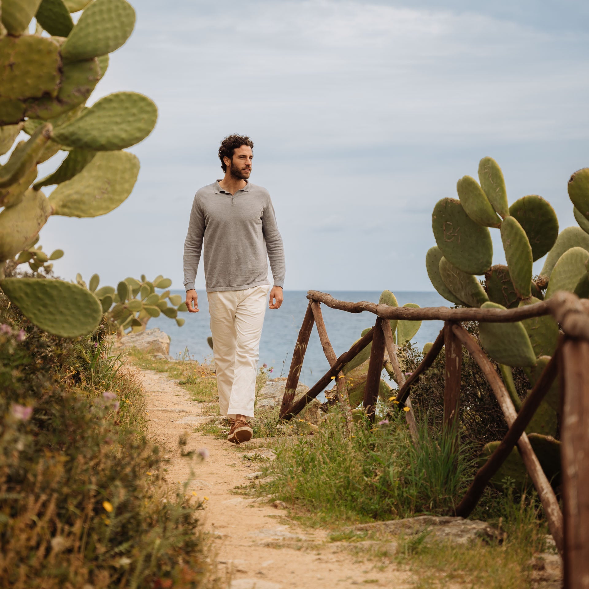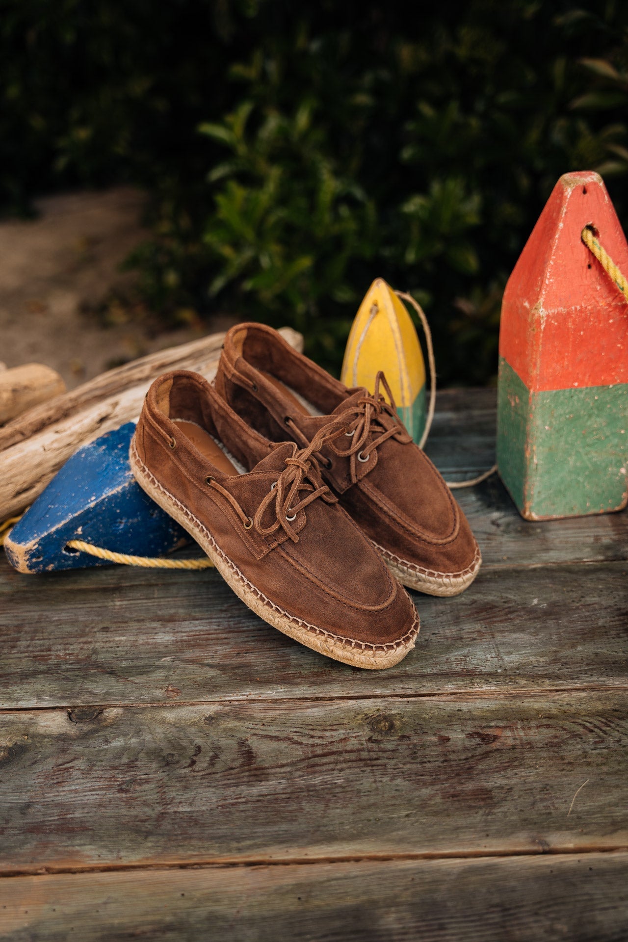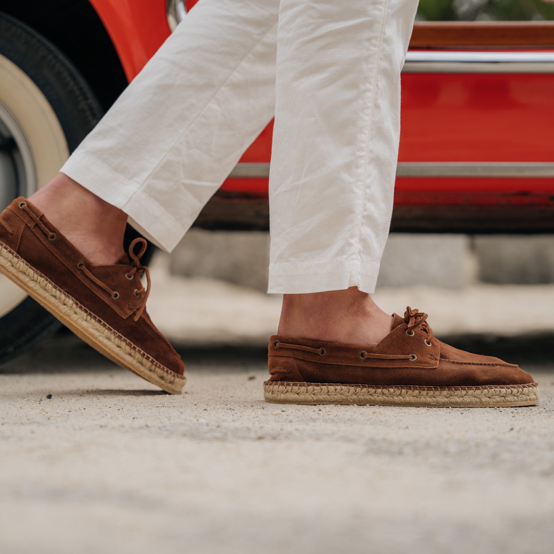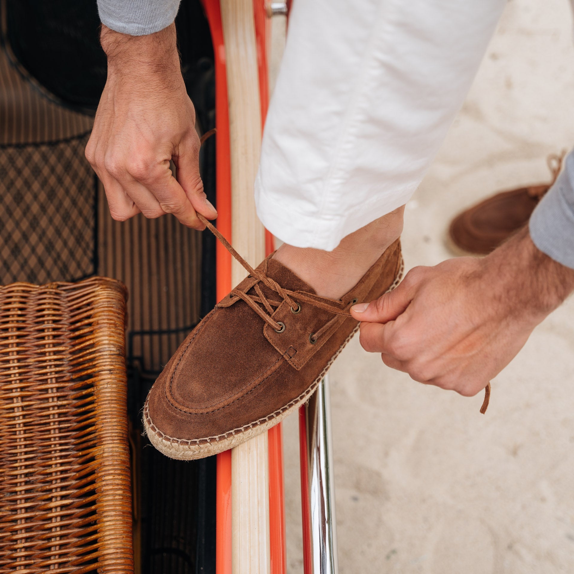 Our espadrilles inspired by the sailing tradition, in suede calfskin. The leather upper is joined to the sole with a hand-stitched seam. Here it meets hand-woven rope and rubber. Vintage combination: long-sleeved linen polo shirt and cotton trousers.
