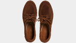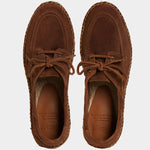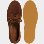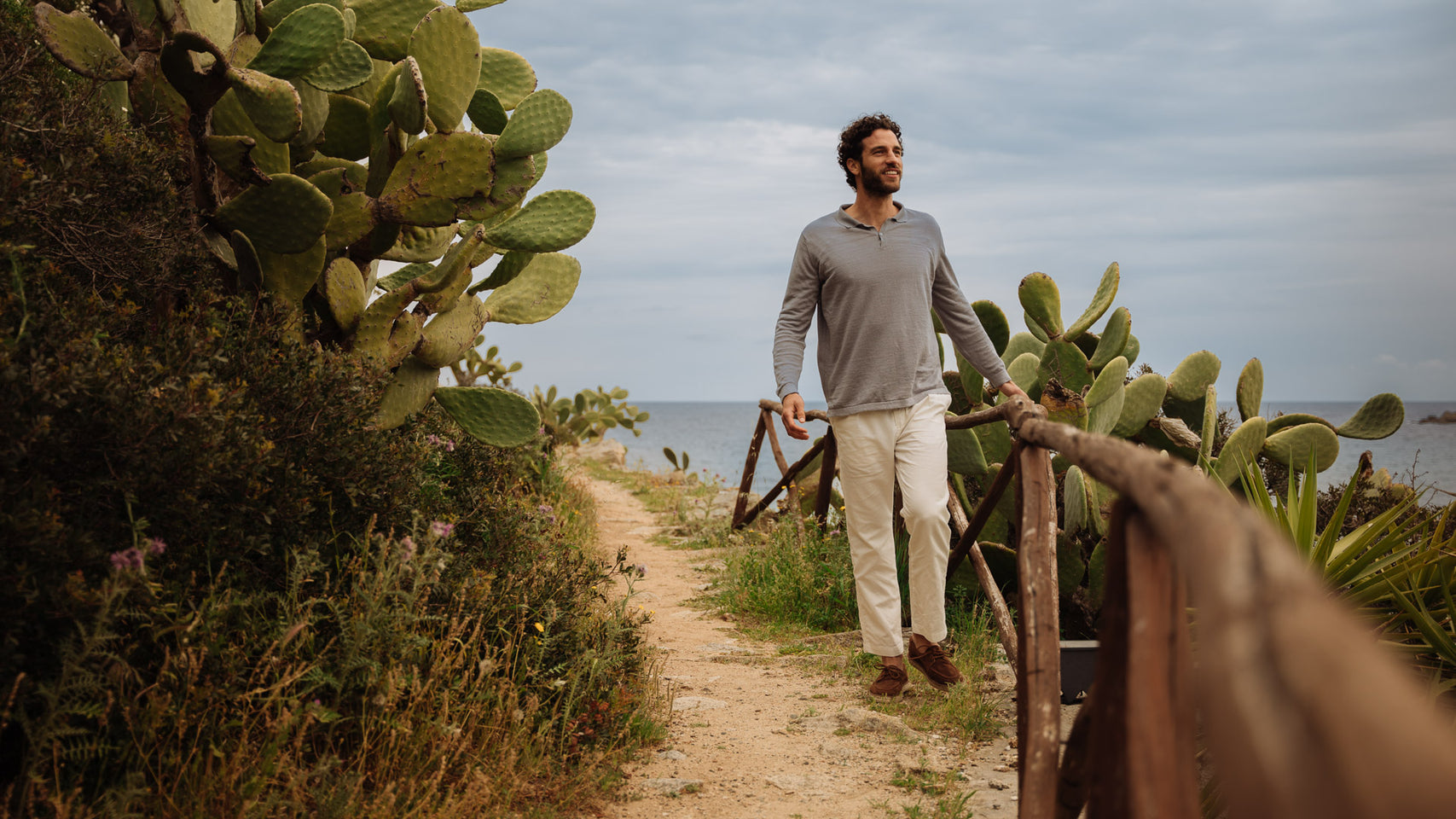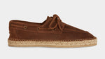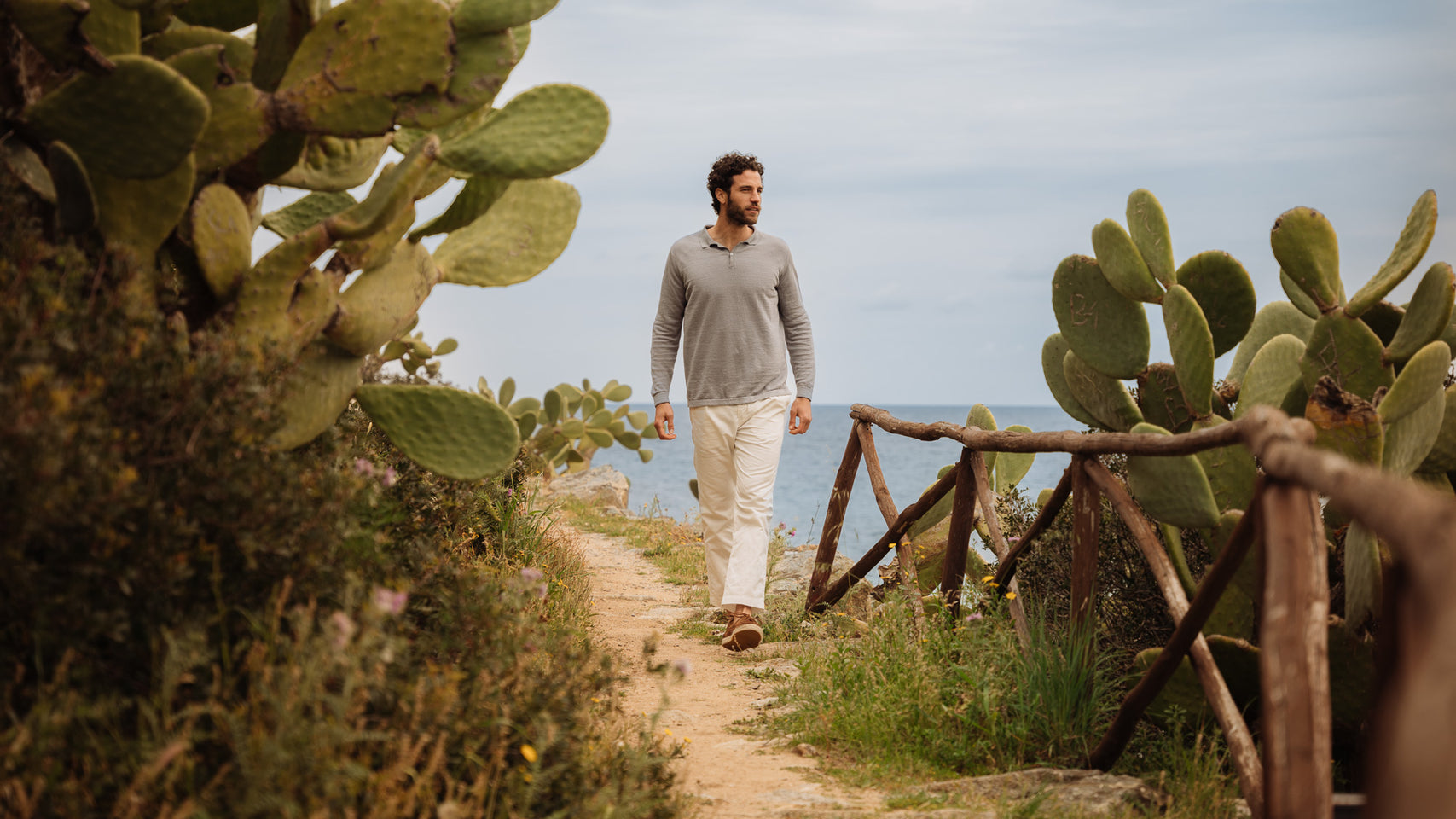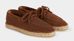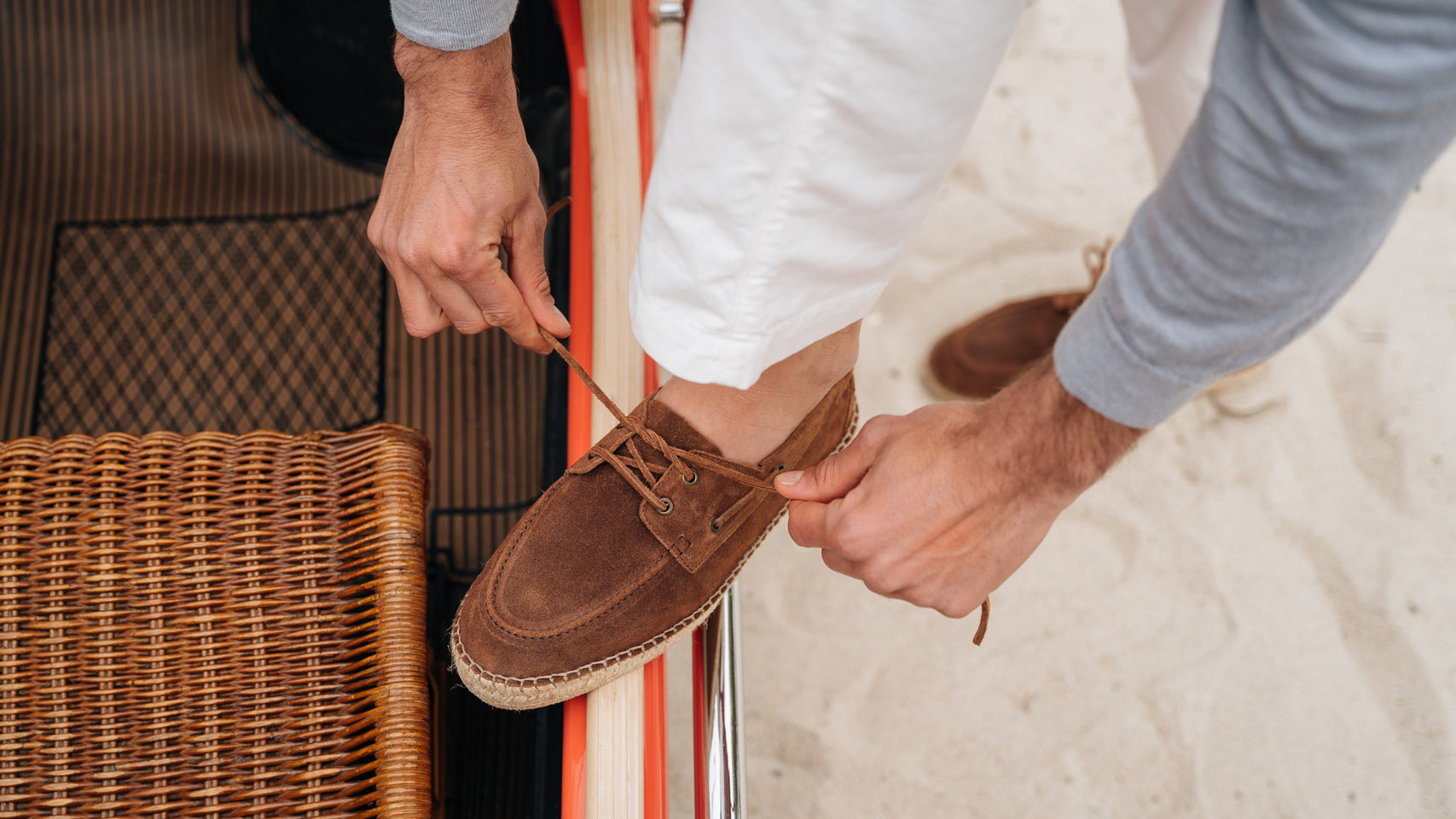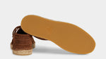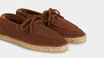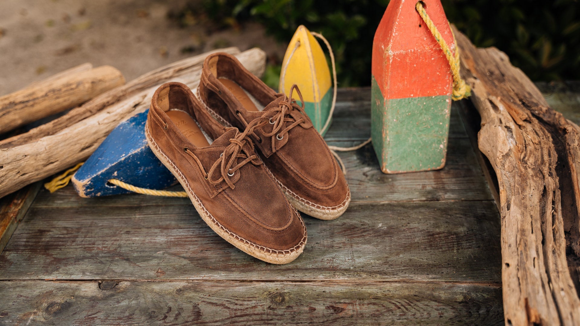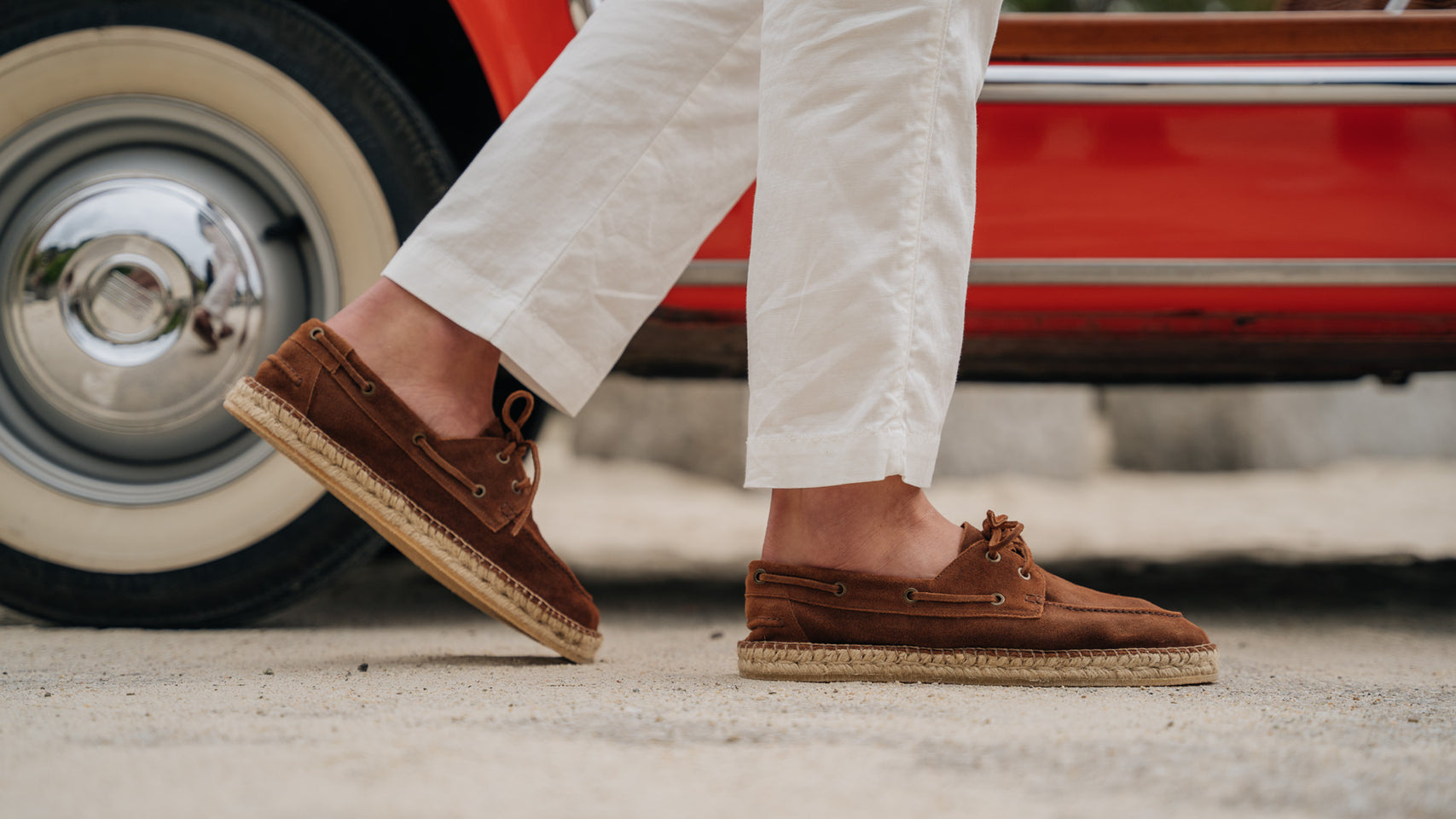 Our espadrilles inspired by the sailing tradition, in suede calfskin. The leather upper is joined to the sole with a hand-stitched seam. Here it meets hand-woven rope and rubber. Vintage combination: long-sleeved linen polo shirt and cotton trousers.