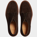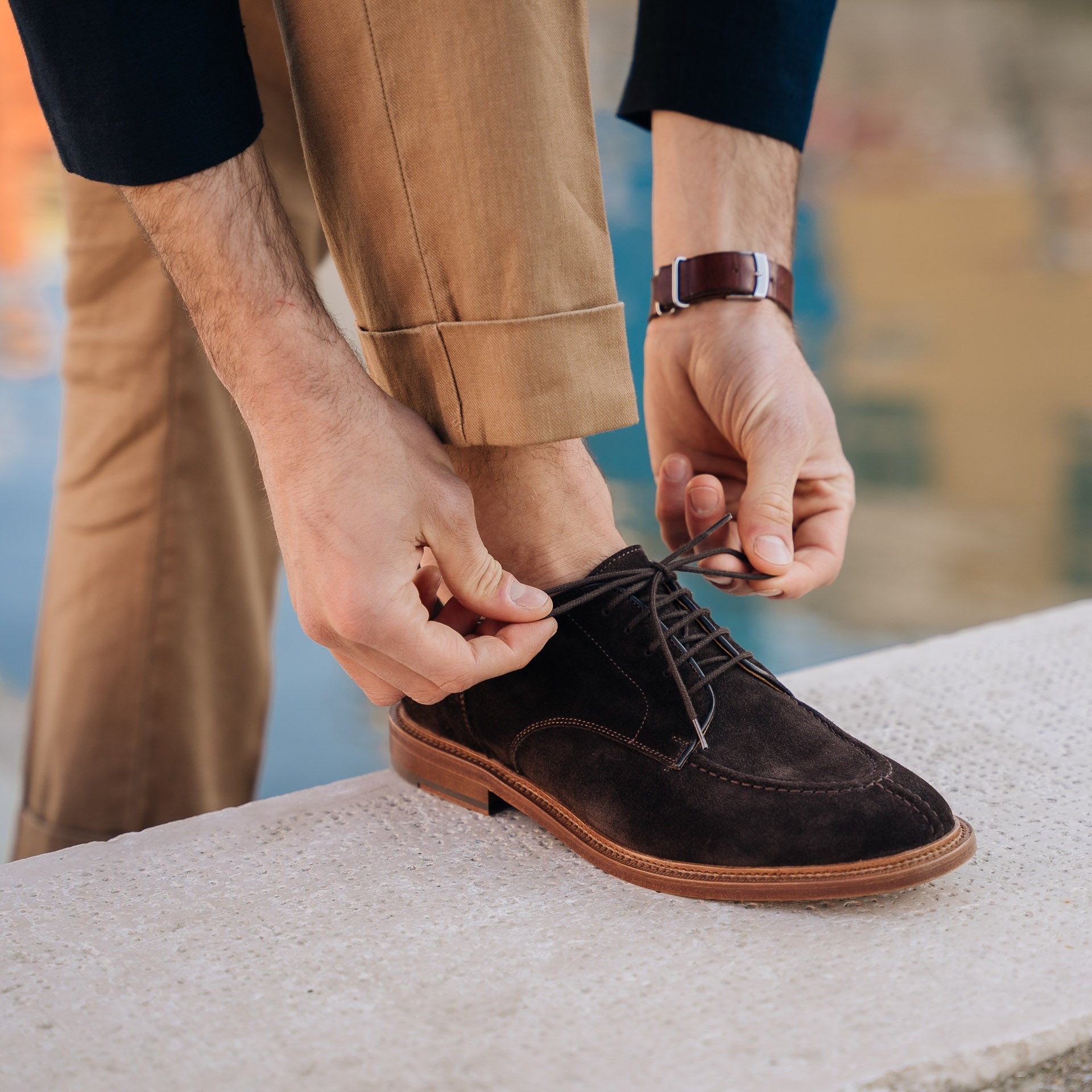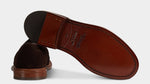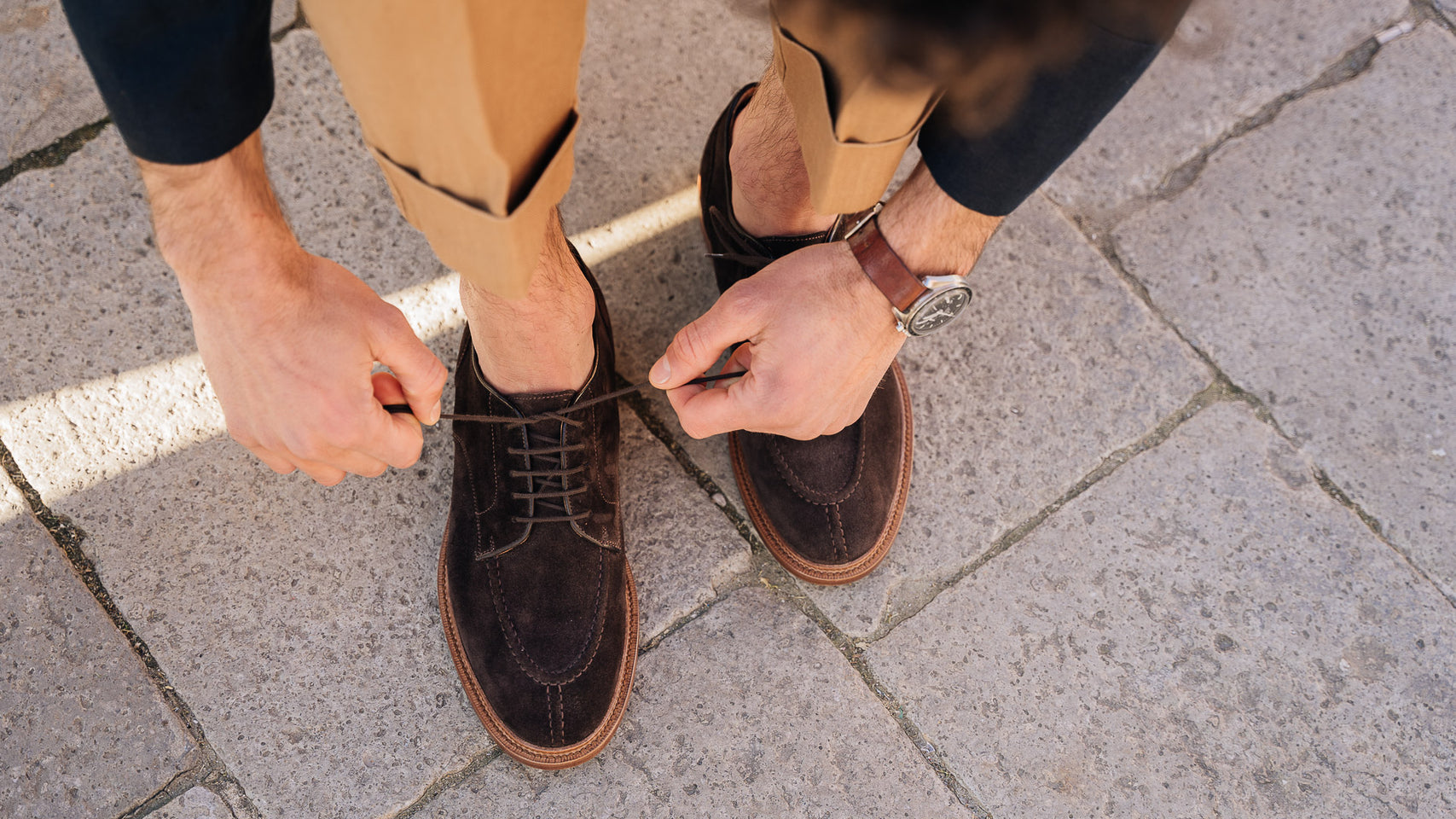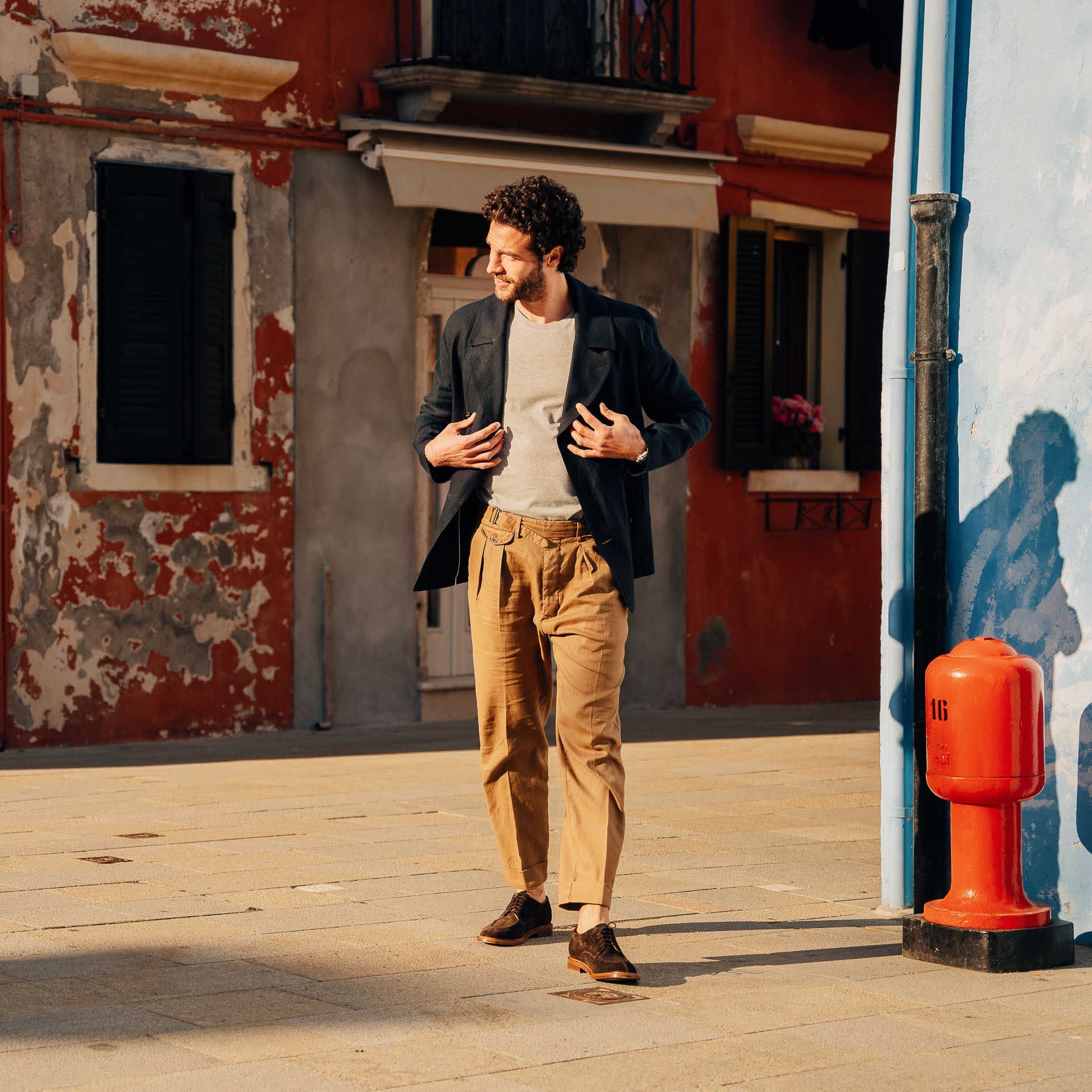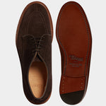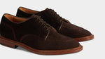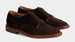 The summer Derby with stitched detail on the toe, in suede calfskin and lightweight leather sole. You can also wear it without socks, because the inside is unlined with a small leather reinforcement on the heel. You can wear it with a white T-shirt, a linen peacoat and trousers with double pleats.