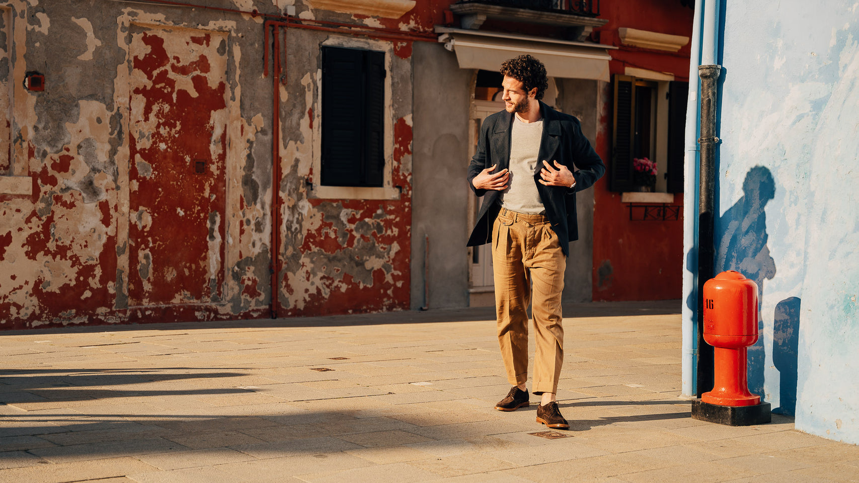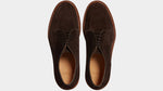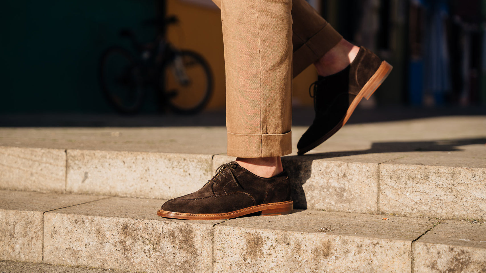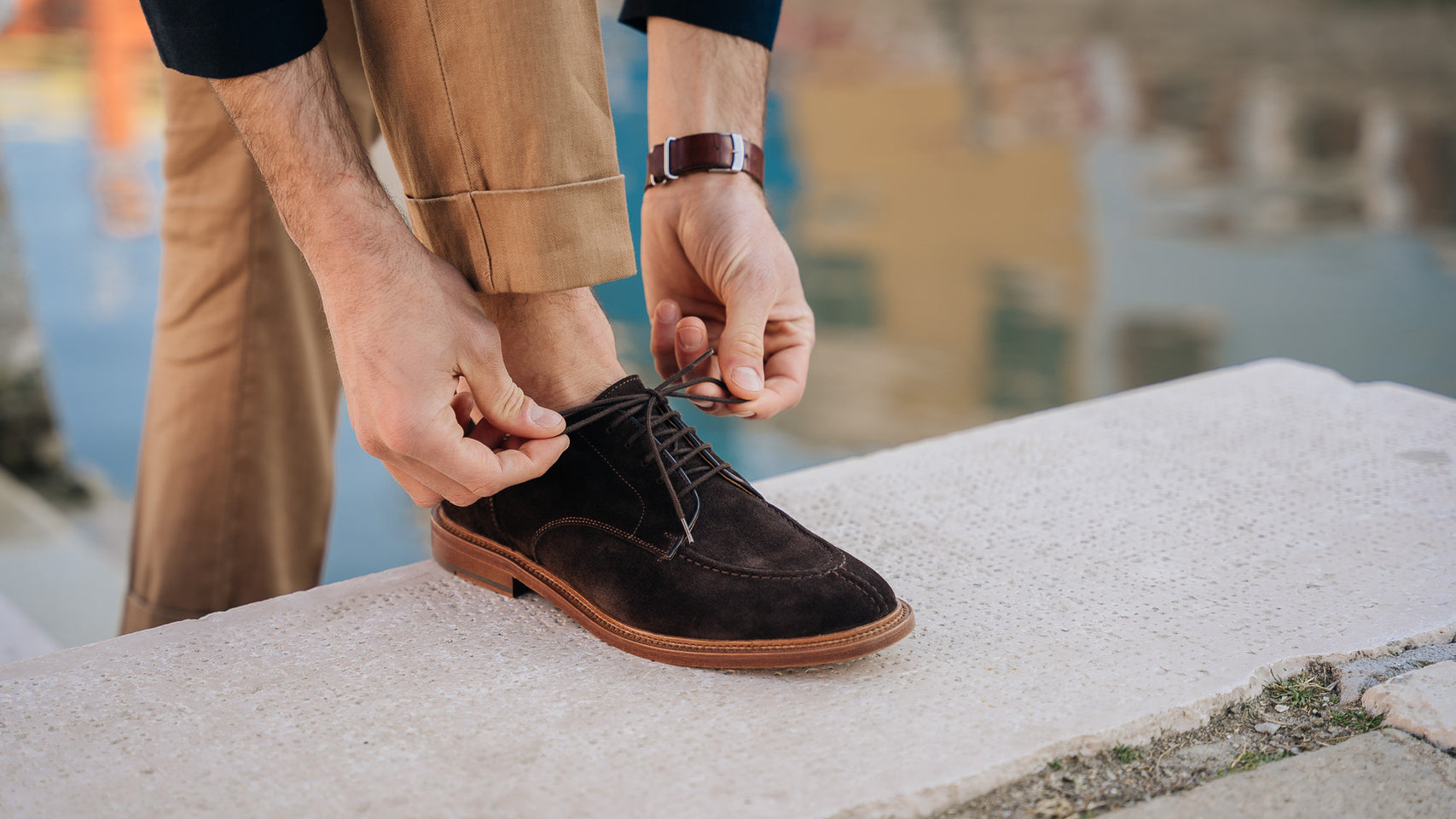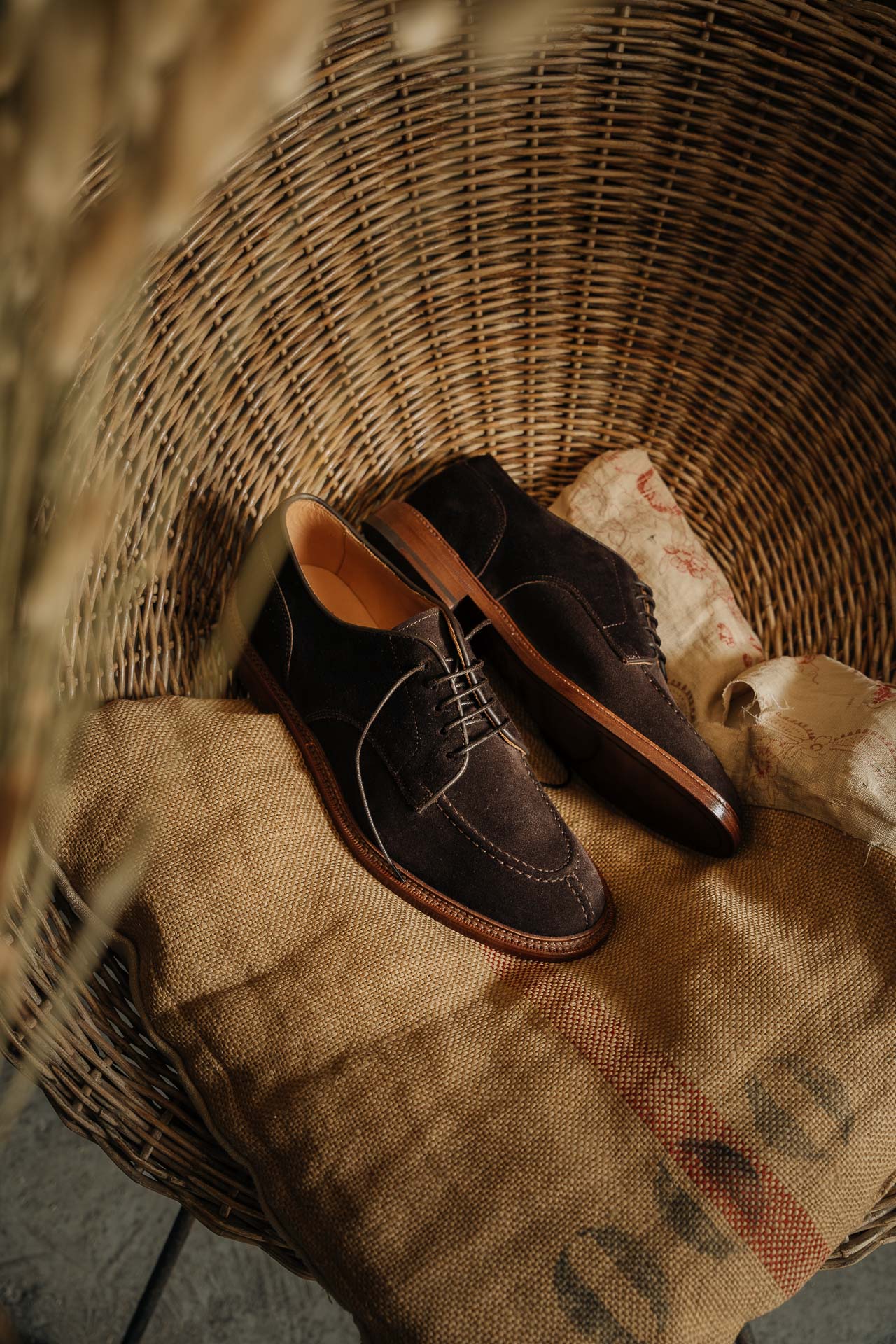 The summer Derby with stitched detail on the toe, in suede calfskin and lightweight leather sole. You can also wear it without socks, because the inside is unlined with a small leather reinforcement on the heel. You can wear it with a white T-shirt, a linen peacoat and trousers with double pleats.