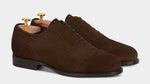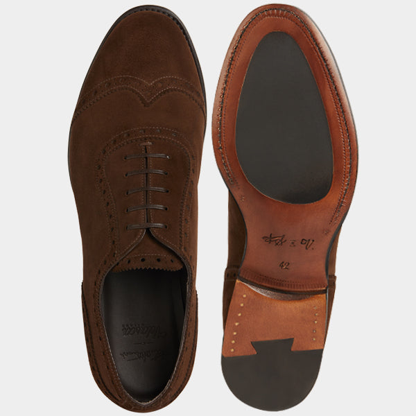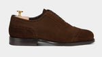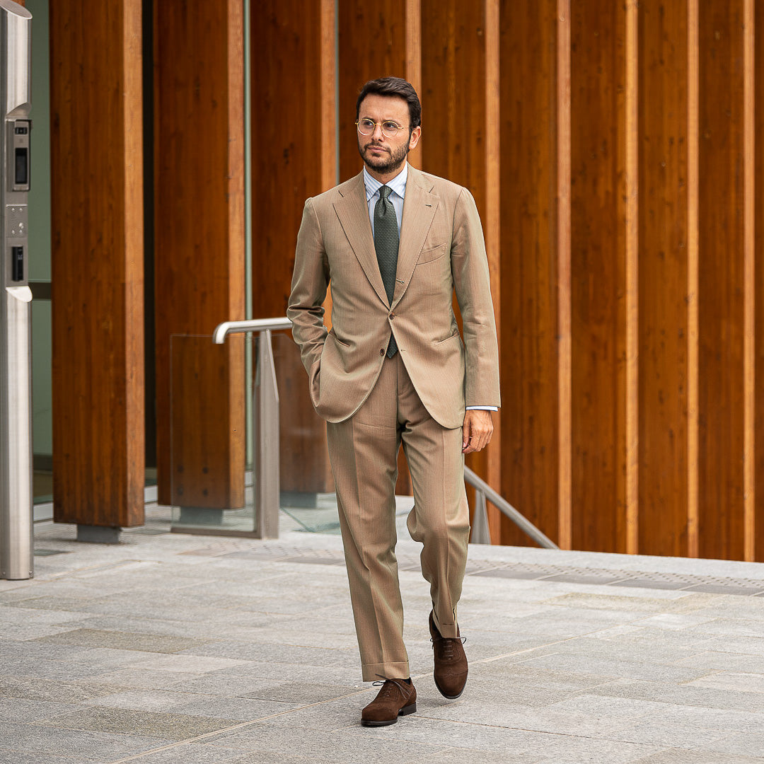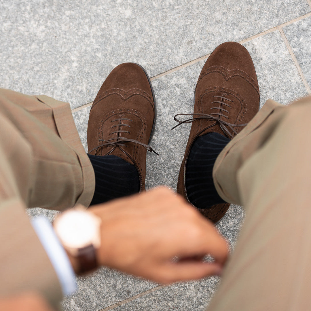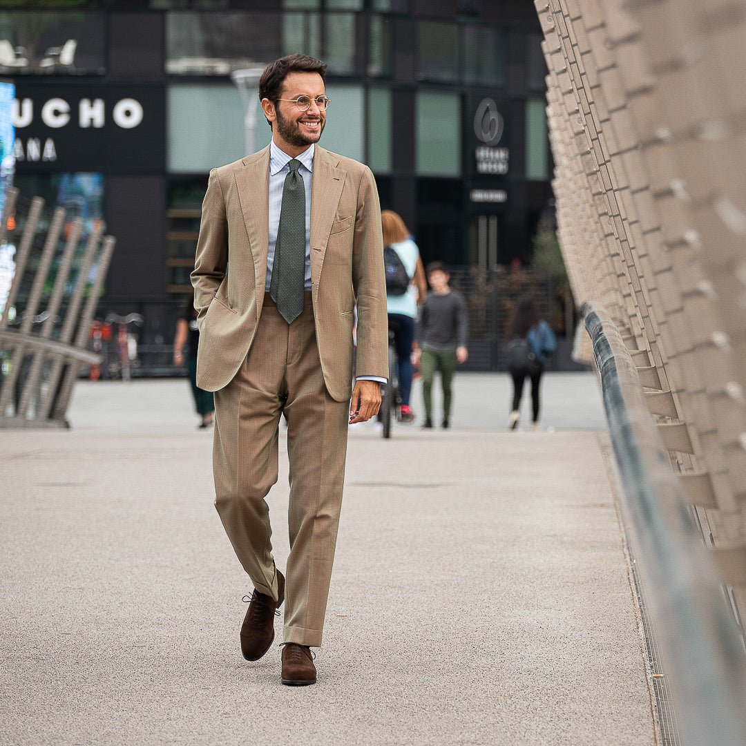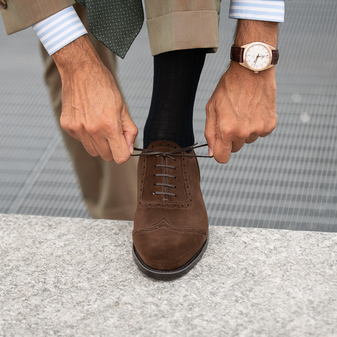 The suede with swallow-tail detail designed by Fabio Attanasio for Velasca. Suede is made from the crust of calfskin (which is the softest layer) from English tanneries: it is silky-smooth when you touch it. The leather sole has a small rubber island so, together with the integrated sole, each step will be more comfortable. Wear them in the warm autumn sun, with an oxford shirt and a woolen blazer.